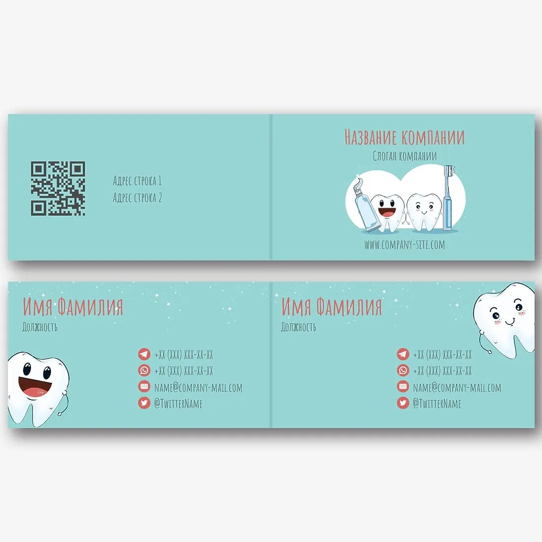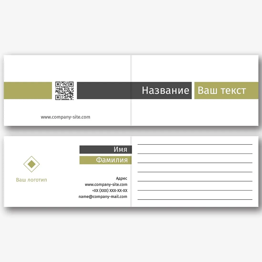 Интернет-типография Vizitka.com® производит полноцветную двустороннюю печать двойных визиток с размерами 180х50 мм (±1 мм) (горизонтальный вариант) и 100х90 мм (±1 мм) (вертикальный вариант).