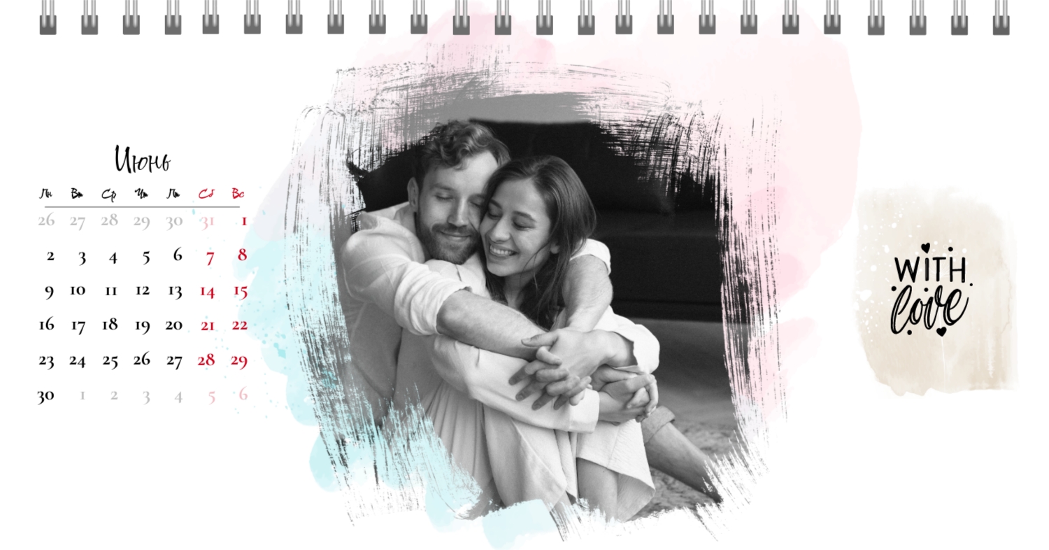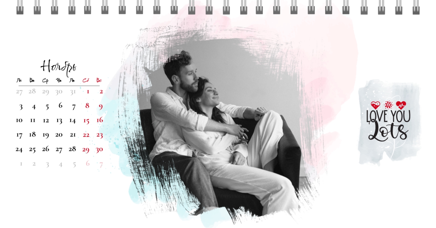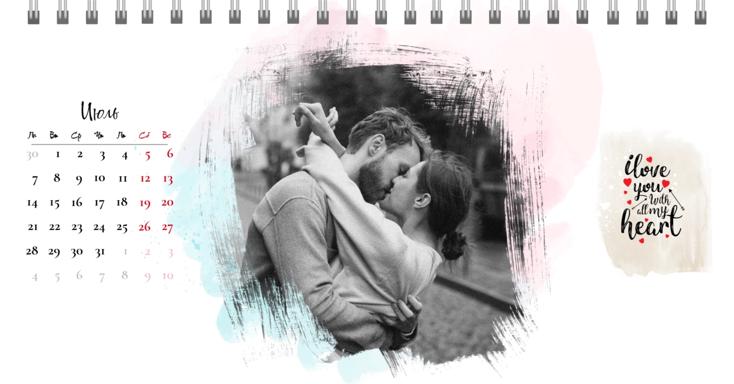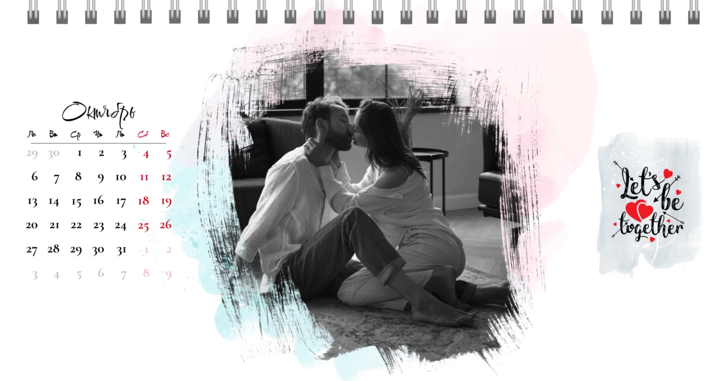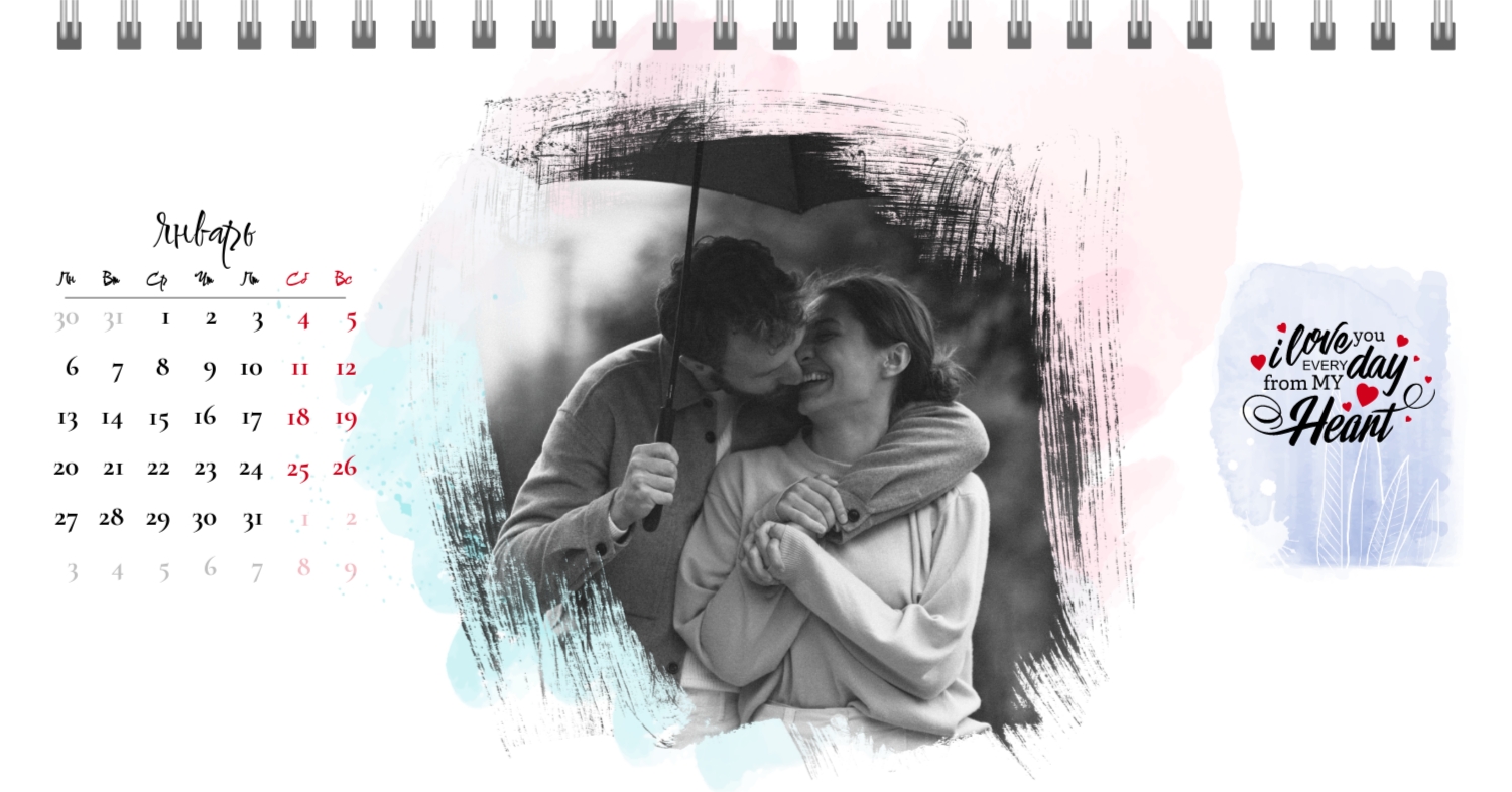 Бесплатный шаблон календаря c лучшими воспоминаниями влюбленной пары. Создайте макет своими руками в конструкторе календарей.