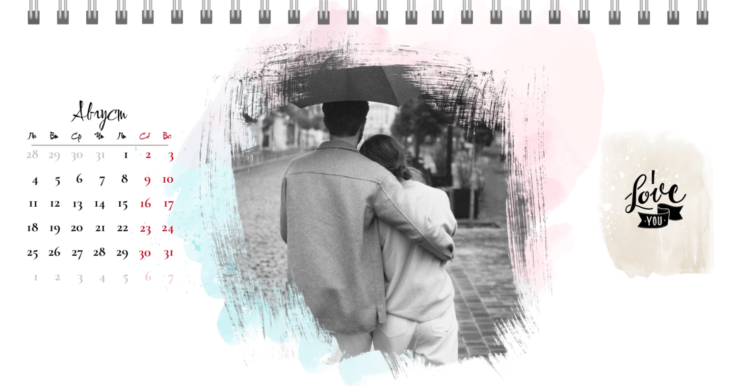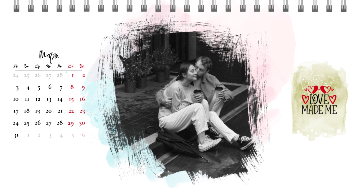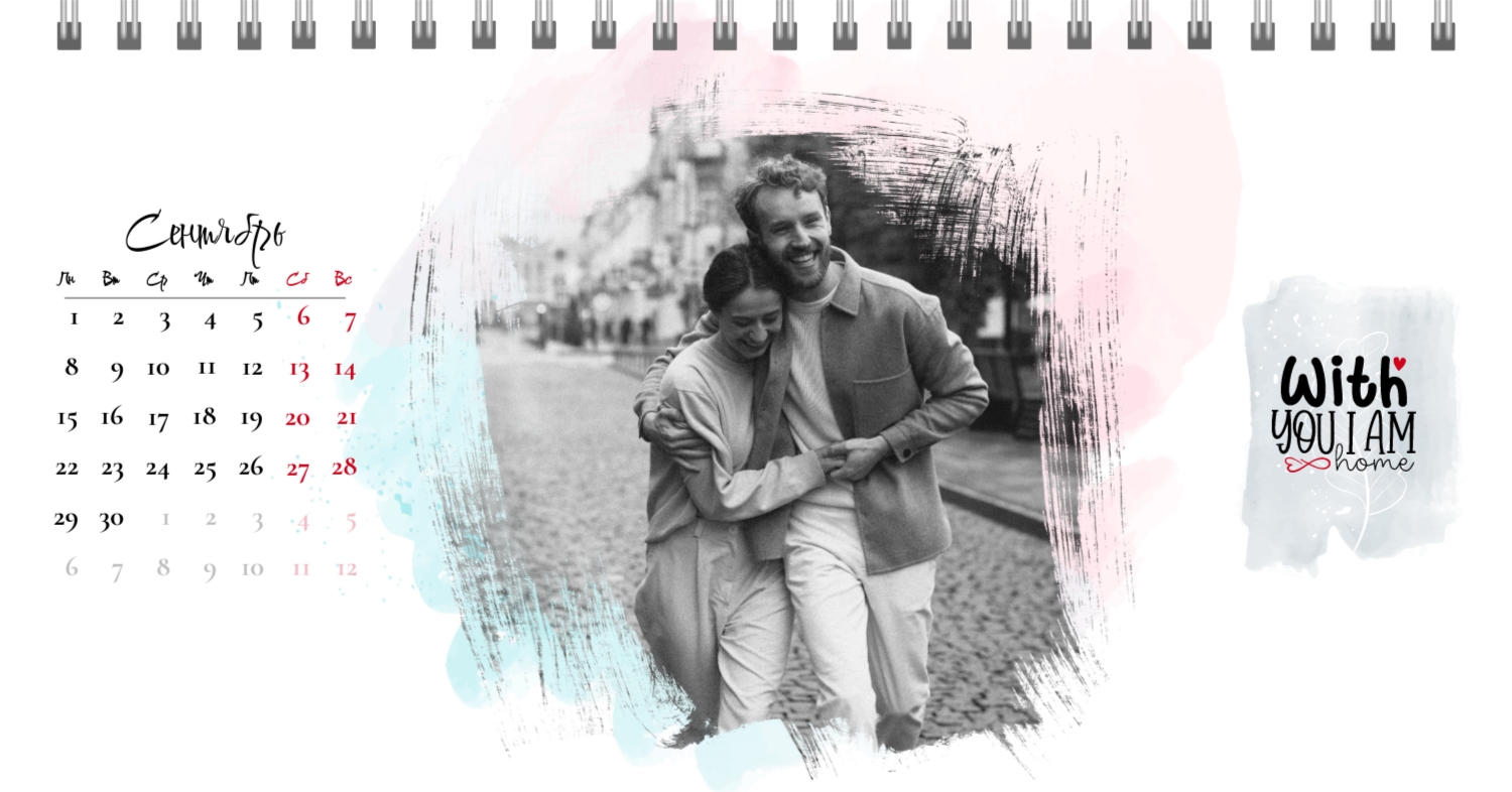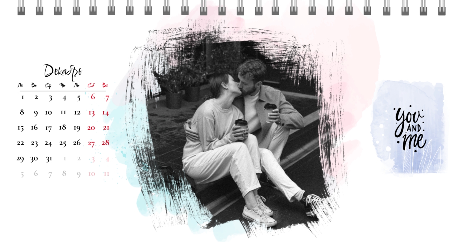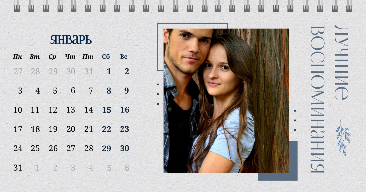 Бесплатный шаблон календаря c лучшими воспоминаниями влюбленной пары. Создайте макет своими руками в конструкторе календарей.