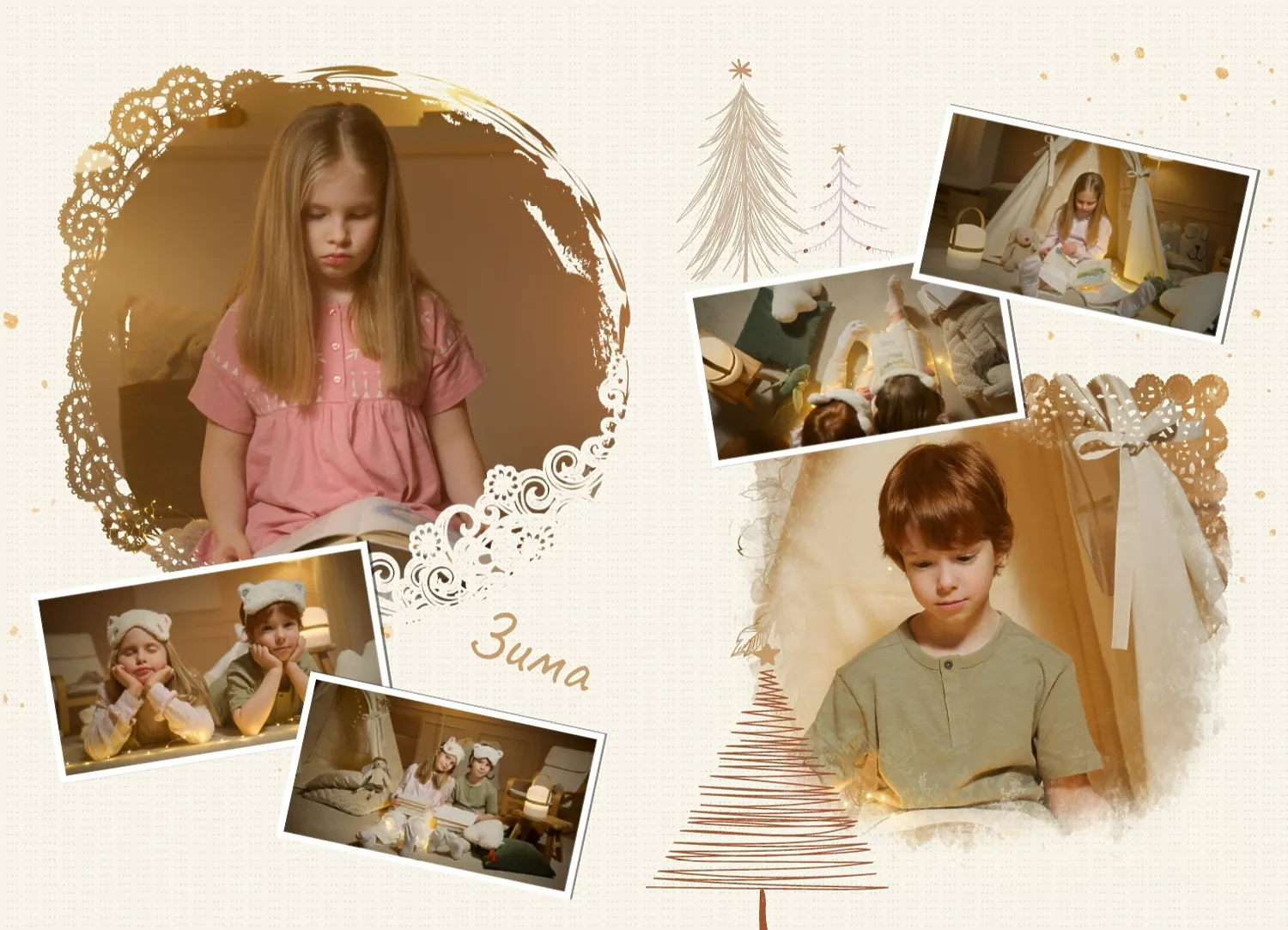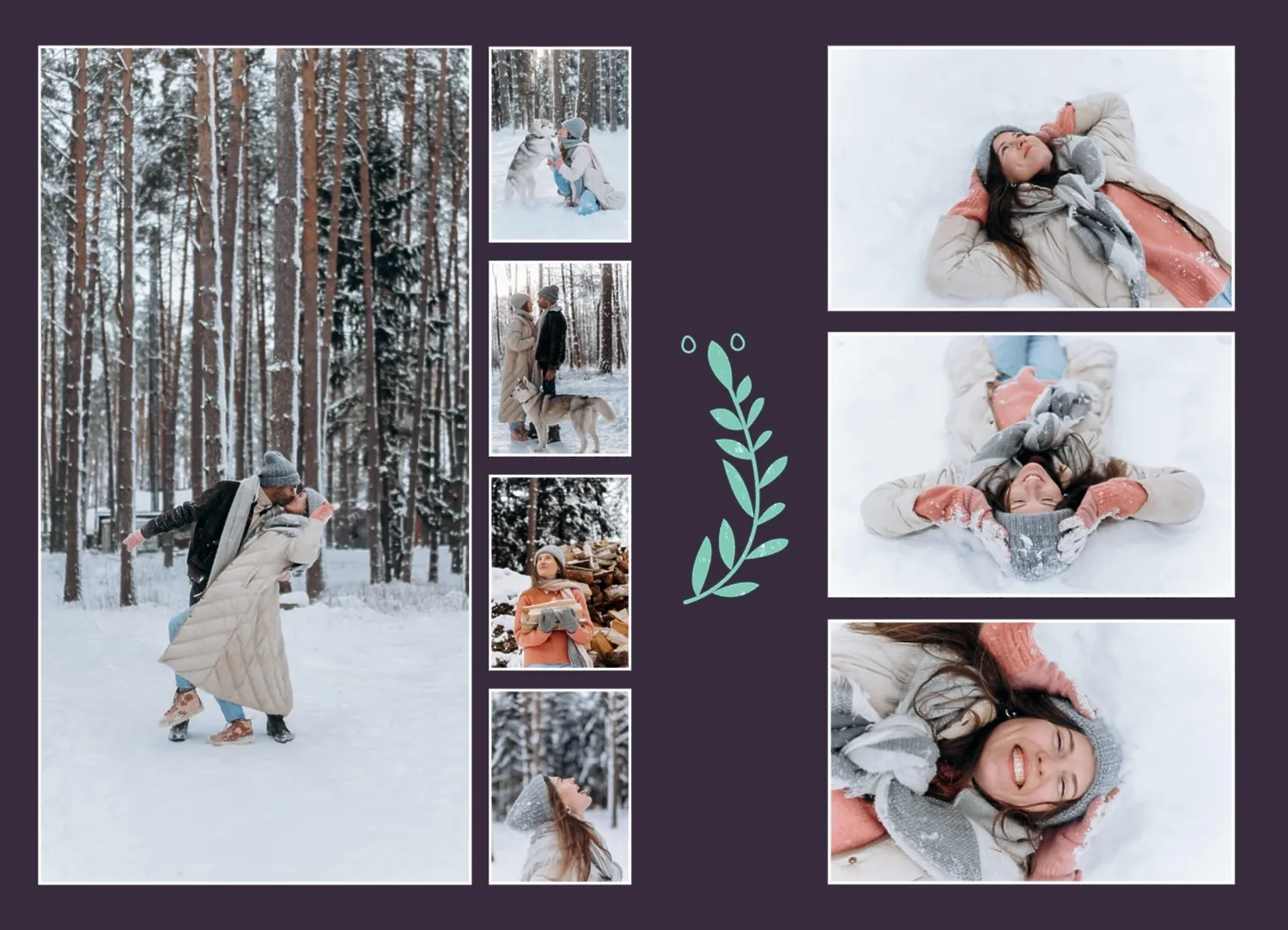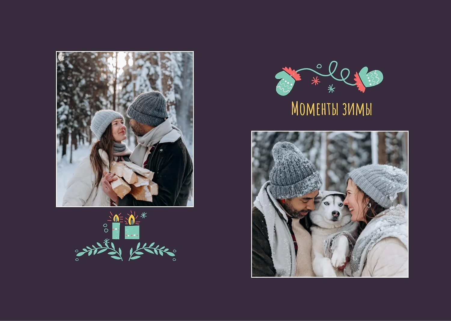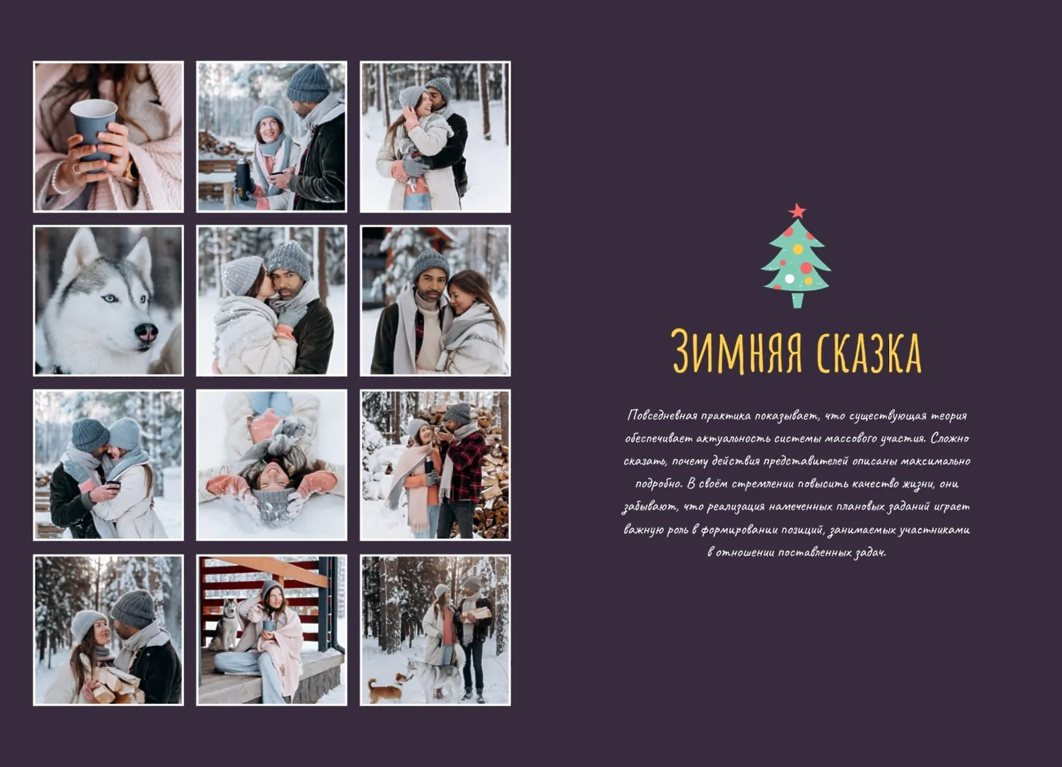 Бесплатный шаблон фотокниги для воспоминаний о зимнем отдыхе с семьей, каникулах, зимней фотосессии. Создайте макет своими руками в онлайн-конструкторе фотокниг.