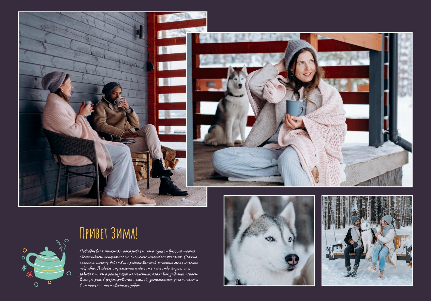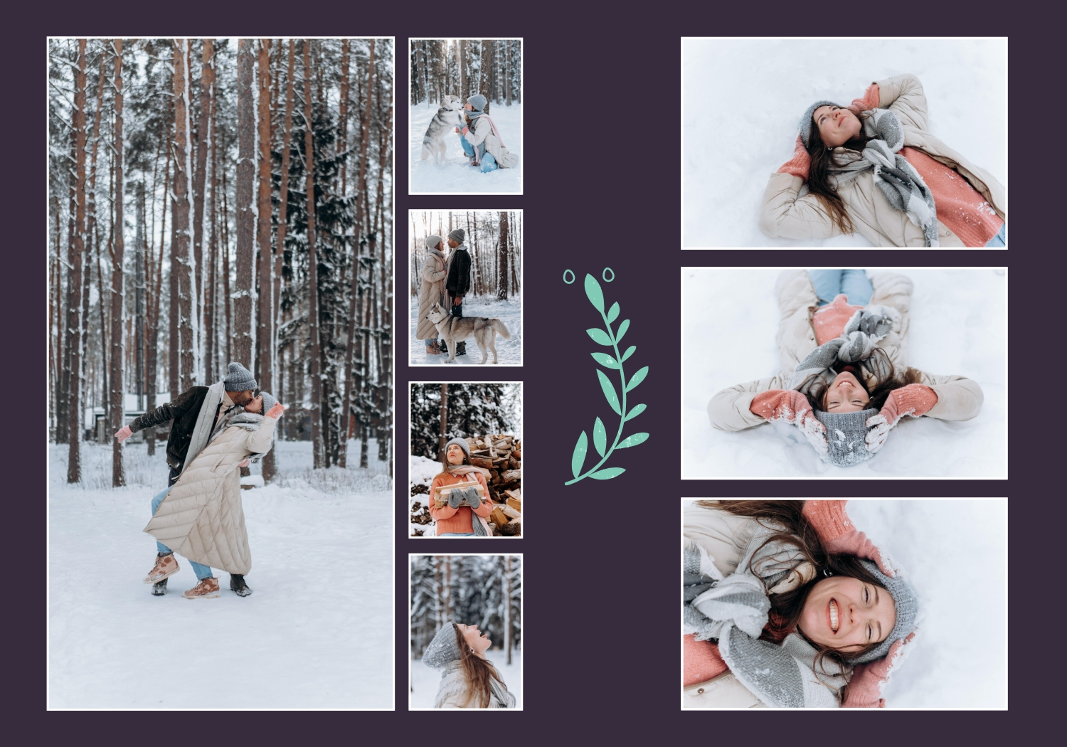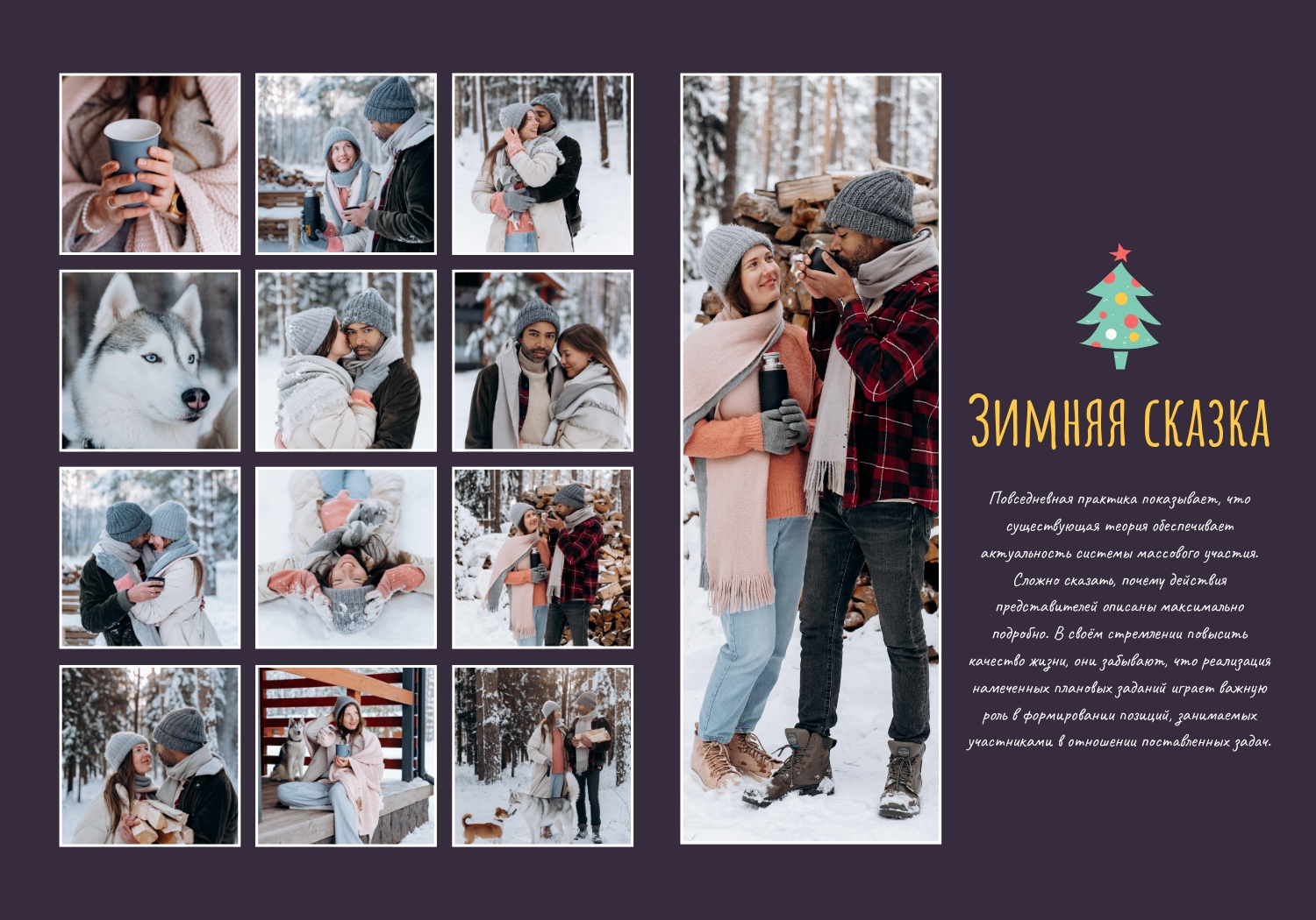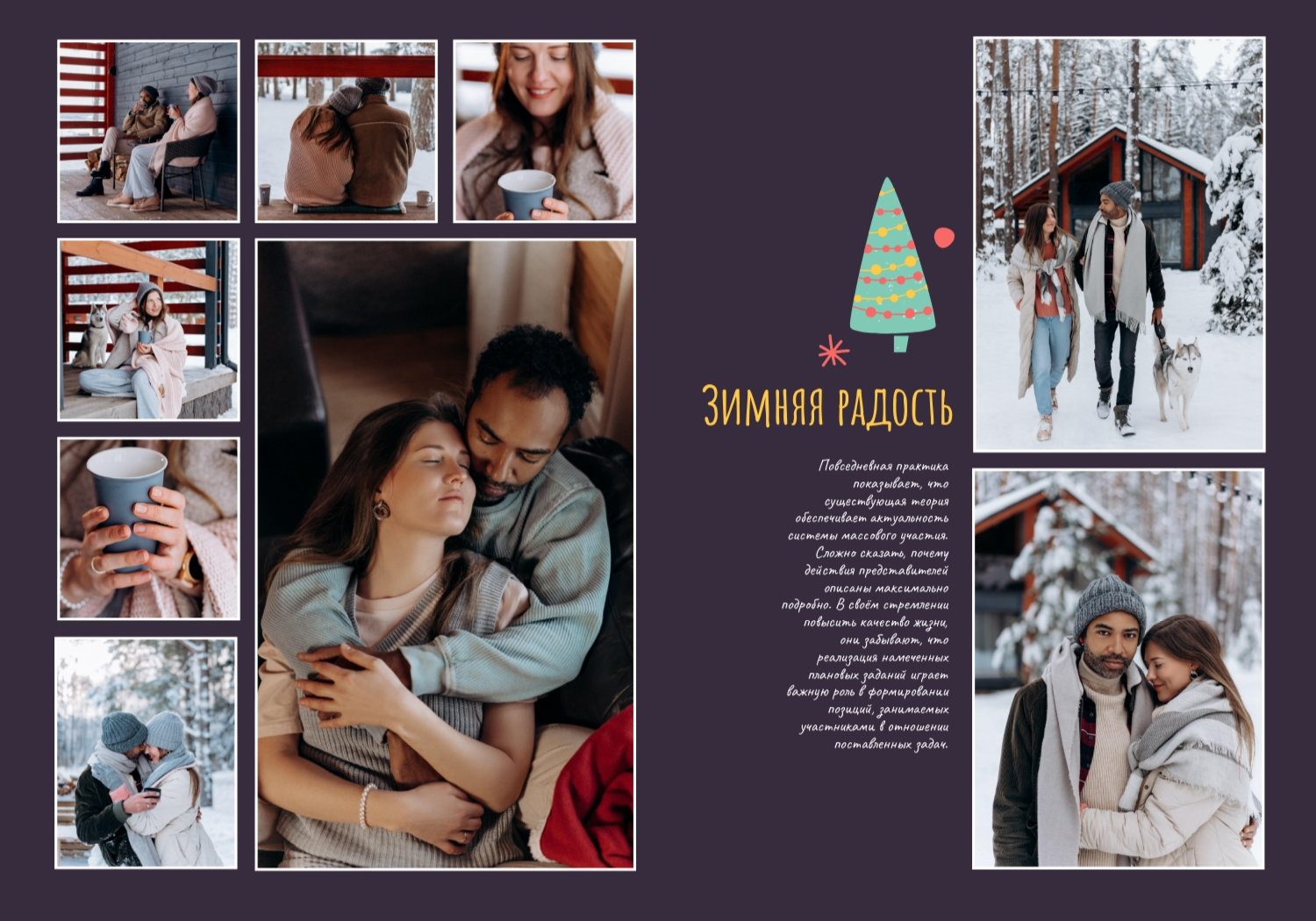 Бесплатный шаблон фотокниги для воспоминаний о зимнем отдыхе с семьей, каникулах, зимней фотосессии. Создайте макет своими руками в онлайн-конструкторе фотокниг.