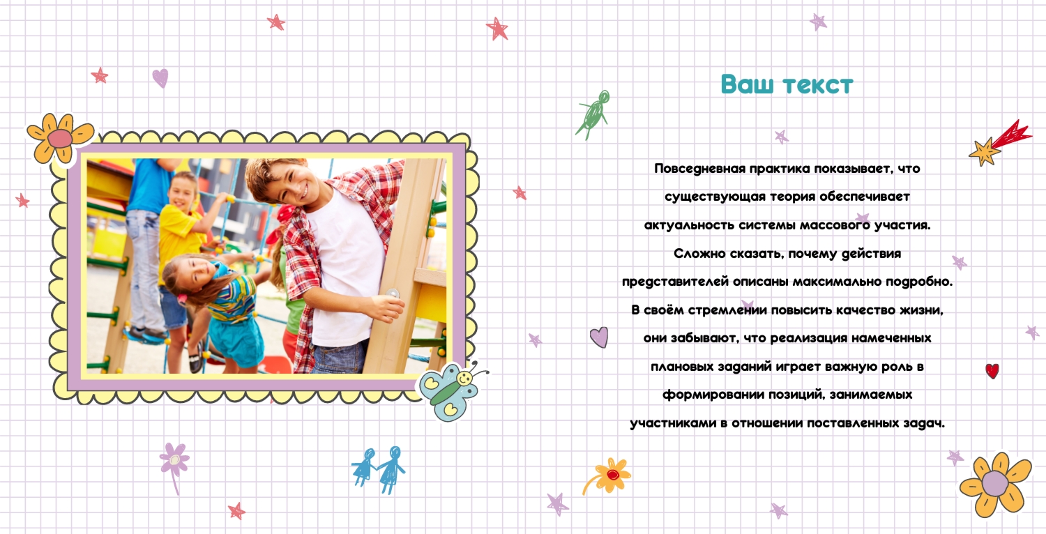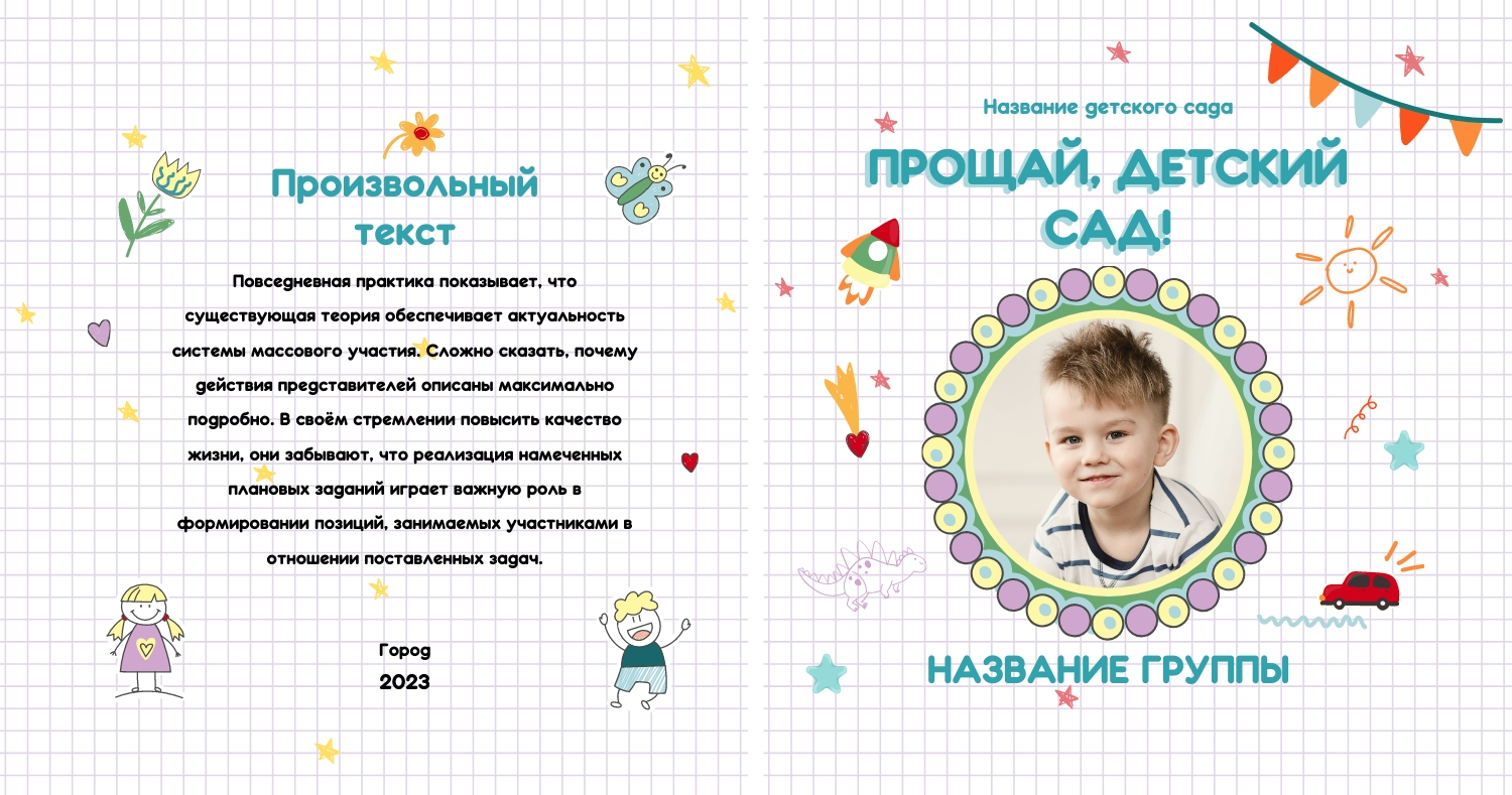 Шаблон фотокниги выпускника детского сада в твердом переплете представляет собой готовый макет для создания личного фотоальбома. Он разработан специально для тех, кто хочет сохранить воспоминания о том, как их малыш окончил детский сад. Шаблон состоит из нескольких разделов, которые можно заполнить фотографиями и текстом. Например, в нем есть возможность добавить фотографии со всеми друзьями ребенка из садика, а также с ним самим в различных ситуациях. Вы также можете включить даты, названия и другие детали мероприятий и игр, которые ваш ребенок посещал во время учебы в детском саду. Выбрав шаблон фотокниги выпускника детского сада в онлайн-конструкторе, вы сможете легко и быстро создать свой собственный уникальный фотоальбом. Конструктор предоставляет удобный интерфейс для добавления фотографий, изменения их размера, расположения, а также добавления текста. Вы также можете использовать различные шрифты и цвета, чтобы придать вашему фотоальбому особый стиль. Использовать шаблон фотокниги выпускника детского сада в твердом переплете - отличный способ сохранить один из самых важных моментов детства вашего ребенка.