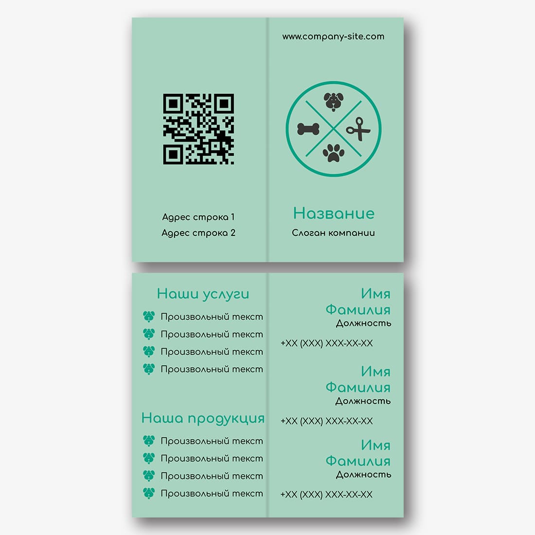 Бесплатный шаблон двойной визитки для ветклиники, ветеринарного центра, ветеринара. Создайте макет своими руками в конструкторе визиток.