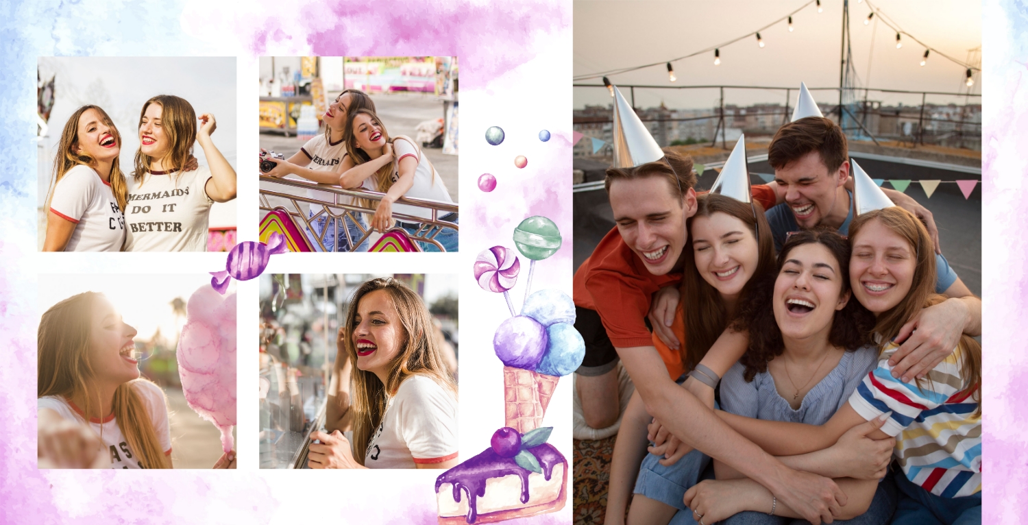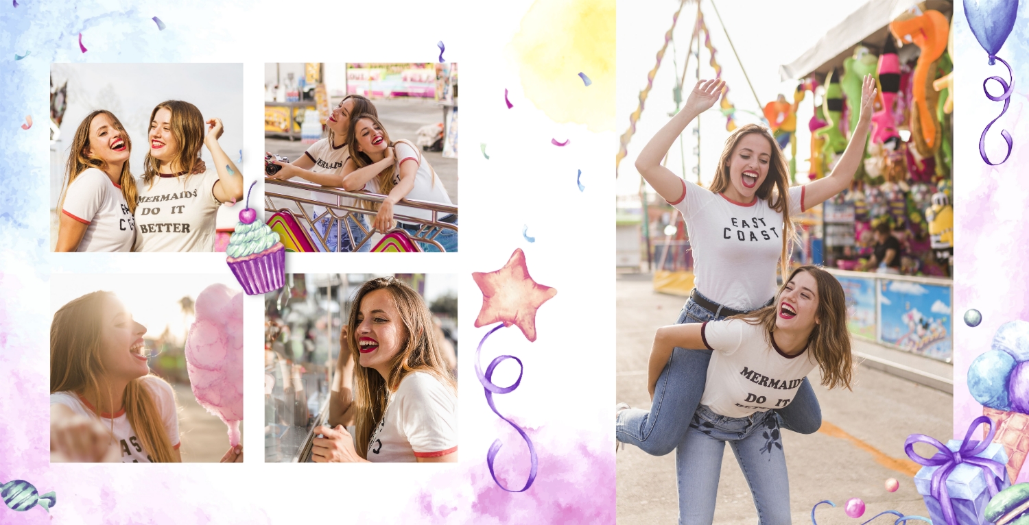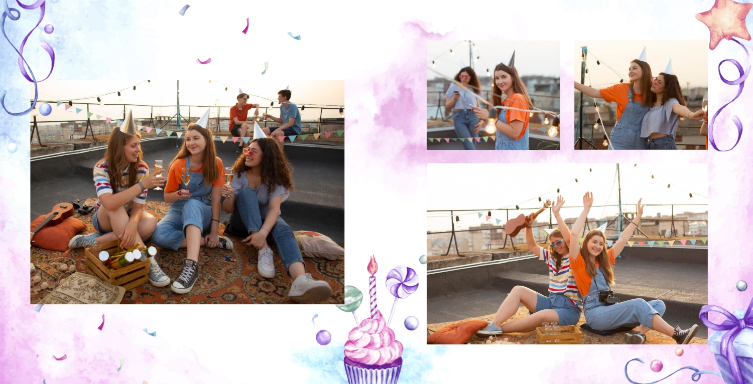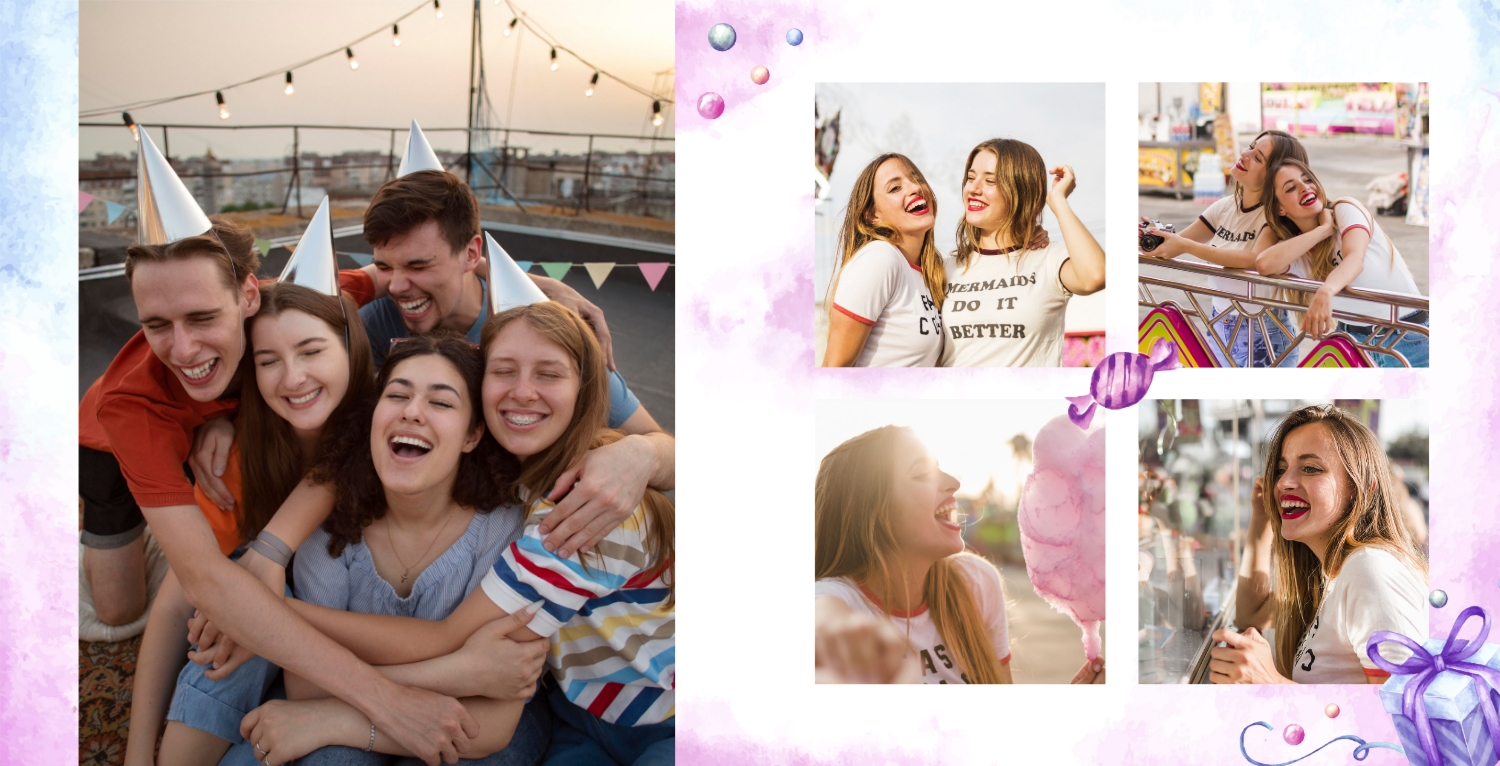 Шаблон фотокниги для детских фотографий на день рождения, оформленный в стиле принцессы, очень милый и волшебный. Этот шаблон поможет создать уникальный альбом в честь дня рождения вашей маленькой принцессы. Обложка фотокниги оформлена в стиле принцессы, с изображением девочки в роли принцессы, а также с использованием розовых, фиолетовых и других нежных цветов. Используйте страницы для добавления цитат о принцессах, счастье и любви к вашей дочери. Вы также можете писать поздравления и пожелания на страницах с фотографиями. Используя такой панорамный квадратный шаблон для фотокниги в твердой обложке, вы сможете легко создать волшебный и милый фотоальбом, который будет долгие годы напоминать вам о счастливом дне рождения вашей дочери. Онлайн-конструктор предоставляет возможность настраивать шаблон и добавлять свои фотографии и тексты, чтобы сделать альбом уникальным и особенным.