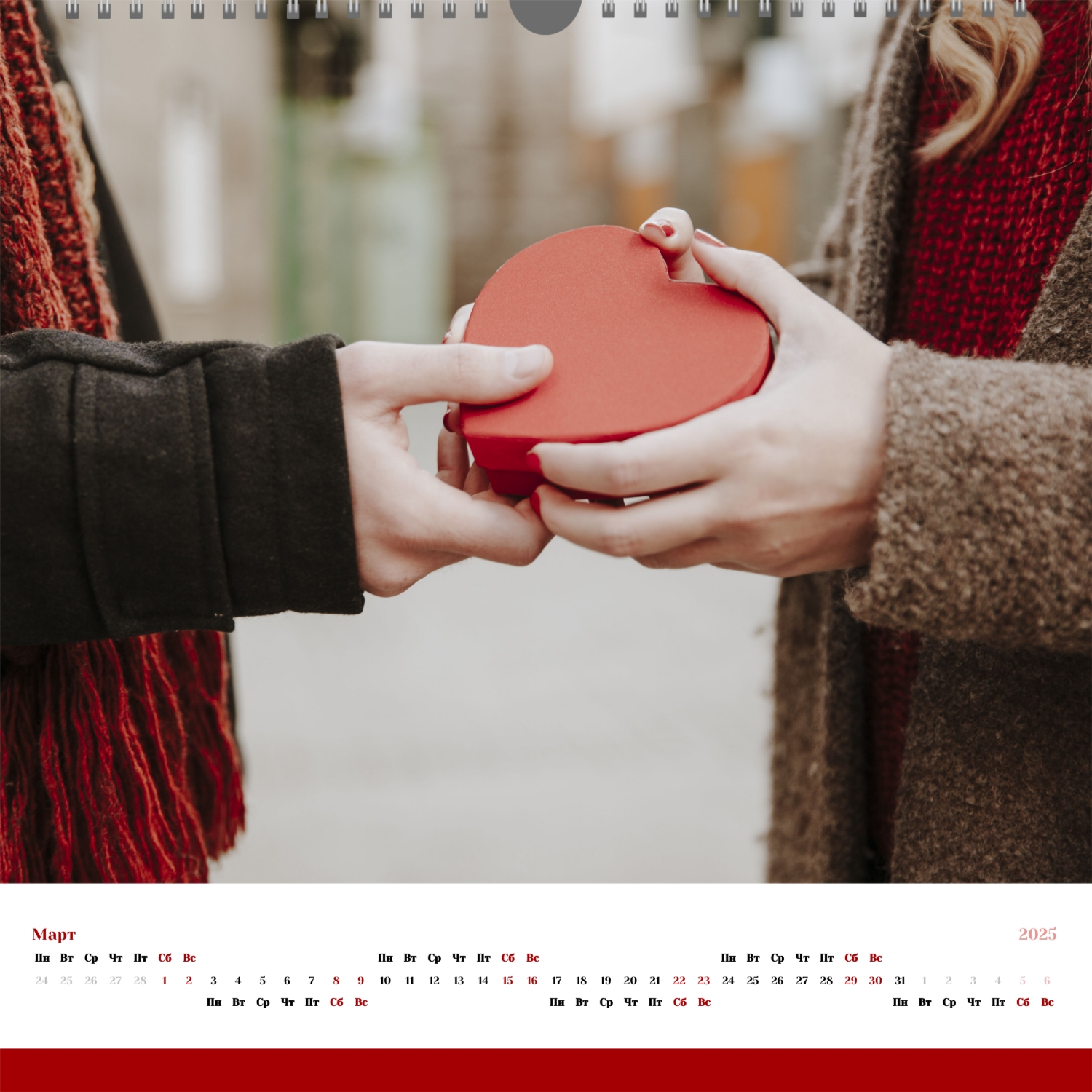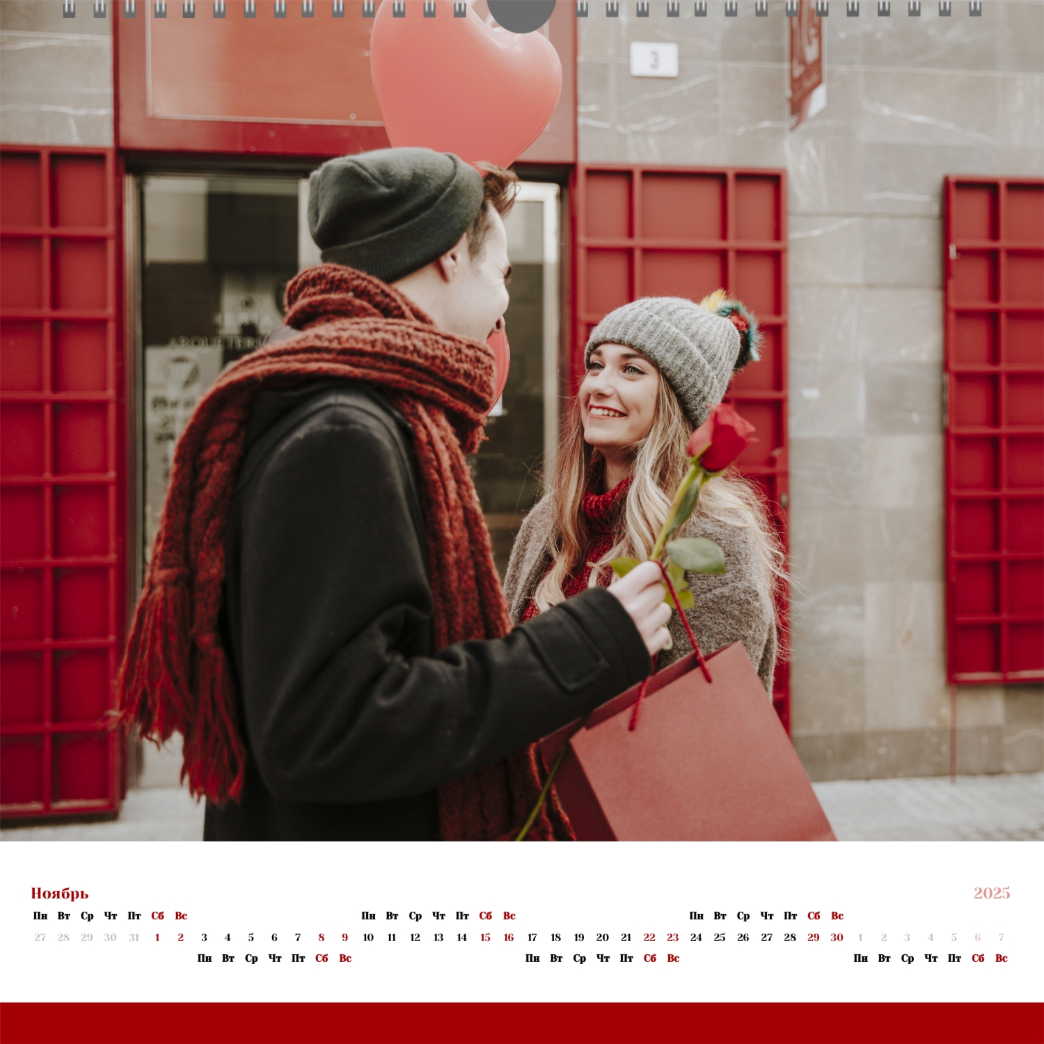 Волшебство зимы превращено в элегантный шаблон настенного квадратного календаря "Счастливая Зима", созданный специально для влюбленных. В этом уникальном дизайне сочетаются нежные оттенки зимнего сияния и теплые ноты любви. Он призван стать не только практичным инструментом учета времени, но и нежным напоминанием о ваших самых важных днях. Используйте разнообразные элементы декора, встроенные в конструктор, чтобы подчеркнуть атмосферу сезона. Специальные разделы для важных дат и событий позволяют отмечать важные моменты вашей истории влюбленности. Здесь могут быть дни знаковых встреч, дни поцелуев под метелями или просто моменты, которые стали ключевыми в вашей жизни вдвоем. Легкость редактирования в нашем онлайн-конструкторе позволяет вам выразить свои чувства и создать календарь, который станет отражением вашей уникальной любви.