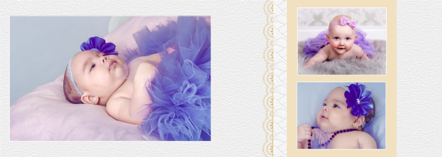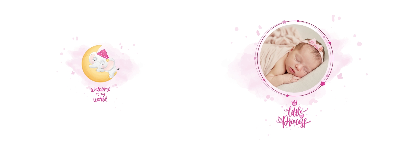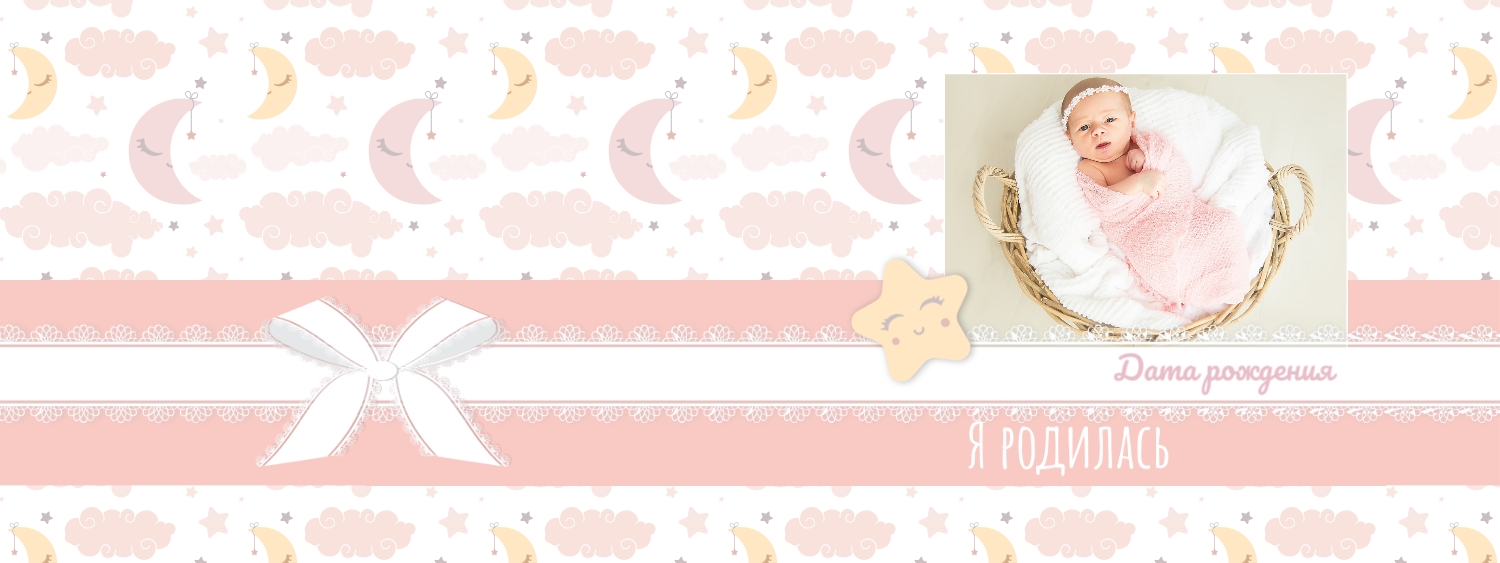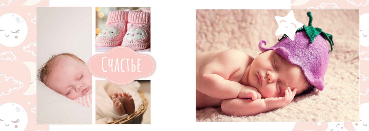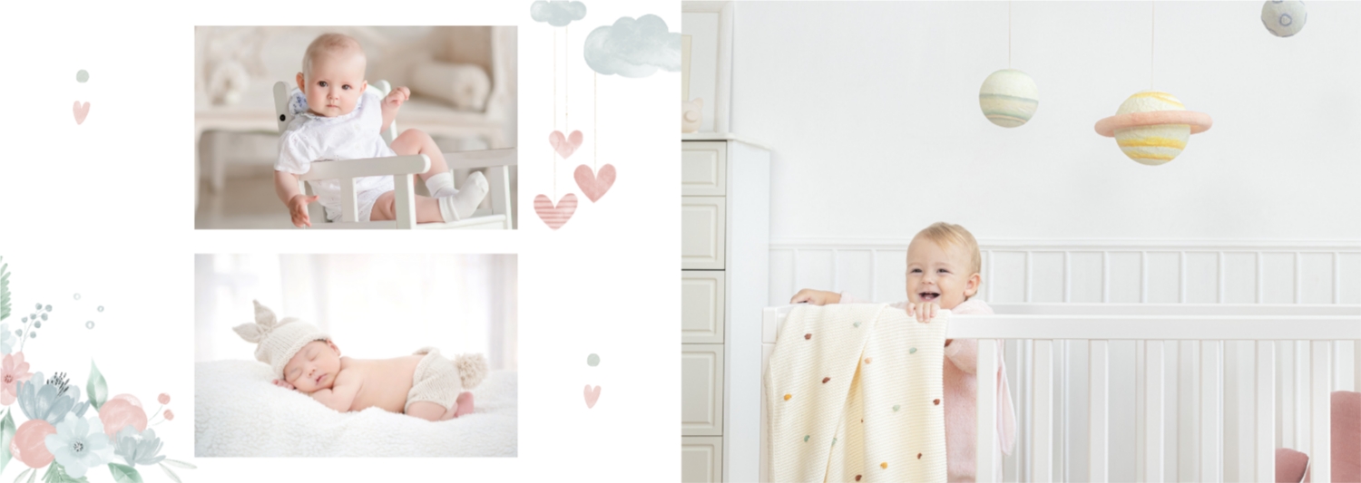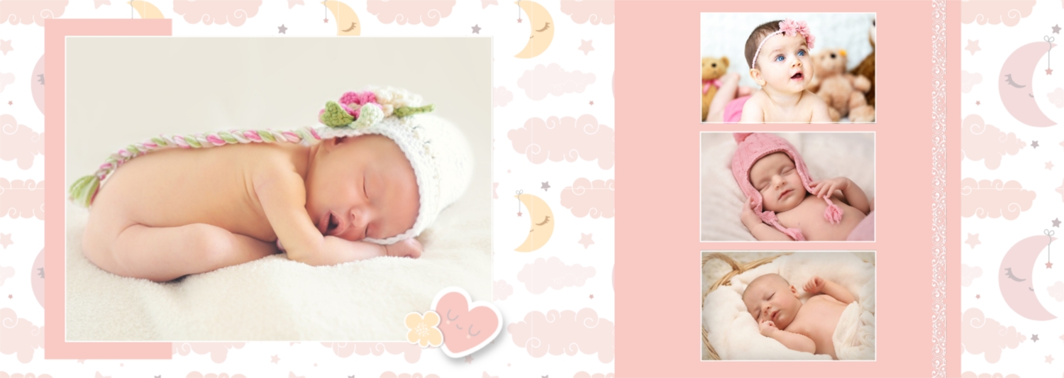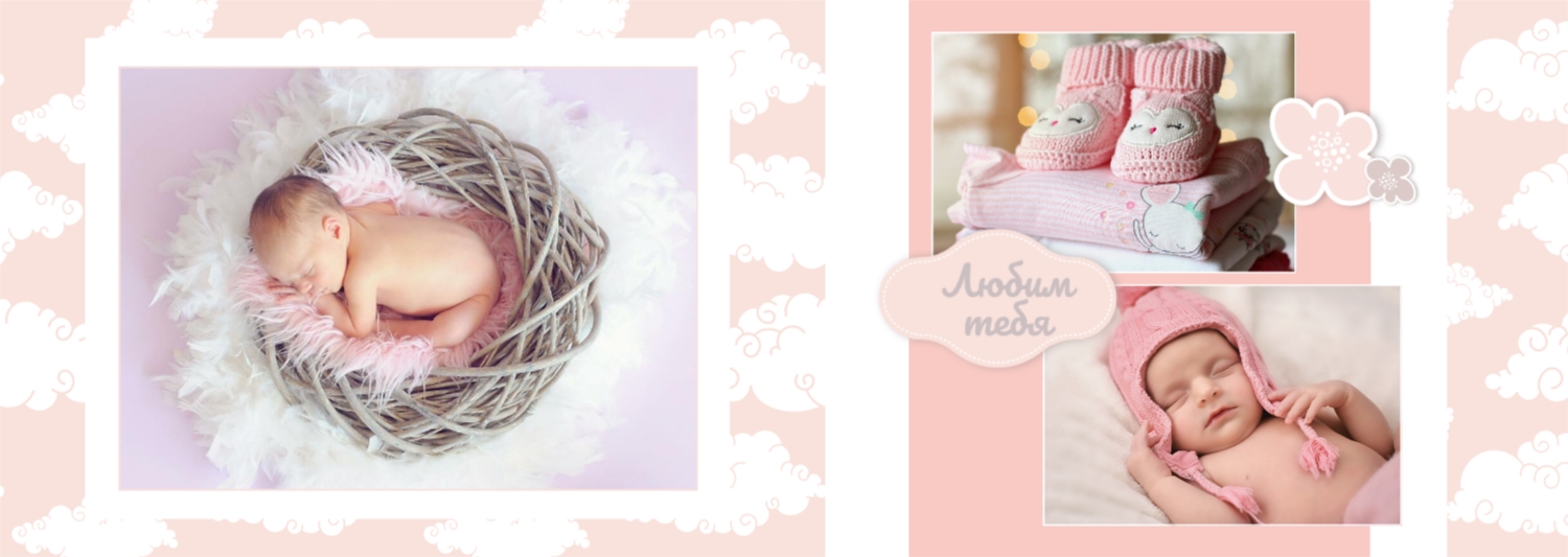 Бесплатный шаблон детской фотокниги для новорожденной девочки. Создайте макет своими руками в онлайн-конструкторе фотокниг.