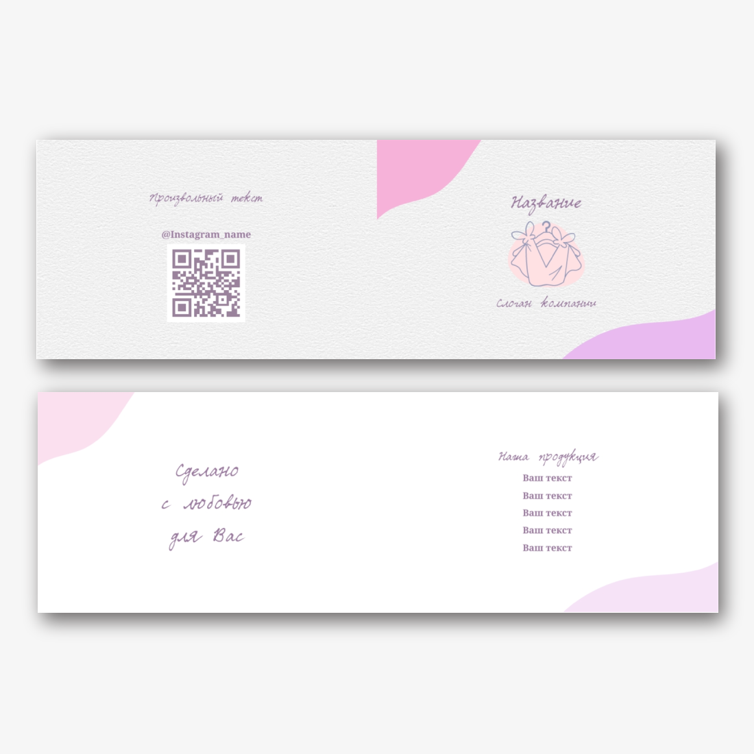Бирка-книжка для одежды — это универсальный инструмент, который подходит для различных профессионалов и сфер деятельности. Она используется как в мелком розничном бизнесе, так и в крупных производственных компаниях. Этот шаблон позволяет создать уникальные бирки-книжки, которые не только информируют о продукте, но и способствуют узнаваемости бренда. Онлайн-конструктор предоставляет широкие возможности для редактирования. Вы можете настроить дизайн в соответствии с корпоративным стилем вашей компании: выбрать цвета, шрифты, добавить логотип или изображение, включить контактную информацию или дополнительные данные о продукте. Использование онлайн-конструктора делает процесс создания бирки-книжки простым и доступным. Вы можете самостоятельно контролировать каждый аспект дизайна, а также моментально видеть результаты в реальном времени, что экономит время и упрощает процесс разработки. Таким образом, шаблон длинной бирки-книжки для одежды в онлайн-конструкторе представляет собой идеальное решение для тех, кто ценит индивидуальность и качество в каждой детали продукции.