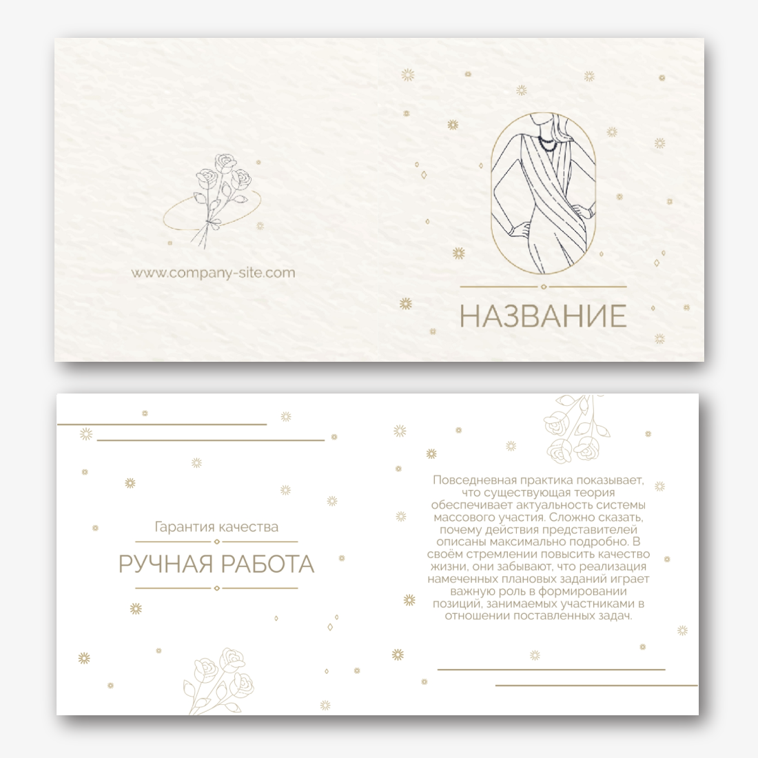 Готовый шаблон квадратной бирки-книжки для одежды – это идеальный инструмент для тех, кто стремится добавить индивидуальность и профессионализм в свою продукцию. Этот шаблон прекрасно подходит для дизайнеров одежды, модельеров, владельцев бутиков, а также для всех, кто занимается пошивом и продажей текстильных изделий. Бирка-книжка представляет собой миниатюрный буклет, который может содержать информацию о бренде, инструкции по уходу, состав ткани и другие важные сведения для клиентов. В нашем онлайн-конструкторе пользователи могут создавать уникальные квадратные бирки-книжки своими руками, полностью адаптируя их под свои потребности и стиль бренда. В онлайн-конструкторе вы можете изменять текст, добавлять логотипы, выбирать шрифты и их размер, а также использовать различные цветовые схемы.