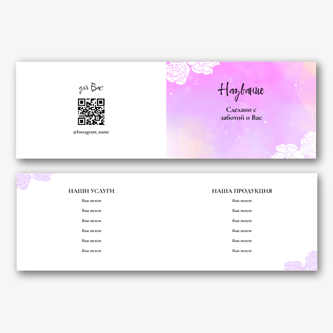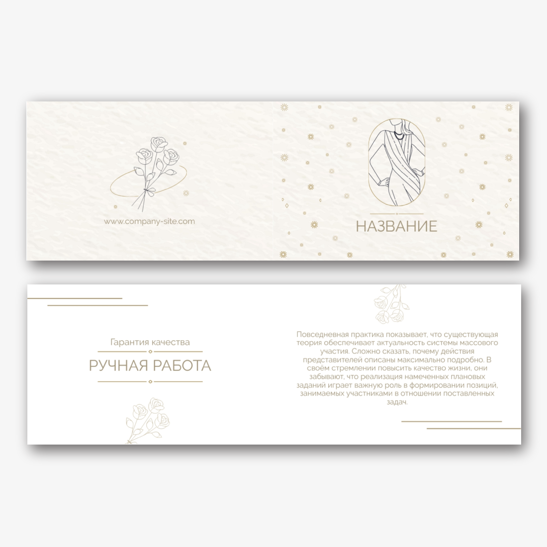 Готовый шаблон бирки-книжки для одежды – это идеальный инструмент для тех, кто стремится добавить индивидуальность и профессионализм в свою продукцию. Этот шаблон прекрасно подходит для дизайнеров одежды, модельеров, владельцев бутиков, а также для всех, кто занимается пошивом и продажей текстильных изделий. Бирка-книжка представляет собой миниатюрный буклет, который может содержать информацию о бренде, инструкции по уходу, состав ткани и другие важные сведения для клиентов. В нашем онлайн-конструкторе пользователи могут создавать уникальные длинные бирки-книжки своими руками, полностью адаптируя их под свои потребности и стиль бренда. В онлайн-конструкторе вы можете изменять текст, добавлять логотипы, выбирать шрифты и их размер, а также использовать различные цветовые схемы. Дополнительно можно вставить фотографии, рисунки и другие графические элементы, что позволяет сделать горизонтальную бирку не только информативной, но и визуально привлекательной.