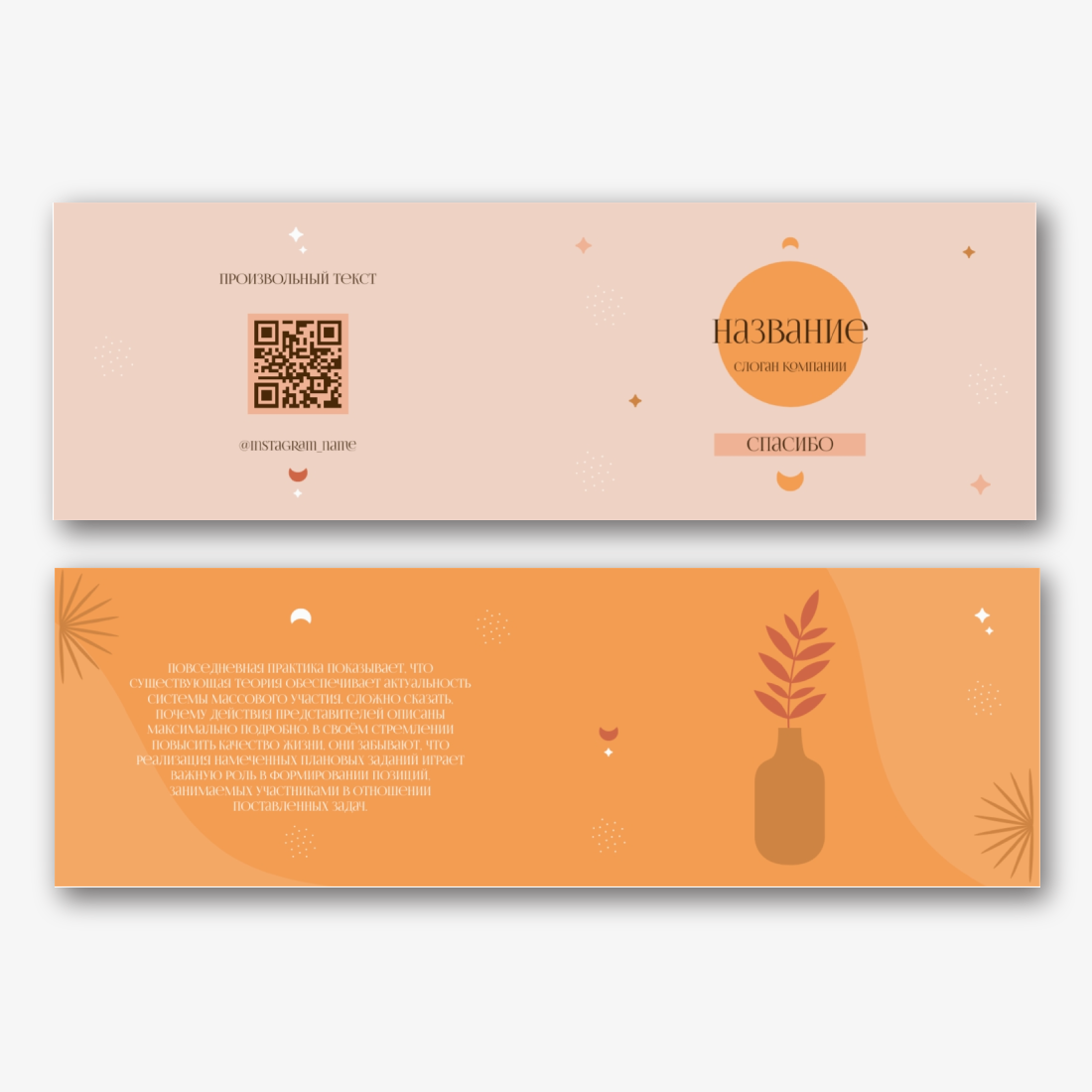 Готовый шаблон бирки-книжки с цветами — это прекрасное решение для тех, кто ценит эстетичный дизайн и практичность. Бирка-книжка украшена нежными цветочными мотивами, которые создают атмосферу легкости и изысканности. Такой шаблон подойдет для различных профессионалов и сфер деятельности, включая флористов, дизайнеров, мастеров ручной работы и продавцов бутиков. Флористы могут использовать этот шаблон для оформления своих композиций и букетов, добавляя индивидуальные бирки с информацией о цветах, рекомендациями по уходу или личными поздравлениями для клиентов. Одним из главных преимуществ этого шаблона является возможность его полной персонализации в нашем онлайн-конструкторе. Интуитивно понятный интерфейс позволяет легко изменить текст, выбрать подходящий шрифт, добавить логотип или графические элементы. Вы можете адаптировать цветовую гамму и стилистику под конкретные нужды, чтобы бирка-книжка идеально соответствовала вашему бренду и стилю. Создание уникальной горизонтальной бирки-книжки своими руками становится простым и увлекательным процессом благодаря нашему онлайн-конструктору. Вы можете экспериментировать с различными элементами дизайна, чтобы получить именно тот результат, который соответствует вашим ожиданиям. В результате, вы получите профессионально оформленную длинную бирку-книжку, которая подчеркнет индивидуальность вашего продукта и создаст положительное впечатление у клиентов.