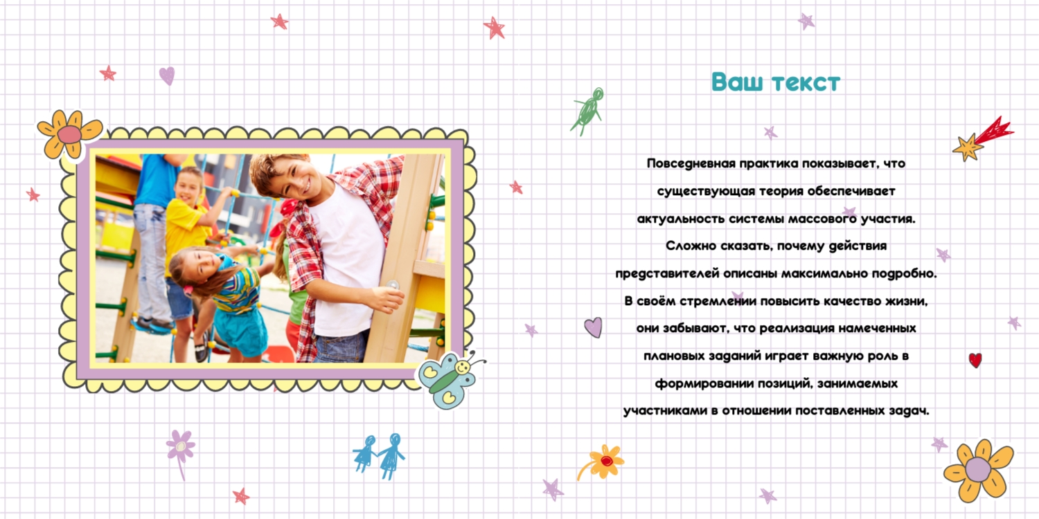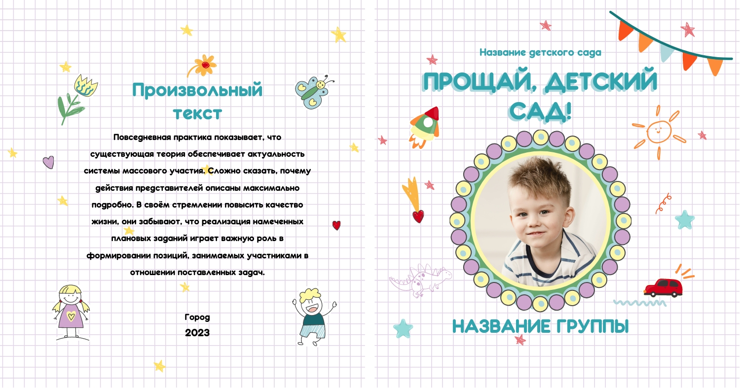 Шаблон фотокниги "Прощай, детский сад!" — это готовое решение, которое помогает сохранить важные моменты из детского сада в стильной и качественной фотокниге. Он разработан специально для того, чтобы родители могли легко собрать лучшие фотографии, создавая трогательную историю выпускного в детском саду. Основное преимущество этого шаблона — возможность редактирования в нашем онлайн-конструкторе, что позволяет каждому создать уникальный дизайн, отражающий особую атмосферу и эмоции. Редактирование в онлайн-конструкторе — это возможность настроить каждый элемент шаблона, включая фон, рамки, расположение фотографий и тексты. Вы можете добавить или удалить страницы, изменить цветовую гамму или вставить личные надписи с пожеланиями для воспитателей и детей. Это особенно полезно для фотографов и дизайнеров, работающих с детскими мероприятиями, так как позволяет предлагать клиентам оригинальные и персонализированные варианты. Также шаблон будет интересен педагогам, воспитателям и организаторам детских праздников, которые могут самостоятельно создать памятные подарки для выпускников и их родителей. Для профессионалов, таких как фотографы, работающие на выпускных мероприятиях, этот шаблон станет удобным инструментом для быстрого создания фотокниг под ключ. А родителям он предоставляет возможность проявить свою креативность и создать действительно уникальный альбом, вложив в него частичку души. Воспитатели детских садов могут использовать его для создания памятных подарков, включающих фотографии всех событий года, чтобы оставить теплые воспоминания в сердце каждого ребенка. Таким образом, готовый шаблон "Прощай, детский сад!" — это универсальное решение, сочетающее в себе простоту и многообразие настроек. С помощью нашего онлайн-конструктора вы сможете создать по-настоящему уникальную фотокнигу, которая станет драгоценным напоминанием о беззаботных днях детства.