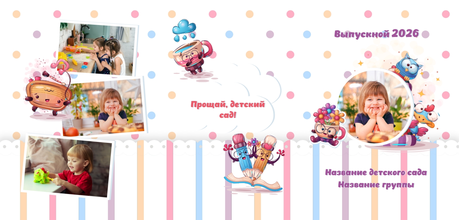 Шаблон выпускной виньетки Трио «Прощай, детский сад!» в розовых тонах идеально подходит для создания милых и трогательных фотокниг о первых шагах в учебной жизни малышей. Этот уже готовый шаблон станет отличным выбором для воспитателей детских садов, фотографов, дизайнеров, а также родителей, желающих сохранить на память яркие моменты из детства своих детей. Наш онлайн-конструктор предоставляет широкие возможности для персонализации этого шаблона, позволяя каждому пользователю сделать уникальную виньетку по своему вкусу. Вы можете добавлять фотографии, менять текст и его шрифт, корректировать цветовые акценты и фоны. Если нужно, можно изменить порядок страниц или добавить новые элементы, такие как декоративные рамки, узоры, маленькие картинки, которые подчеркнут тематику прощания с детским садом. Редактирование простое и интуитивное, поэтому даже без специального опыта можно создать профессионально выглядящую виньетку Трио.