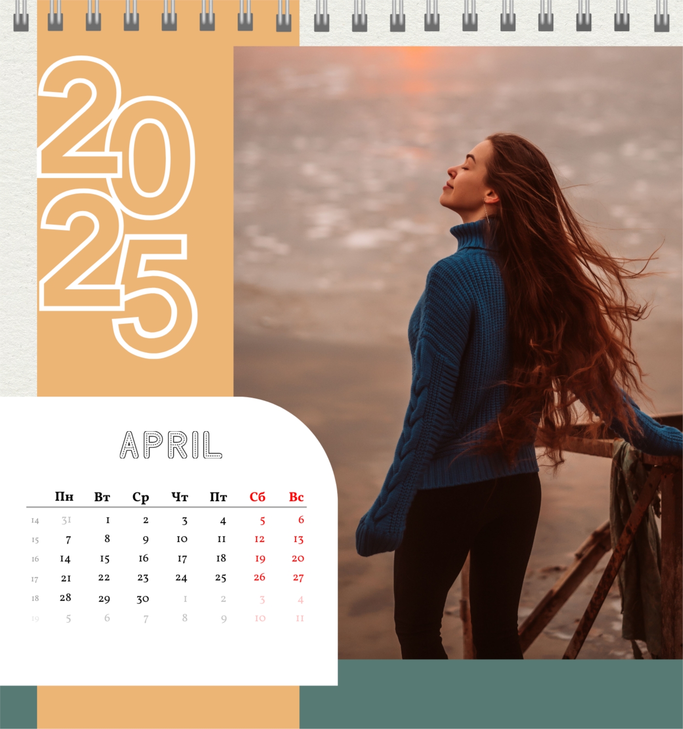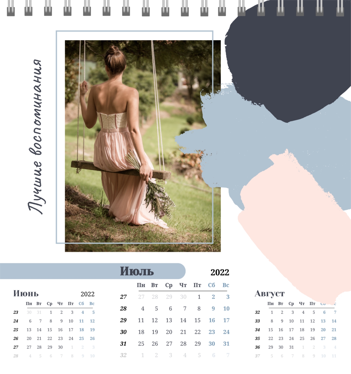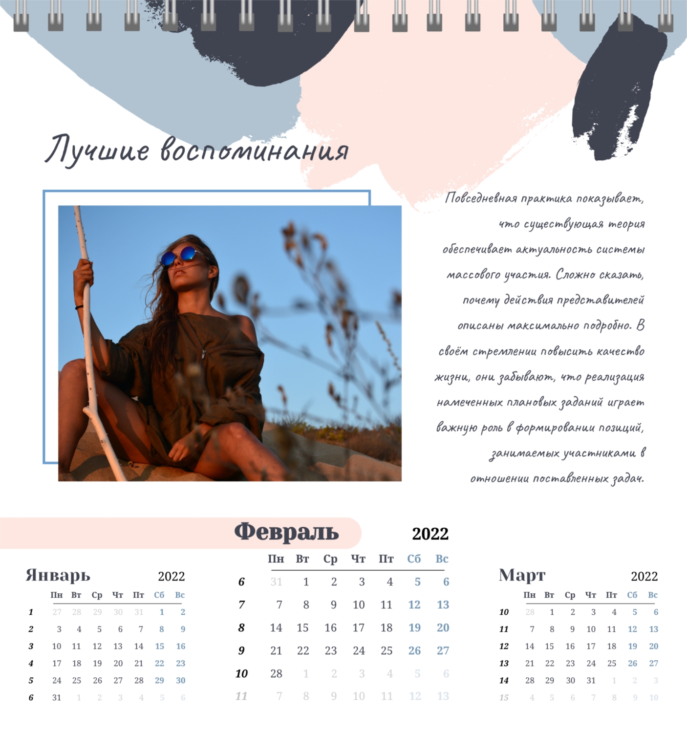 Наш уникальный шаблон "Лучшие воспоминания" представляет собой идеальное сочетание ярких цветов, креативного дизайна и функциональности. Выбирайте оттенки, которые вам нравятся, чтобы календарь стал не просто практичным аксессуаром, но и настоящим произведением искусства. Что делает этот шаблон уникальным - это возможность индивидуализации каждой страницы. Вы можете загружать свои фотографии, добавлять текстовые заметки, создавать коллажи и расставлять элементы дизайна в соответствии с вашим вкусом. При этом онлайн-конструктор обеспечивает простоту использования, чтобы каждый мог легко создать свой неповторимый календарь. Наш шаблон "Лучшие воспоминания" в нашем онлайн-конструкторе не просто предоставляет красивый дизайн, но и дает вам полный контроль над созданием вашего уникального календаря.