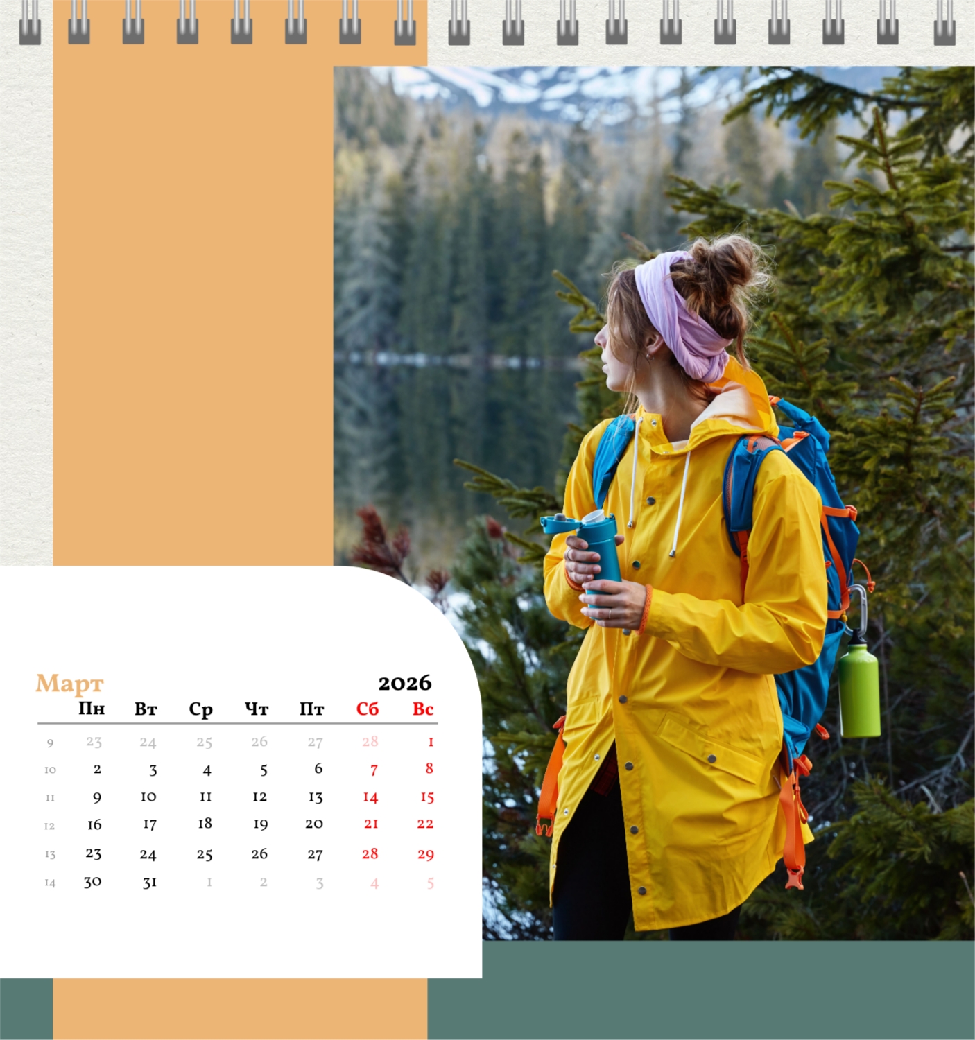 Шаблон "Лучшие воспоминания" для настольного вертикального календаря в нашем онлайн-конструкторе предоставляет уникальную возможность создать яркий и персональный календарь, который будет наполнен вашими самыми запоминающимися моментами. Этот шаблон предоставляет обширные возможности для редактирования, позволяя вам выразить свою индивидуальность. Вы можете легко добавлять и редактировать фотографии, подписи и важные события для каждого месяца. Используйте креативные инструменты, чтобы подчеркнуть особенности каждого месяца и добавить дополнительные визуальные элементы, которые отражают ваши уникальные воспоминания. Благодаря удобному интерфейсу конструктора, вы можете легко перетаскивать и изменять элементы дизайна, создавая календарь, который отражает ваш уникальный стиль. Этот шаблон призван стать не только органайзером вашего времени, но и индивидуальным произведением искусства, отражающим лучшие моменты вашей жизни. Создавайте свой календарь с нами, чтобы каждый день был наполнен вдохновением и воспоминаниями.