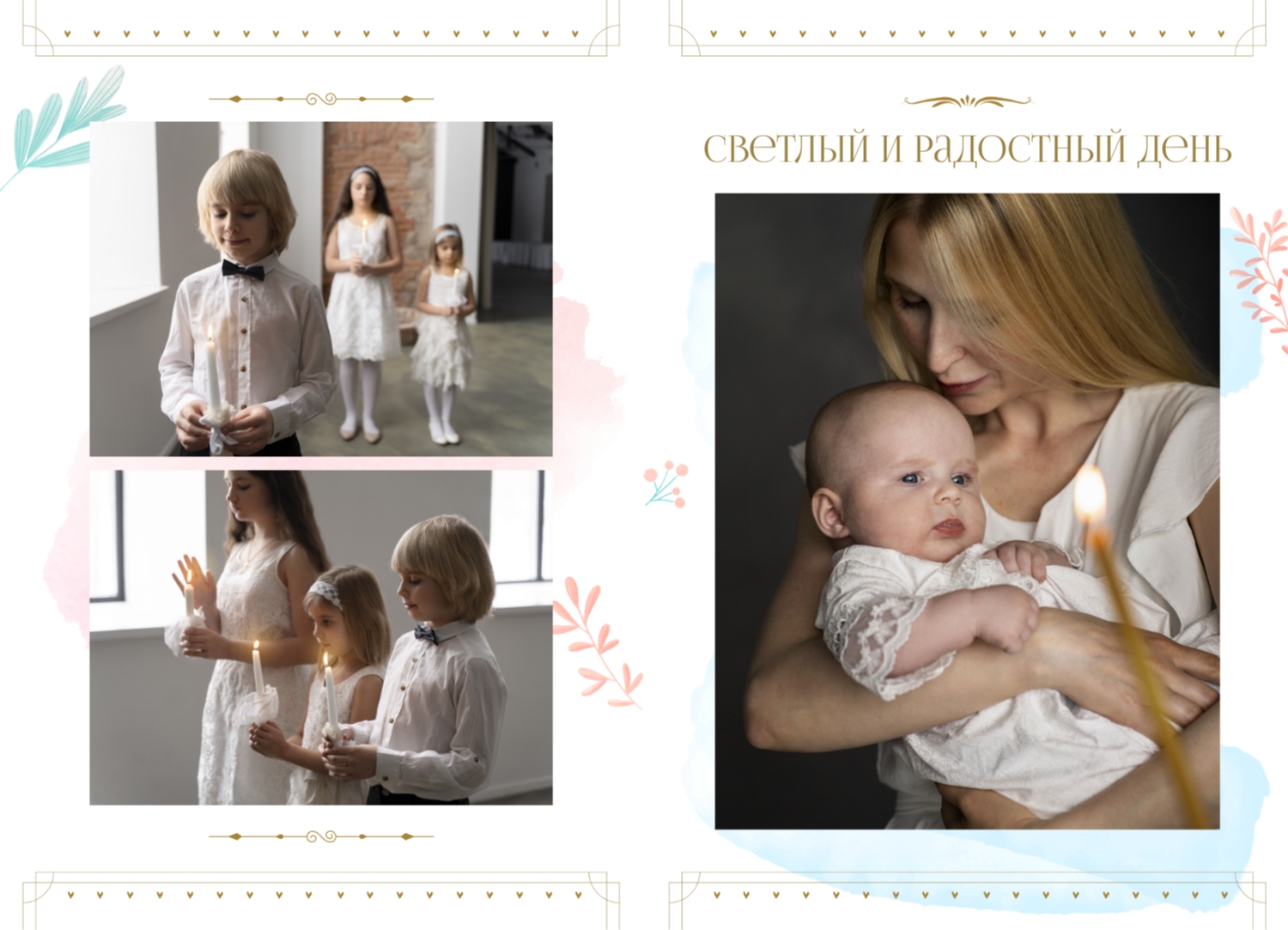 Готовый шаблон фотокниги в твердой обложке «Таинство Крещения» создан для того, чтобы запечатлеть светлые и важные моменты этого значимого события. Шаблон оформлен в нежных тонах с изящными декоративными элементами, символизирующими чистоту и благодать. Однако в нашем онлайн-конструкторе можно легко адаптировать его под личные предпочтения. Вы можете заменить фон, изменить цветовую палитру, добавить или удалить украшения, а также выбрать удобное расположение фотографий. Важно, что каждую страницу можно редактировать, переставлять блоки, добавлять подписи, стилизованные надписи или даже личные пожелания. Создать свою уникальную вертикальную фотокнигу очень просто. Достаточно загрузить фотографии, скорректировать макет по своему вкусу и сразу увидеть, как будет выглядеть готовый результат. Онлайн-конструктор позволяет сохранить изменения в любой момент и вернуться к работе позже. Таким образом, готовый шаблон «Таинство Крещения» становится не просто основой, а отправной точкой для создания персонализированного и неповторимого семейного альбома, который будет радовать долгие годы.