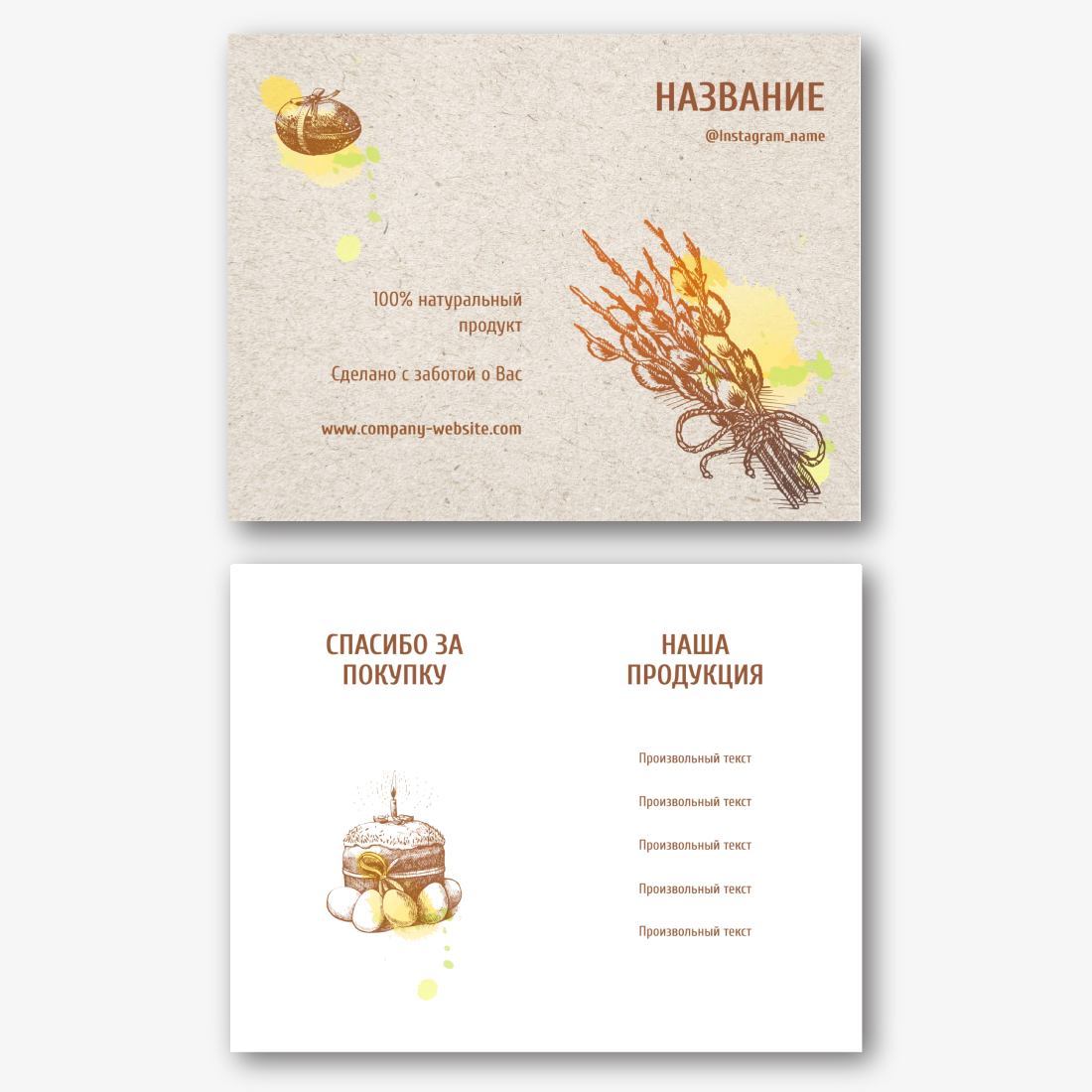 Готовый шаблон пасхальной бирки – это отличное решение для оформления подарков, упаковки праздничных товаров или украшения продукции к Пасхе. Такая бирка идеально подойдет для пекарей, кондитеров, ремесленников, а также владельцев магазинов, создающих особую атмосферу праздника. В онлайн-конструкторе этот шаблон легко настраивается под любые задачи. Можно изменить фон, выбрать другой оттенок, добавить авторские рисунки или фирменный стиль, если бирка предназначена для бизнеса. Текстовые элементы редактируются без ограничений – можно добавить имя получателя, поздравления или информацию о продукте. Шрифты, их цвет и размер тоже можно менять, подбирая оптимальное сочетание для создания нужного настроения.
