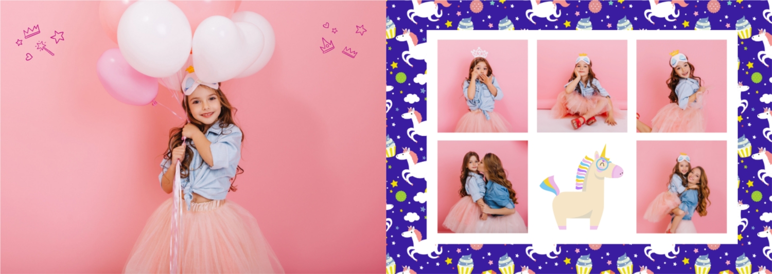 Готовый шаблон горизонтальной фотокниги в твердой обложке для фото новорожденного «Маленькая принцесса» – это нежный и трогательный макет, который поможет сохранить самые драгоценные моменты первых дней жизни малышки. Дизайн выполнен в мягких пастельных тонах с изящными декоративными элементами: воздушными облаками, милыми игрушками, цветочными узорами и сказочными мотивами. Этот шаблон можно использовать не только в личных целях, но и в профессиональной сфере. Он станет прекрасной основой для работы фотографов, дизайнеров и специалистов, занимающихся оформлением детских фотоальбомов. Также он подойдет для сотрудников фотостудий, которые предлагают клиентам создание эксклюзивных книг с фотографиями малышей. В онлайн-конструкторе макет легко редактируется, позволяя сделать его действительно уникальным. Можно заменить фон, добавить дополнительные декоративные элементы или убрать ненужные детали. Поля с текстом и фотографиями полностью настраиваемы: можно изменить размер и расположение снимков, выбрать подходящий шрифт и цвет подписей, добавить теплые пожелания или забавные комментарии.