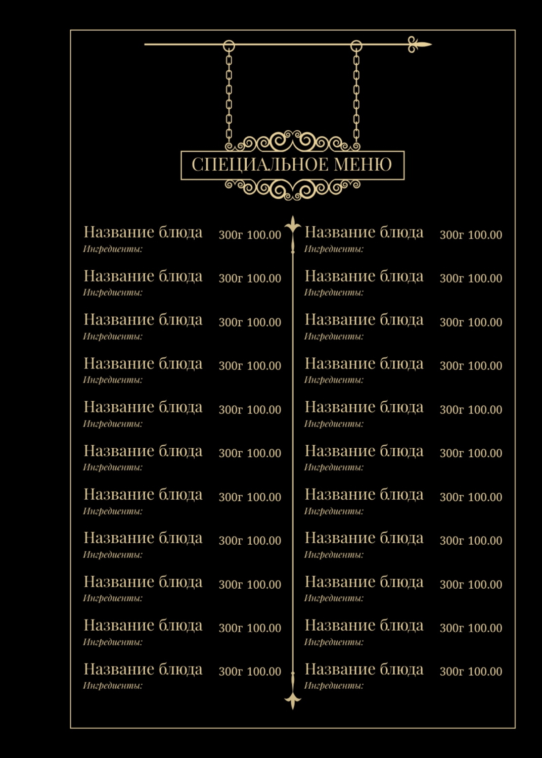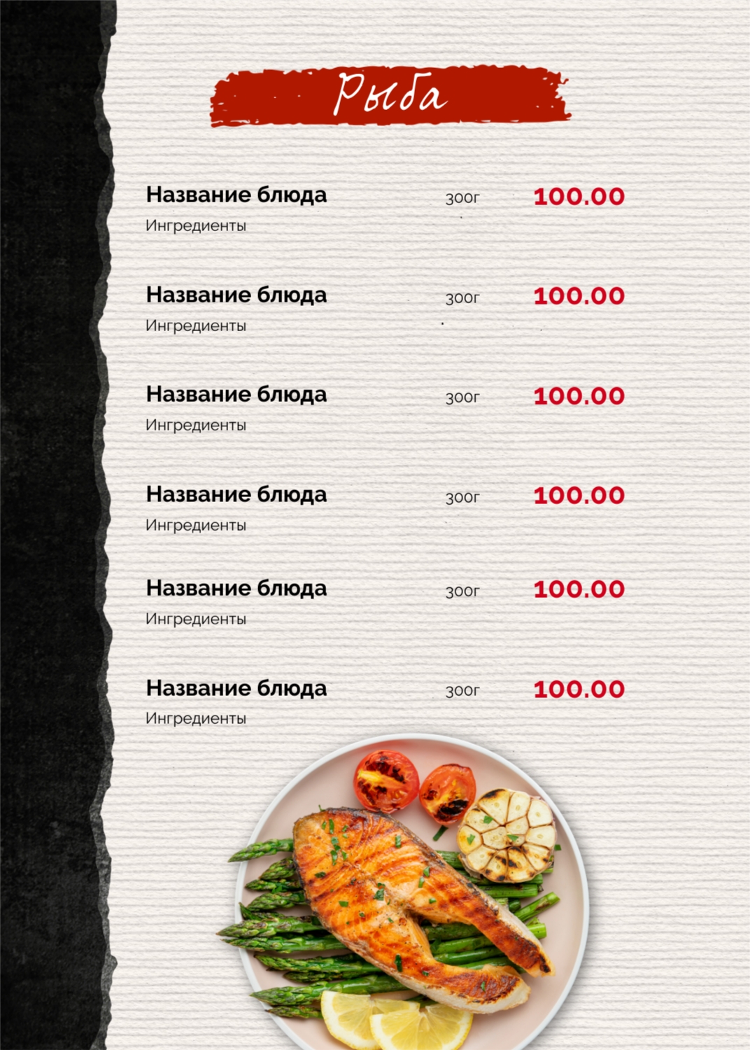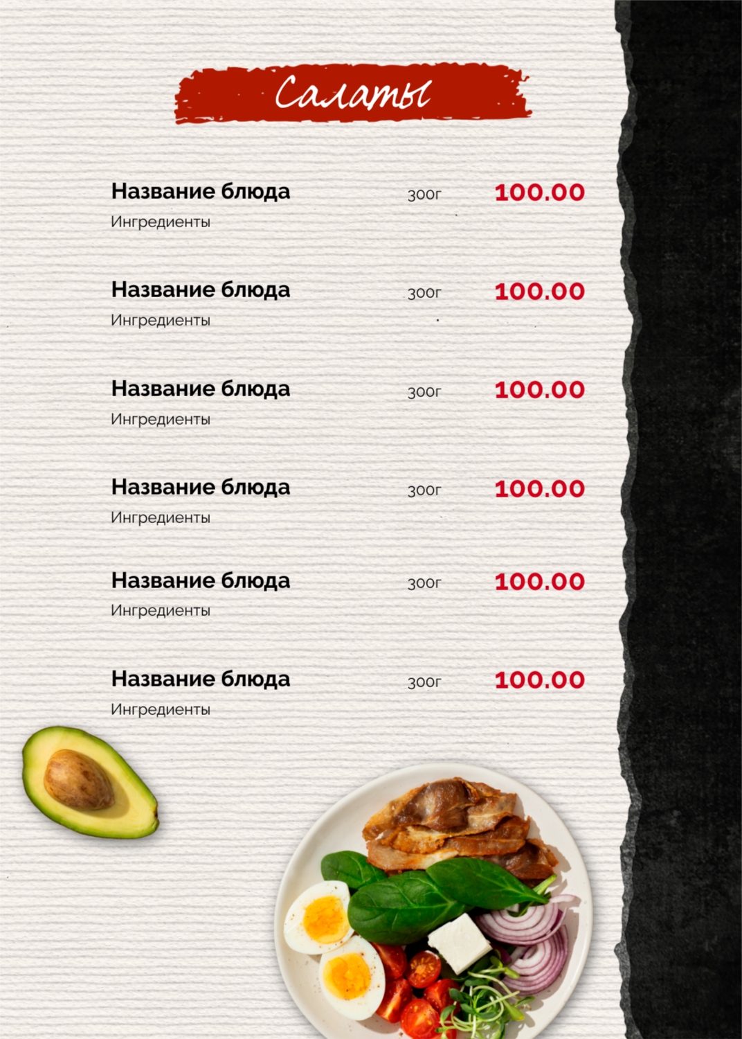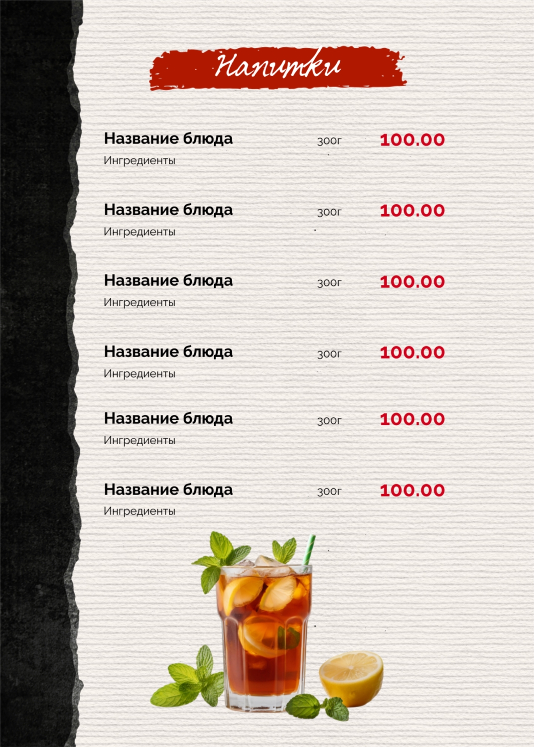 Готовый шаблон меню ресторана — это отличная отправная точка для создания стильного и профессионального меню, которое подчеркнёт атмосферу заведения и привлечёт внимание гостей. Такой шаблон разработан с учетом визуальной структуры, удобной для восприятия: блоки для названий блюд, описания, цены и акценты оформлены таким образом, чтобы меню выглядело аккуратно, читабельно и современно. Он идеально подойдёт для владельцев ресторанов, кафе, баров, уличных фуд-точек, кейтеринговых компаний, пекарен и даже небольших авторских заведений, где важен индивидуальный подход к каждой детали. С помощью онлайн-конструктора вы легко адаптируете шаблон под концепцию вашего заведения. Можно изменить цветовую гамму, выбрать другой шрифт, загрузить собственный логотип, добавить фирменные изображения блюд или фотографии интерьера. При необходимости вы можете изменить структуру блоков: добавить новые категории, объединить или убрать разделы, выделить акционные предложения или популярные позиции. Редактирование проходит в режиме реального времени, поэтому вы сразу видите, как выглядит готовое меню. Никаких дизайнерских навыков не требуется — достаточно желания сделать меню уникальным. Такой подход особенно удобен для тех, кто регулярно обновляет ассортимент и хочет быстро вносить изменения без необходимости обращаться к специалистам. Благодаря онлайн-конструктору даже стандартный шаблон становится основой для создания индивидуального и запоминающегося меню, которое точно понравится вашим гостям.