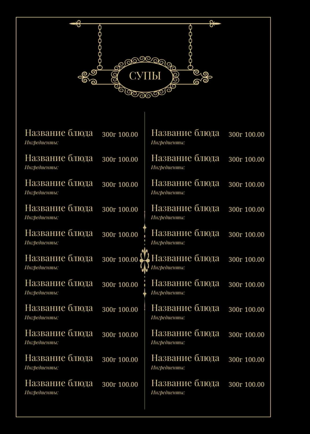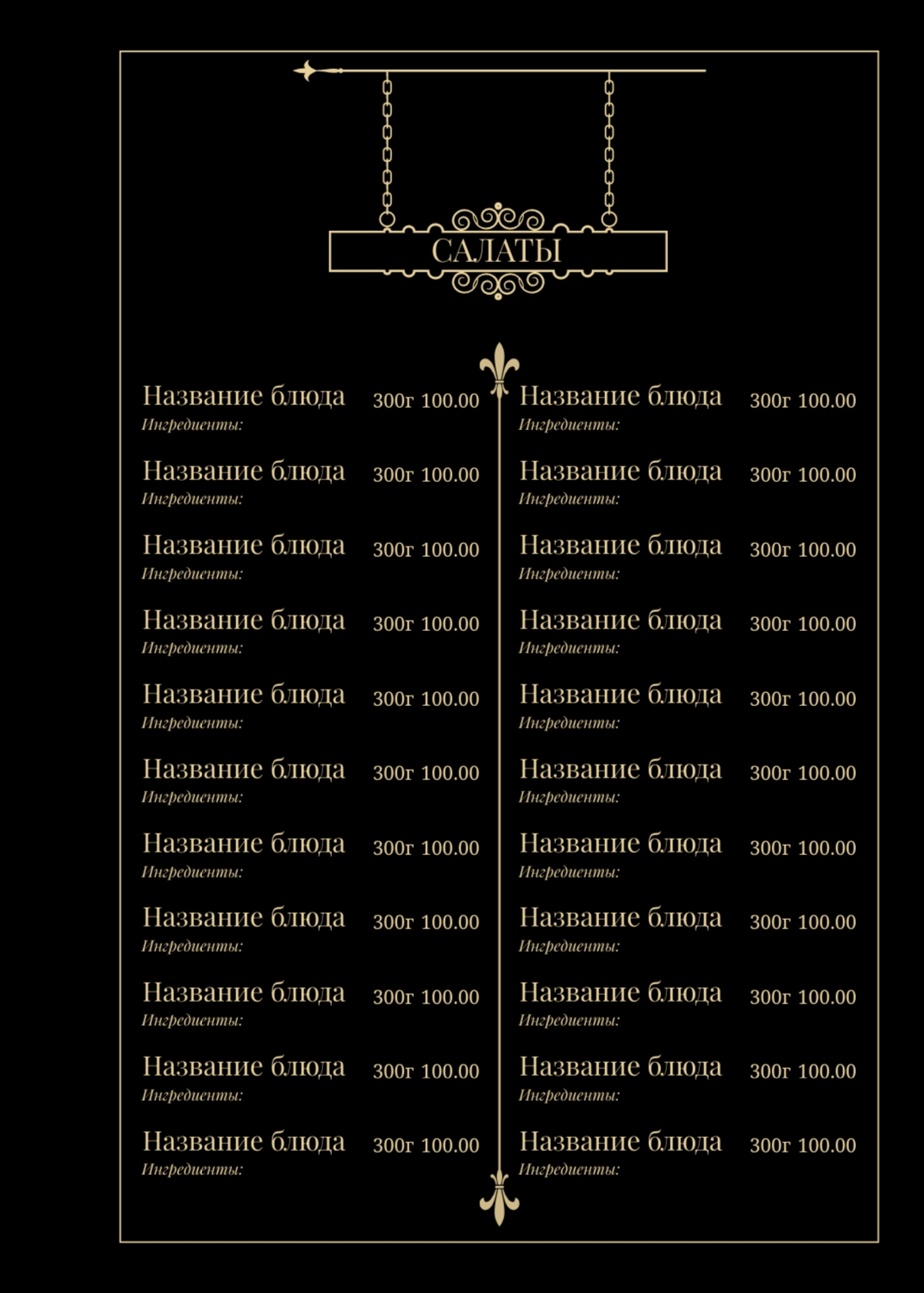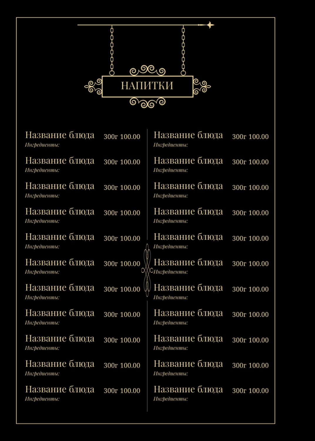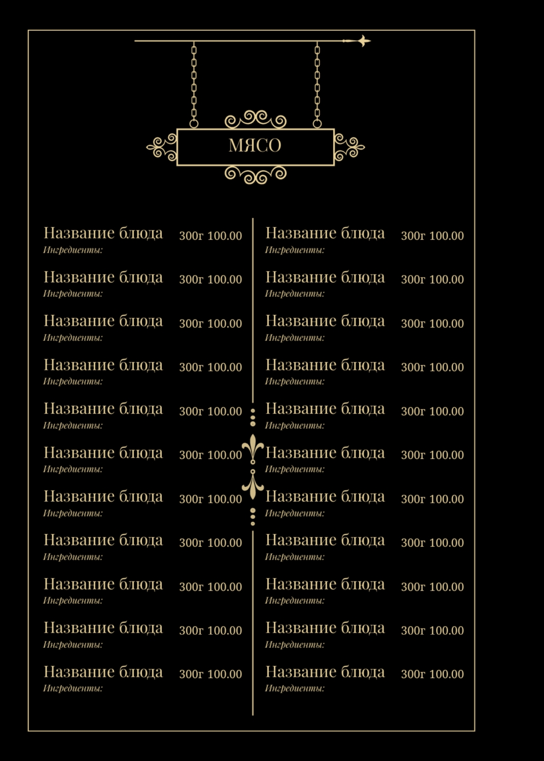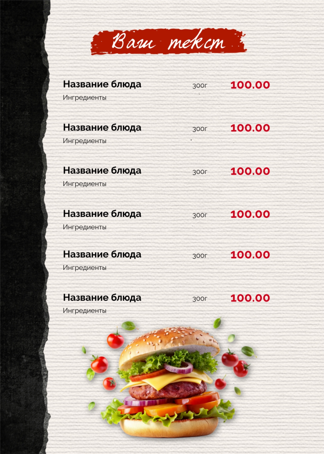 Готовый шаблон меню ресторана — это отличная отправная точка для создания стильного и профессионального меню, которое подчеркнёт атмосферу заведения и привлечёт внимание гостей. Такой шаблон разработан с учетом визуальной структуры, удобной для восприятия: блоки для названий блюд, описания, цены и акценты оформлены таким образом, чтобы меню выглядело аккуратно, читабельно и современно. Он идеально подойдёт для владельцев ресторанов, кафе, баров, уличных фуд-точек, кейтеринговых компаний, пекарен и даже небольших авторских заведений, где важен индивидуальный подход к каждой детали. С помощью онлайн-конструктора вы легко адаптируете шаблон под концепцию вашего заведения. Можно изменить цветовую гамму, выбрать другой шрифт, загрузить собственный логотип, добавить фирменные изображения блюд или фотографии интерьера. При необходимости вы можете изменить структуру блоков: добавить новые категории, объединить или убрать разделы, выделить акционные предложения или популярные позиции. Редактирование проходит в режиме реального времени, поэтому вы сразу видите, как выглядит готовое меню. Никаких дизайнерских навыков не требуется — достаточно желания сделать меню уникальным. Такой подход особенно удобен для тех, кто регулярно обновляет ассортимент и хочет быстро вносить изменения без необходимости обращаться к специалистам. Благодаря онлайн-конструктору даже стандартный шаблон становится основой для создания индивидуального и запоминающегося меню, которое точно понравится вашим гостям.