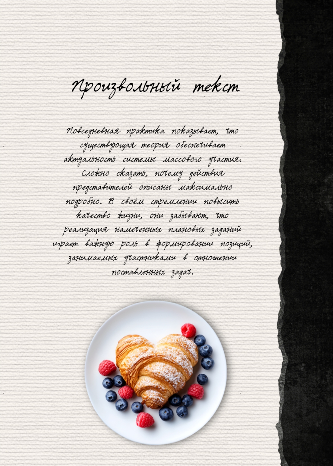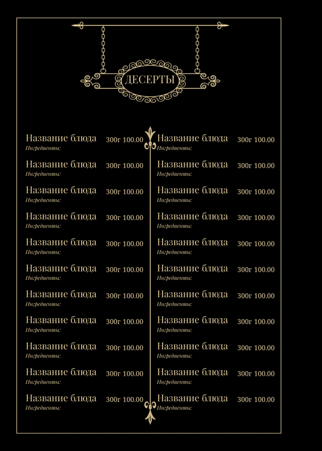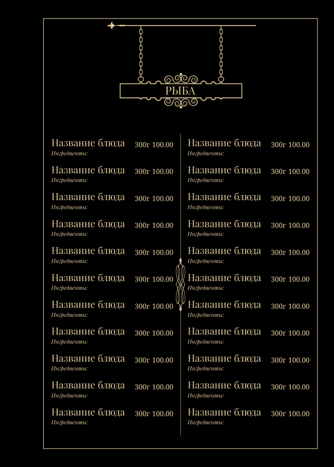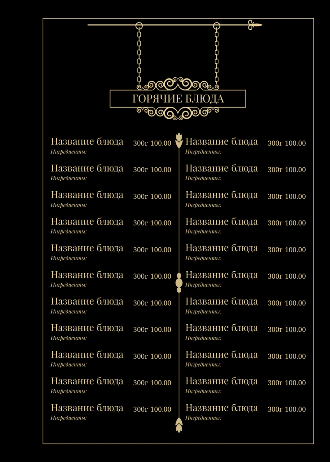 Готовый шаблон меню ресторана — это отличная отправная точка для создания стильного и профессионального меню, которое подчеркнёт атмосферу заведения и привлечёт внимание гостей. Такой шаблон разработан с учетом визуальной структуры, удобной для восприятия: блоки для названий блюд, описания, цены и акценты оформлены таким образом, чтобы меню выглядело аккуратно, читабельно и современно. Он идеально подойдёт для владельцев ресторанов, кафе, баров, уличных фуд-точек, кейтеринговых компаний, пекарен и даже небольших авторских заведений, где важен индивидуальный подход к каждой детали. С помощью онлайн-конструктора вы легко адаптируете шаблон под концепцию вашего заведения. Можно изменить цветовую гамму, выбрать другой шрифт, загрузить собственный логотип, добавить фирменные изображения блюд или фотографии интерьера. При необходимости вы можете изменить структуру блоков: добавить новые категории, объединить или убрать разделы, выделить акционные предложения или популярные позиции. Редактирование проходит в режиме реального времени, поэтому вы сразу видите, как выглядит готовое меню. Никаких дизайнерских навыков не требуется — достаточно желания сделать меню уникальным. Такой подход особенно удобен для тех, кто регулярно обновляет ассортимент и хочет быстро вносить изменения без необходимости обращаться к специалистам. Благодаря онлайн-конструктору даже стандартный шаблон становится основой для создания индивидуального и запоминающегося меню, которое точно понравится вашим гостям.