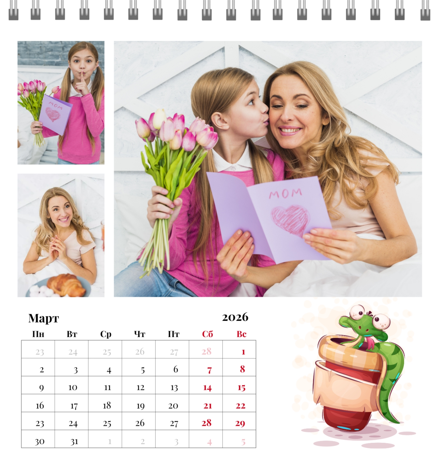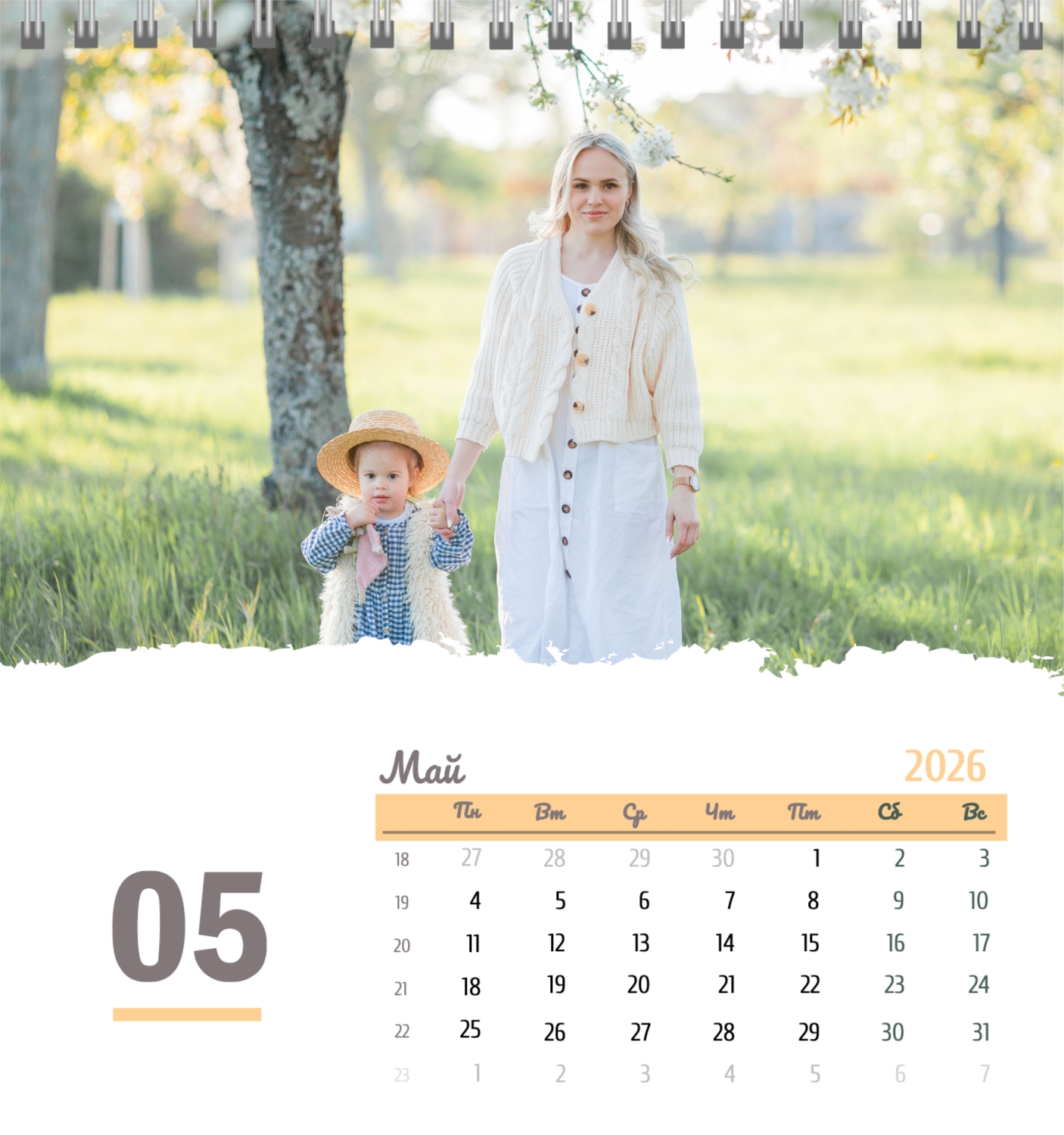 Готовый шаблон настольного перекидного календаря на 13 страниц «Мамина любовь» — это трогательный и нежный дизайн, наполненный теплом, заботой и уютом. Он оформлен в мягких пастельных тонах с элементами, символизирующими материнскую ласку: сердечки, детские рисунки, цветочные мотивы. Такой календарь идеально подойдет для семейных фотосессий, подарков ко Дню матери, а также станет отличным решением для специалистов, работающих в сфере детского развития, семейной психологии, педагогики и дошкольного образования. Его можно использовать в детских садах, центрах раннего развития, частных фотостудиях, а также в благотворительных организациях, помогающих семьям. В онлайн-конструкторе этот шаблон можно легко адаптировать под любой формат и содержание. Все элементы редактируются: можно загрузить собственные фотографии, изменить надписи, выбрать шрифт и его цвет, отрегулировать расположение месяцев, добавить важные даты и события. Благодаря гибким настройкам календарь легко превратить в персональный подарок или профессиональный инструмент — например, брендированный календарь с логотипом и контактами центра.