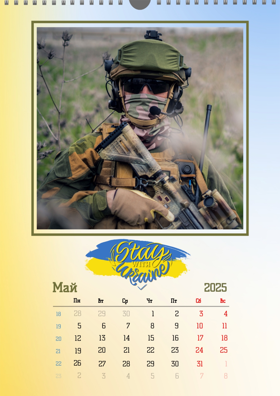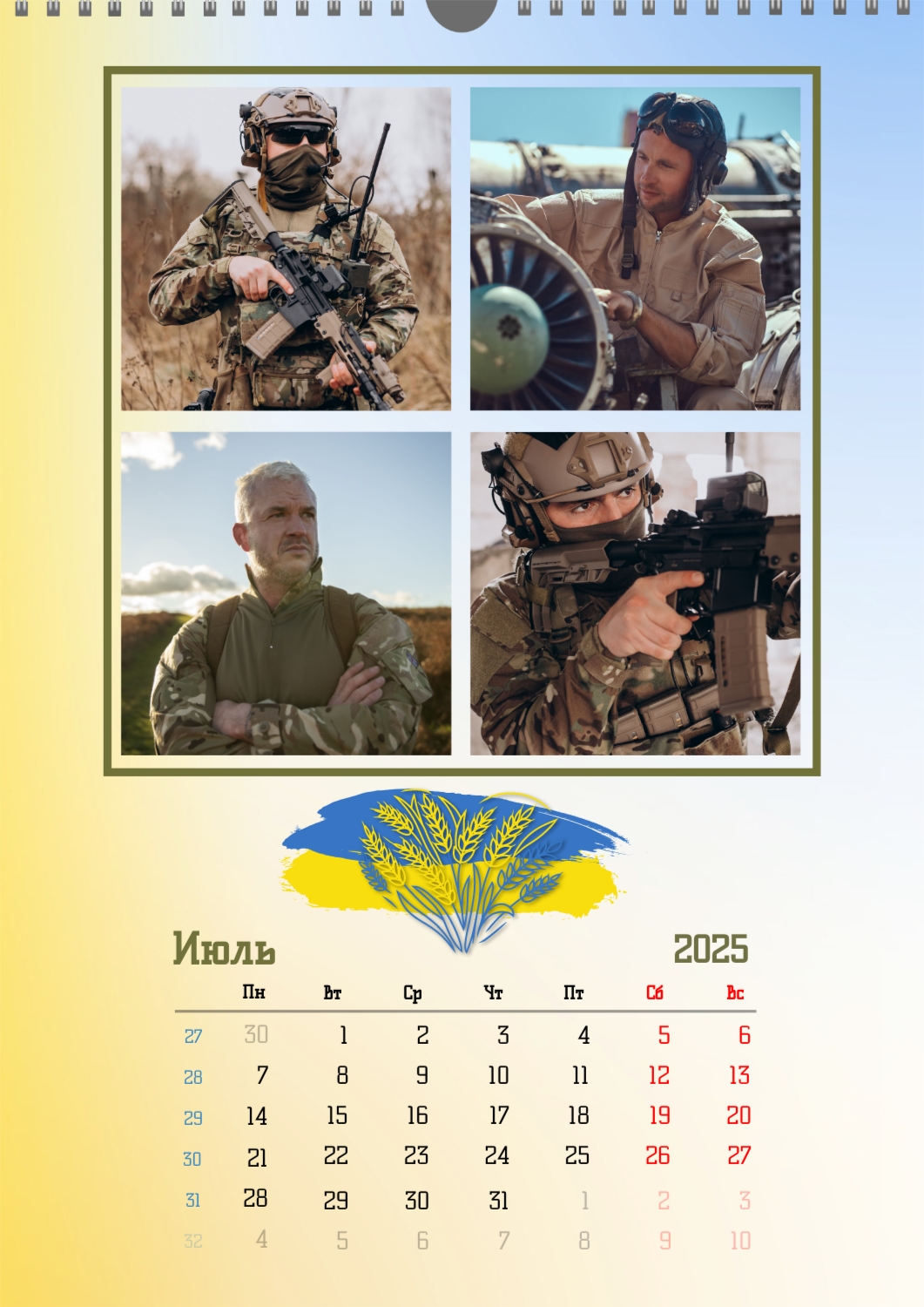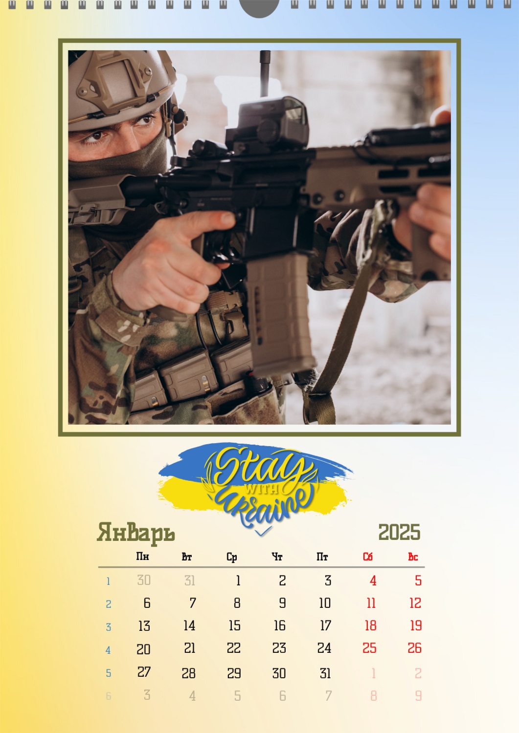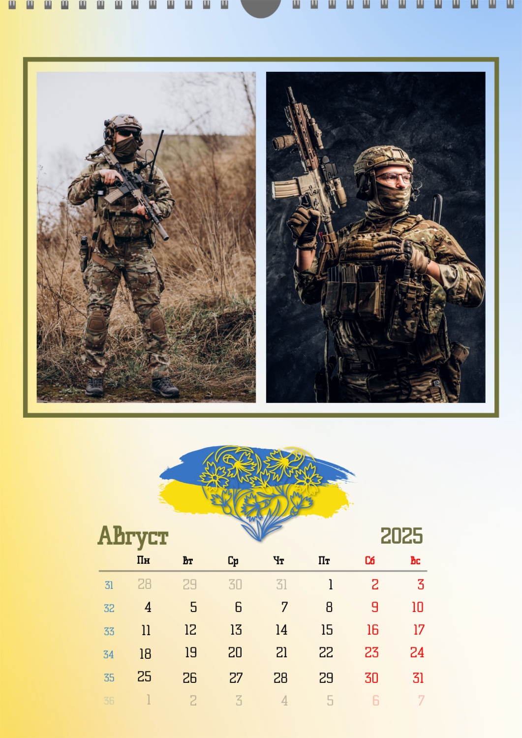 Готовый шаблон украинского календаря для военных — это патриотичное и содержательное оформление, которое несет в себе не только практическую функцию, но и эмоциональный посыл. Такой календарь особенно актуален для военнослужащих, ветеранов, волонтеров, представителей оборонной сферы и всех, кто так или иначе связан с армией или военными организациями. В онлайн-конструкторе этот шаблон можно легко адаптировать под конкретные цели и потребности. Вы можете заменить фотографии на свои собственные снимки — как портретные, так и групповые, изменить подписи, добавить индивидуальные тексты или важные даты, связанные с военной службой, памятными событиями или личными достижениями. Также доступна возможность редактировать шрифты, цвета, оформление сетки календаря и даже добавить собственные цитаты или эмблемы. Интерфейс конструктора интуитивно понятен, что позволяет быстро внести правки и увидеть результат в реальном времени. Это отличный способ создать персонализированный подарок для бойца, командира или целого подразделения — календарь, в котором отражена не только структура месяцев, но и уважение, благодарность и память. Такой шаблон становится не просто печатным изделием, а важным символом поддержки и гордости.