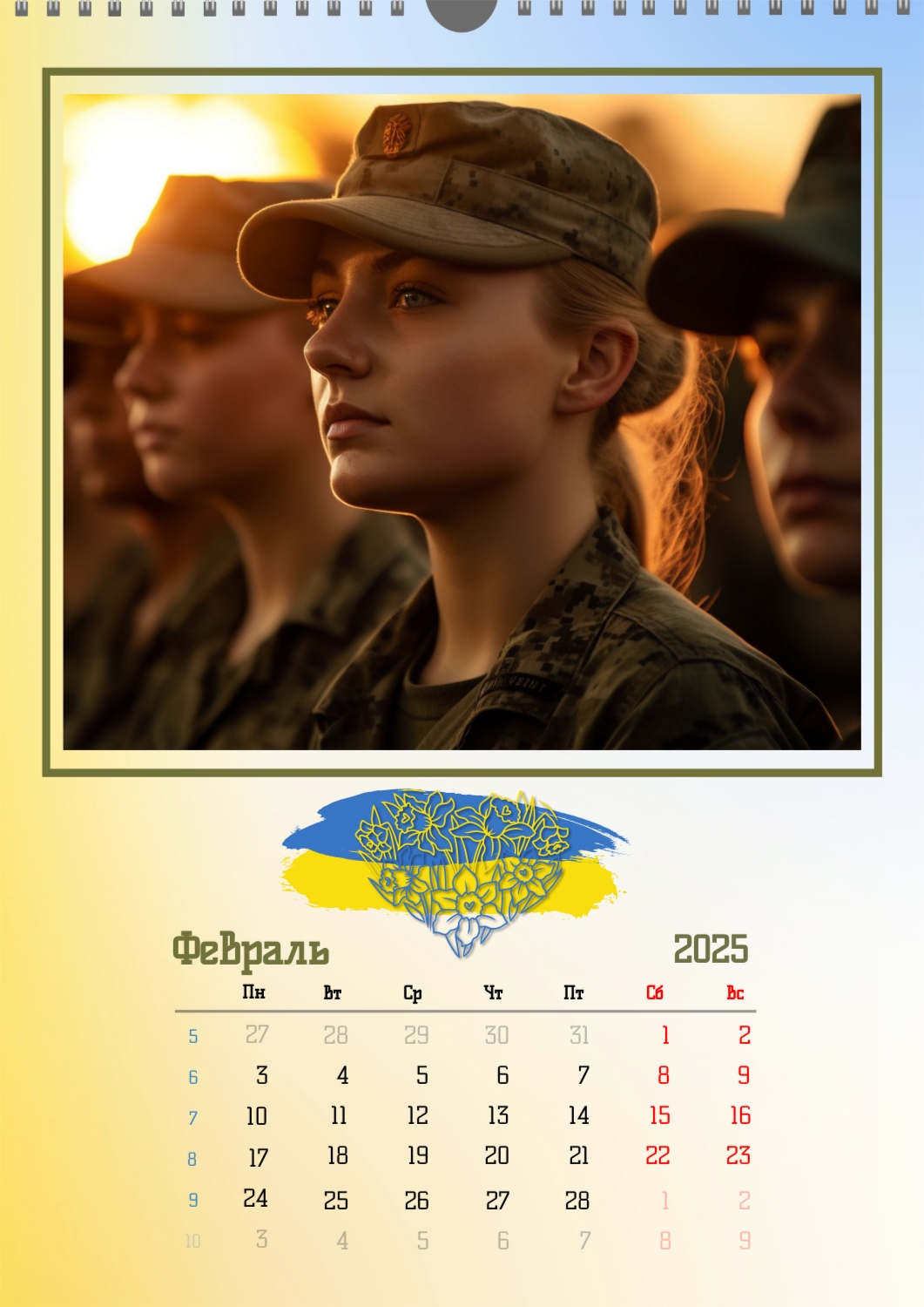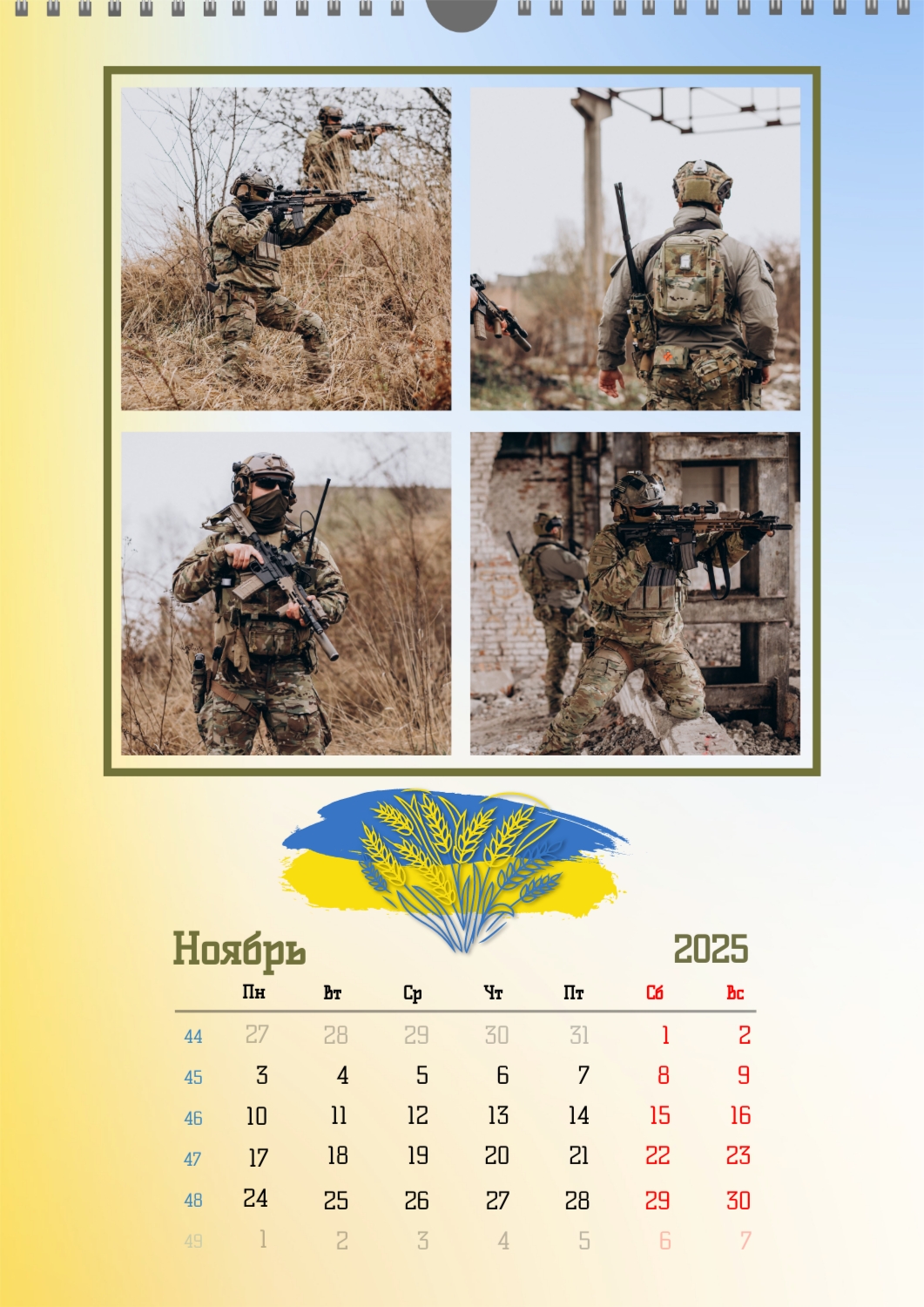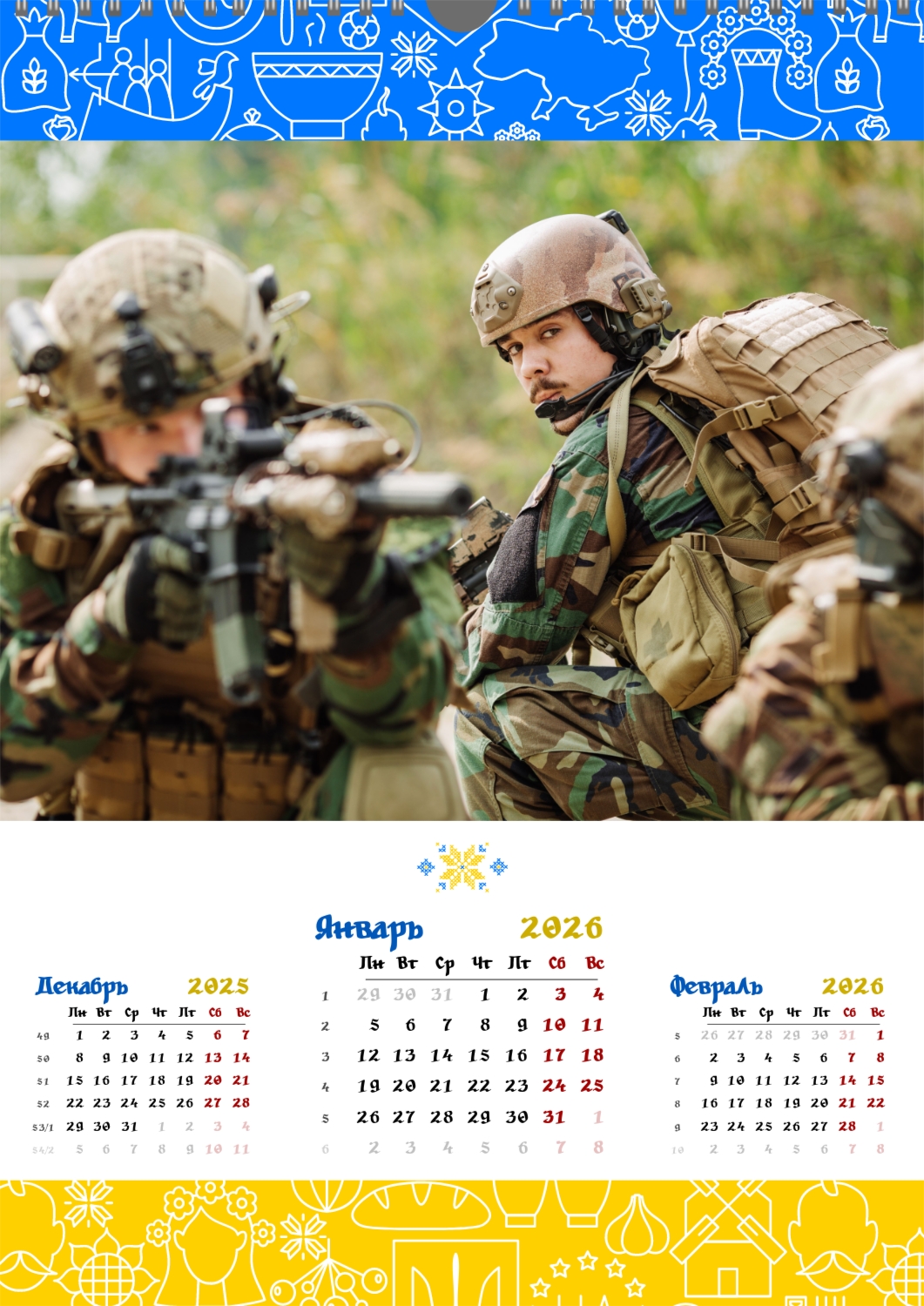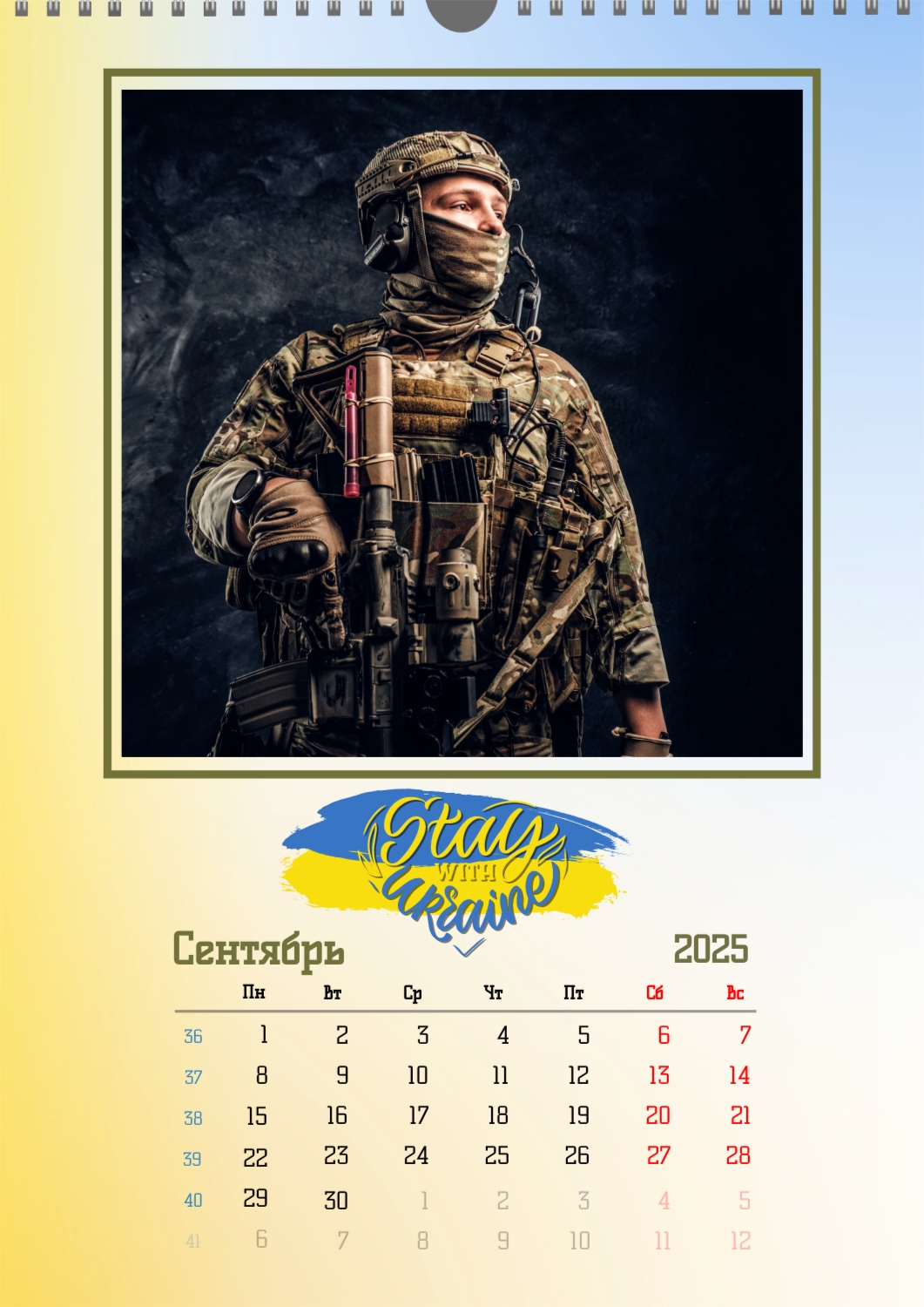 Готовый шаблон украинского календаря для военных — это патриотичное и содержательное оформление, которое несет в себе не только практическую функцию, но и эмоциональный посыл. Такой календарь особенно актуален для военнослужащих, ветеранов, волонтеров, представителей оборонной сферы и всех, кто так или иначе связан с армией или военными организациями. В онлайн-конструкторе этот шаблон можно легко адаптировать под конкретные цели и потребности. Вы можете заменить фотографии на свои собственные снимки — как портретные, так и групповые, изменить подписи, добавить индивидуальные тексты или важные даты, связанные с военной службой, памятными событиями или личными достижениями. Также доступна возможность редактировать шрифты, цвета, оформление сетки календаря и даже добавить собственные цитаты или эмблемы. Интерфейс конструктора интуитивно понятен, что позволяет быстро внести правки и увидеть результат в реальном времени. Это отличный способ создать персонализированный подарок для бойца, командира или целого подразделения — календарь, в котором отражена не только структура месяцев, но и уважение, благодарность и память. Такой шаблон становится не просто печатным изделием, а важным символом поддержки и гордости.