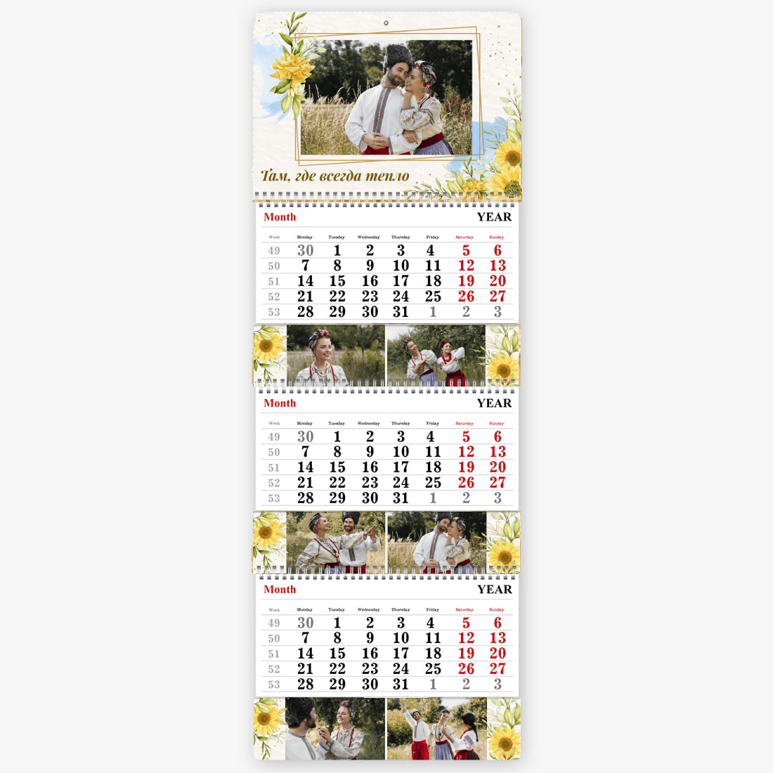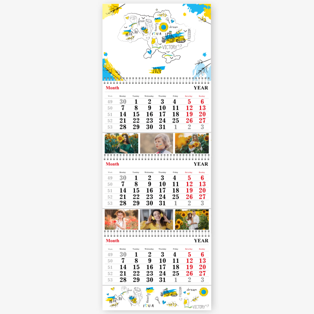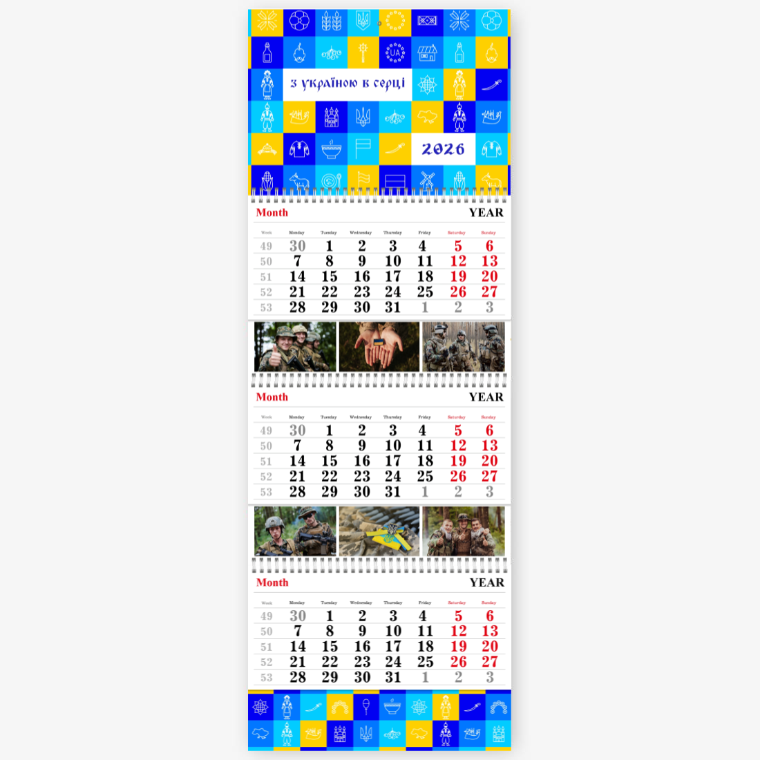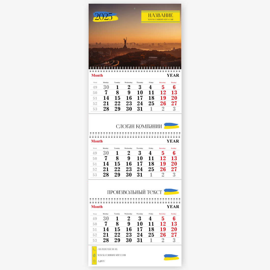 Готовый шаблон украинского календаря — это стильное и практичное решение для тех, кто хочет создать персонализированный настенный квартальный календарь Трио с национальным характером. Такой календарь будет уместен как в образовательных учреждениях, так и в государственных структурах, культурных центрах, туристических агентствах, магазинах с этнической продукцией и сувенирами. Также он подойдет для фермеров, ремесленников, работников в сфере агротуризма и всех, кто хочет подчеркнуть свою связь с украинскими традициями. Онлайн-конструктор позволяет гибко редактировать шаблон под конкретные задачи. Можно изменить заголовки месяцев, добавить фото — как пейзажи, так и портреты, — вставить логотип компании или свой собственный текст с важными датами, событиями и поздравлениями. Все элементы дизайна доступны для настройки: шрифты, цвета, фон, иконки и рамки легко заменяются или перемещаются. Даже если вы раньше никогда не создавали макеты, интуитивный интерфейс конструктора поможет вам справиться с задачей без лишних усилий.