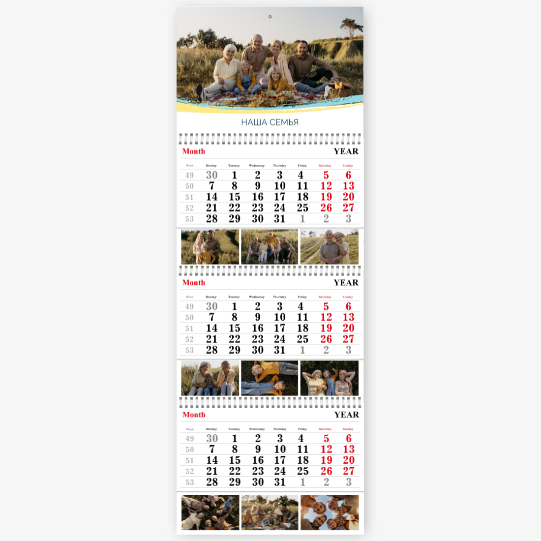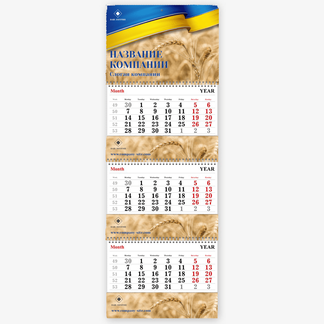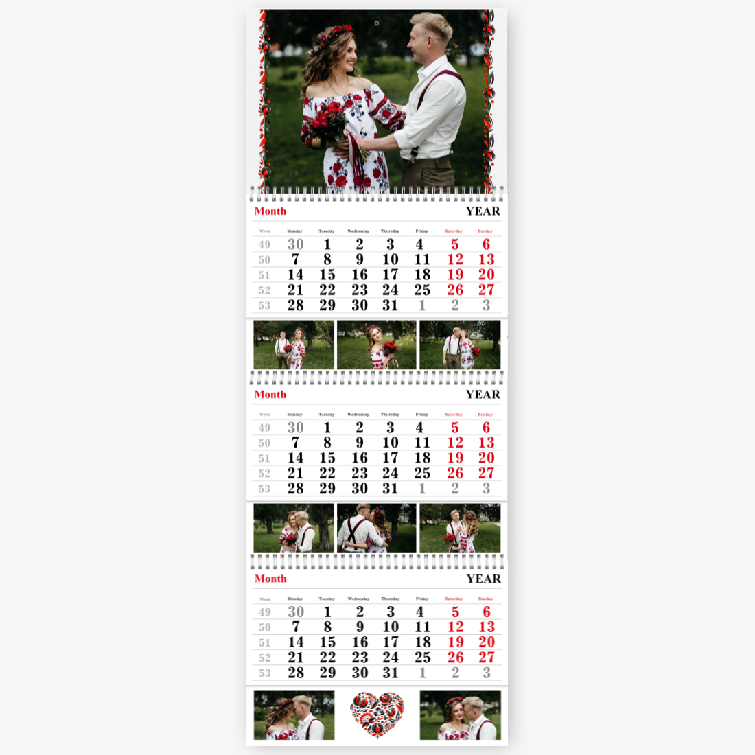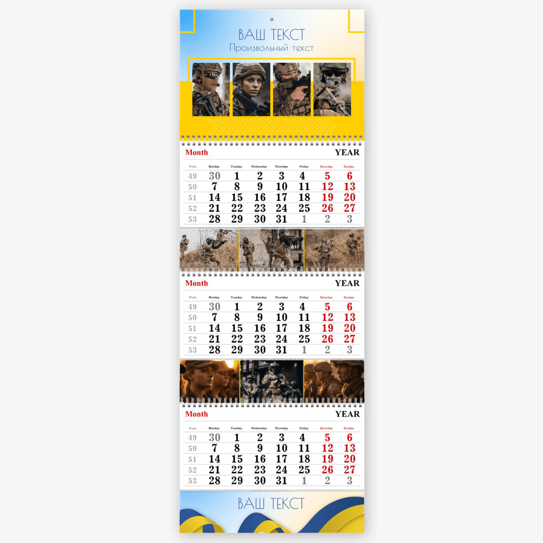 Готовый шаблон украинского календаря — это стильное и практичное решение для тех, кто хочет создать персонализированный настенный квартальный календарь Трио с национальным характером. Такой календарь будет уместен как в образовательных учреждениях, так и в государственных структурах, культурных центрах, туристических агентствах, магазинах с этнической продукцией и сувенирами. Также он подойдет для фермеров, ремесленников, работников в сфере агротуризма и всех, кто хочет подчеркнуть свою связь с украинскими традициями. Онлайн-конструктор позволяет гибко редактировать шаблон под конкретные задачи. Можно изменить заголовки месяцев, добавить фото — как пейзажи, так и портреты, — вставить логотип компании или свой собственный текст с важными датами, событиями и поздравлениями. Все элементы дизайна доступны для настройки: шрифты, цвета, фон, иконки и рамки легко заменяются или перемещаются. Даже если вы раньше никогда не создавали макеты, интуитивный интерфейс конструктора поможет вам справиться с задачей без лишних усилий.