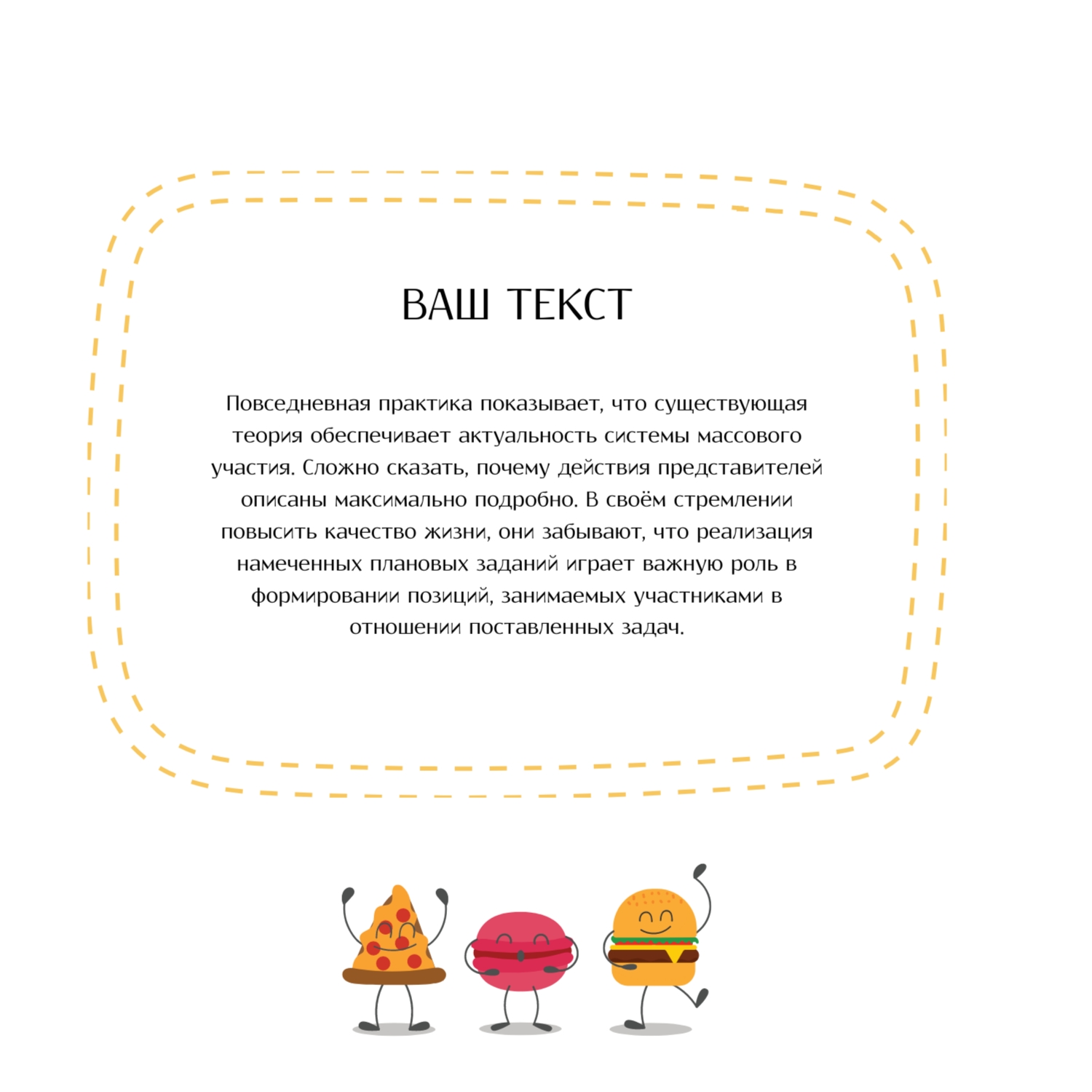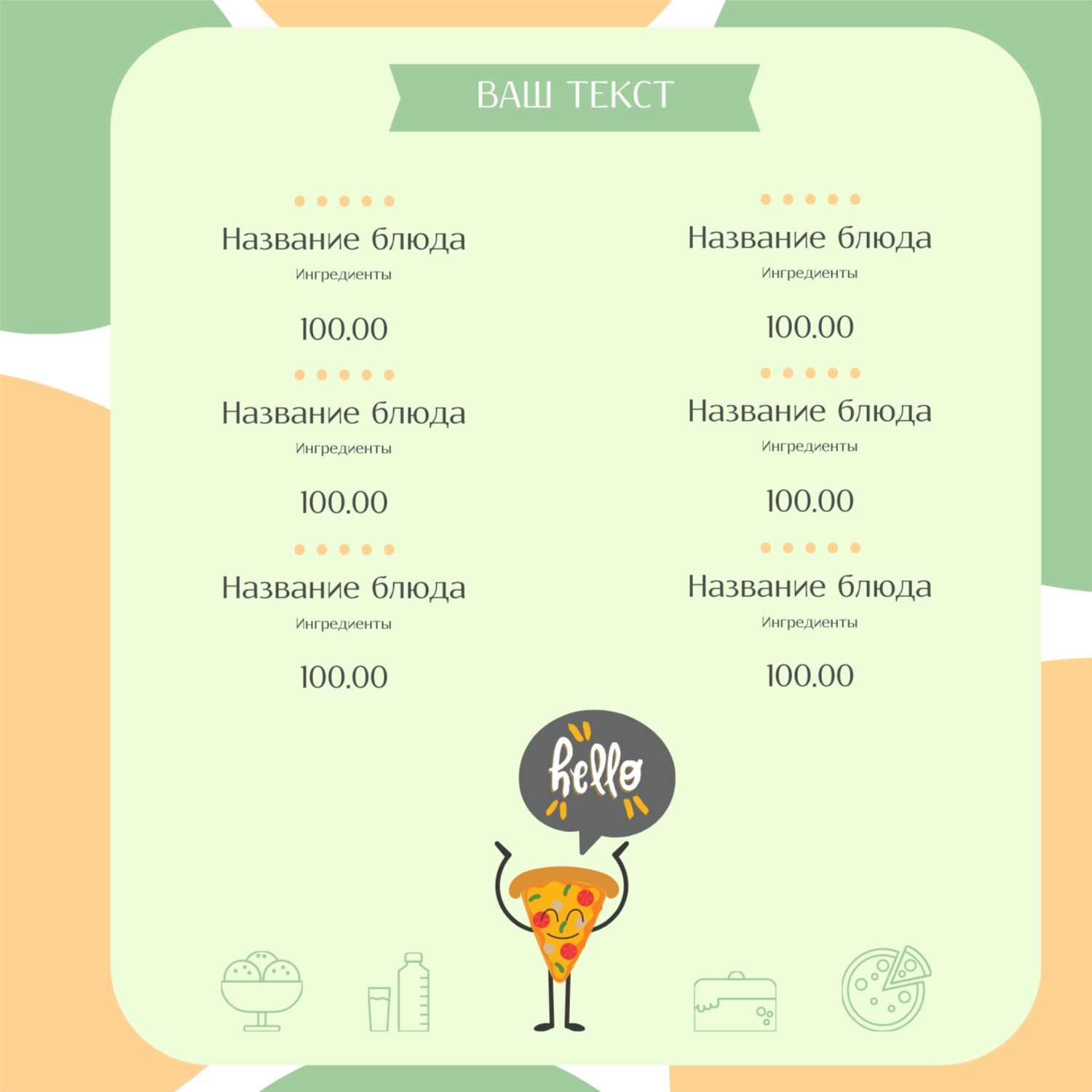 Готовый шаблон яркого квадратного детского меню - это красочное и веселое решение, которое сразу же привлекает внимание детей и их родителей. Он оформлен в веселом стиле с яркими элементами, простыми формами и дружелюбными иллюстрациями, которые создают праздничную атмосферу и хорошее настроение. Этот проект идеально подходит для кафе и ресторанов с детскими зонами, семейных учреждений, детских садов и школ, развлекательных центров, а также организаций, где важен интерес ребенка и делает процесс выбора блюд более привлекательным. В онлайн-конструкторе этот шаблон можно легко редактировать для конкретных задач. Меню можно заполнить собственными блюдами, изменить шрифты и цвета текста, добавить логотип компании и контактную информацию учреждения. Каждый элемент можно перемещать, изменять размер иллюстраций или заменять собственными изображениями, чтобы дизайн полностью соответствовал стилю бренда. При желании яркие детали можно смягчить, а акценты сместить на фотографии блюд, чтобы подчеркнуть аппетитное лакомство.