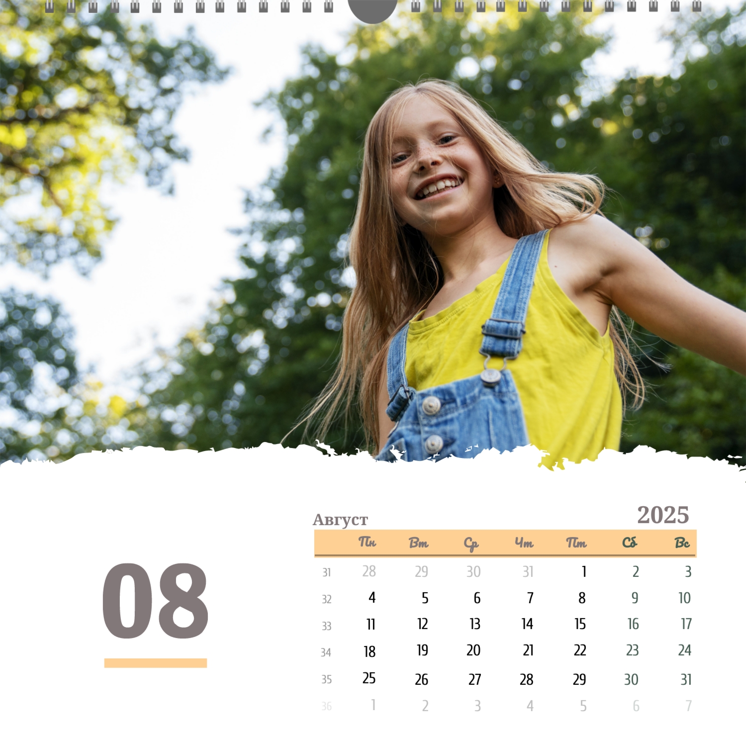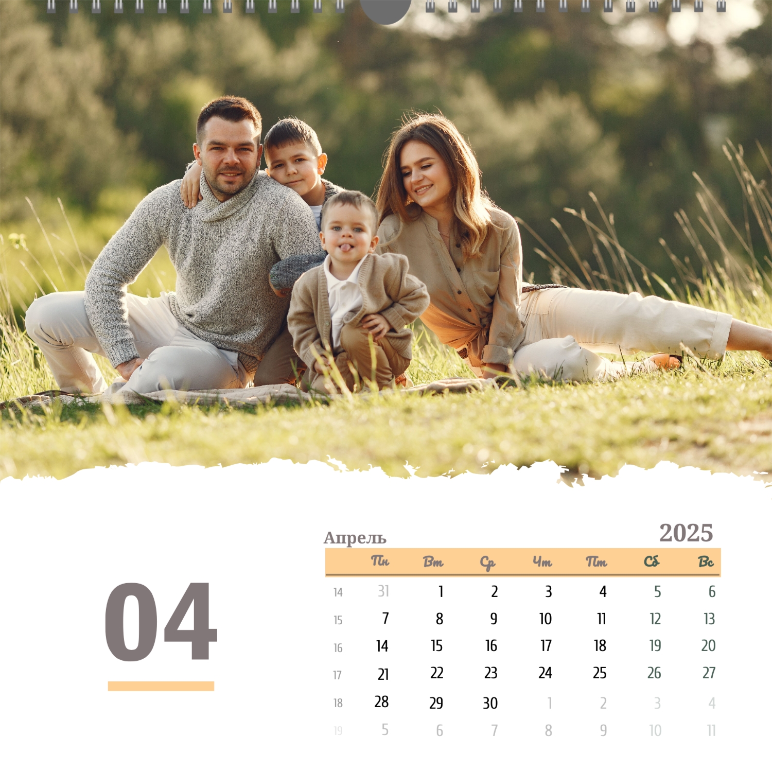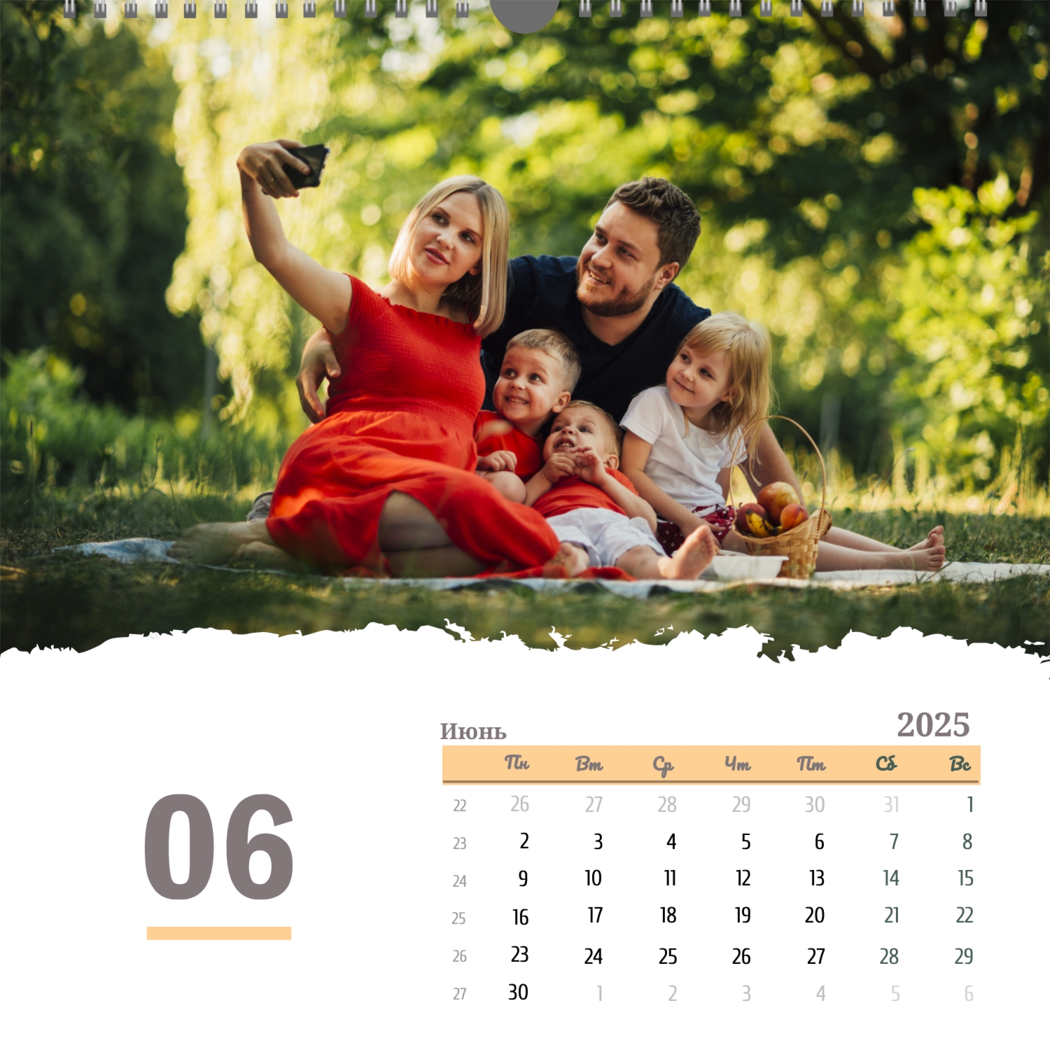 Календарь с фото семьи — это не просто практичный инструмент для планирования, но и теплое напоминание о самых близких людях. Уже готовый шаблон позволяет легко создать уникальный настенный квадратный календарь, который будет радовать вас круглый год. Такой шаблон идеально подходит для семей, желающих сохранить воспоминания, а также для профессионалов, которые ценят индивидуальность и хотят добавить личный акцент в свои проекты. Календарь с семейными фото может быть использован в самых разных сферах. Он станет отличным решением для педагогов и воспитателей, создающих персонализированные подарки для родителей. Фотографы могут предложить клиентам оригинальный способ сохранить снимки семейных съемок. Также он будет полезен дизайнерам и маркетологам, работающим над персонализированными продуктами для подарков или промоакций. В нашем онлайн-конструкторе вы можете добавлять свои фотографии, изменять расположение элементов, выбирать стиль шрифтов и даже подбирать цветовую гамму под свой вкус. В конструкторе предусмотрены удобные инструменты, чтобы вы могли максимально точно адаптировать календарь под свои потребности. Хотите оставить больше места для заметок или выделить важные даты? Это легко сделать благодаря гибкости настроек.