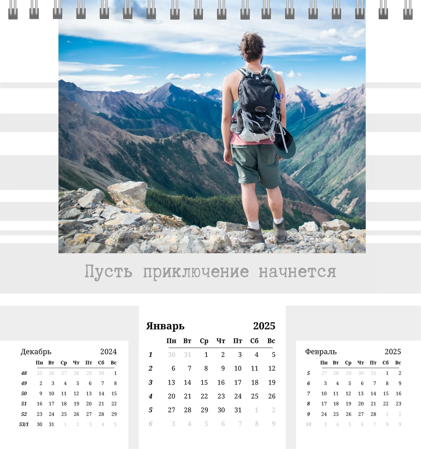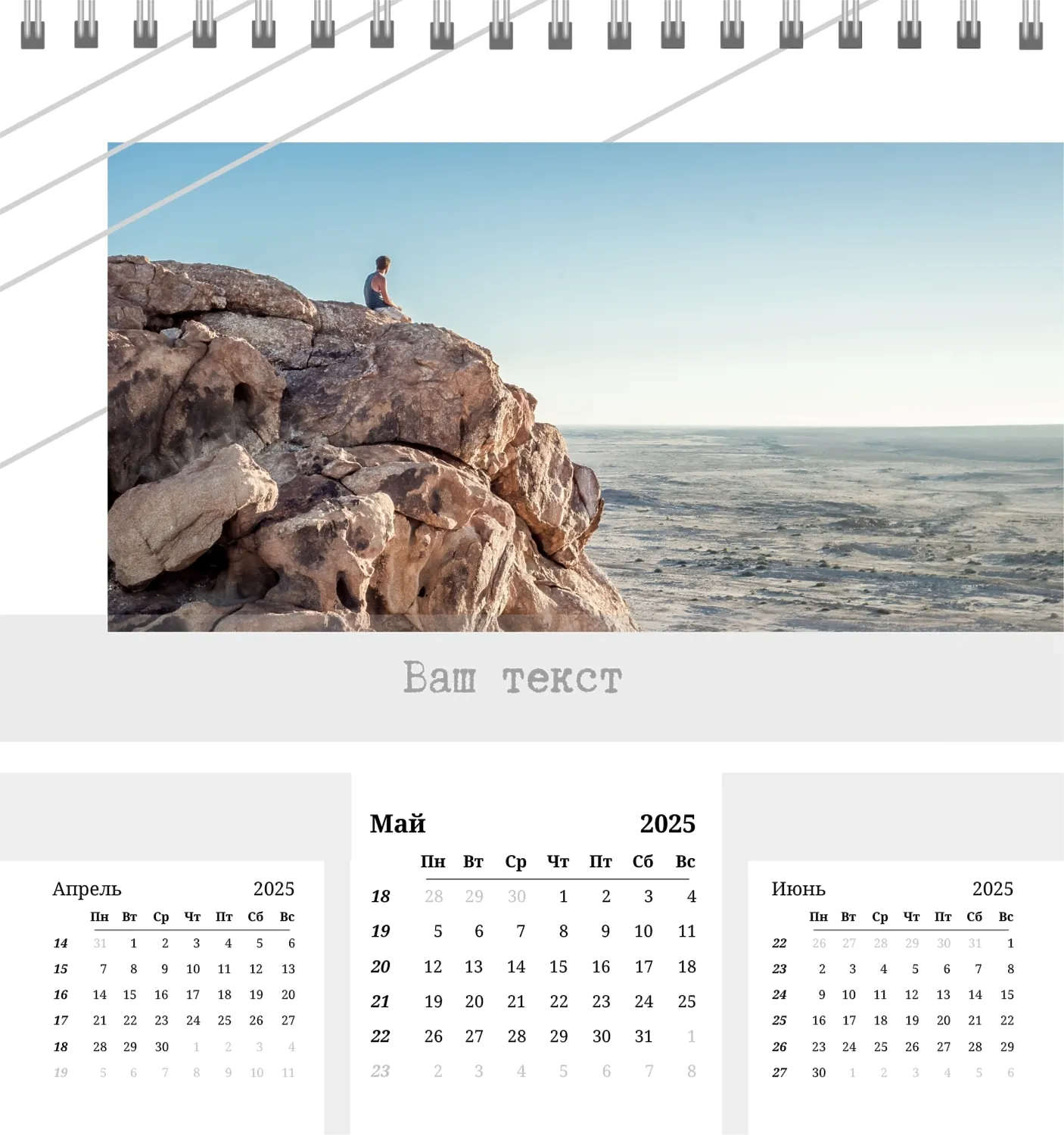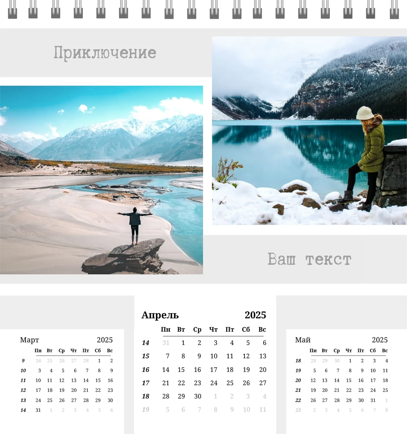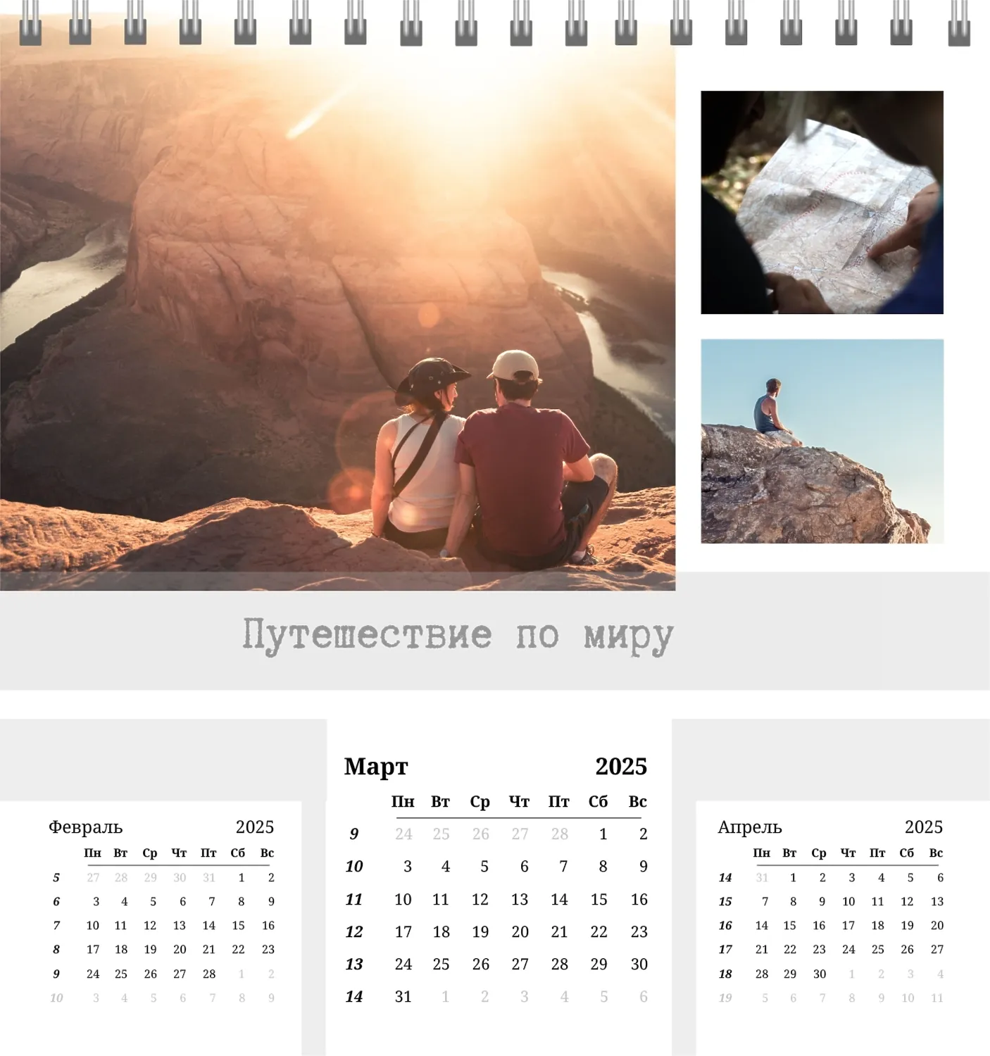 Готовый шаблон настольного календаря на 13 страниц с фото путешествий – это идеальный инструмент для создания персонализированного изделия, которое станет настоящим отражением вашей любви к открытиям и ярким моментам. Данный шаблон, разработанный в нашем онлайн-конструкторе, предлагает универсальную базу для оформления календаря с уникальными фотографиями, связанными с путешествиями. Вы можете легко добавлять свои фотографии, менять цвета и шрифты, добавлять заметки и памятные даты. Конструктор позволяет адаптировать шаблон под любые задачи и создать действительно уникальный продукт. Вам не нужно обладать специальными навыками дизайна — интерфейс прост и интуитивно понятен. Каждый элемент календаря можно настроить так, чтобы он полностью соответствовал вашим предпочтениям. Готовый шаблон настольного календаря на 13 страниц с фото путешествий — это способ воплотить вашу креативность в практичном и стильном изделии, которое будет радовать вас или ваших клиентов весь год.