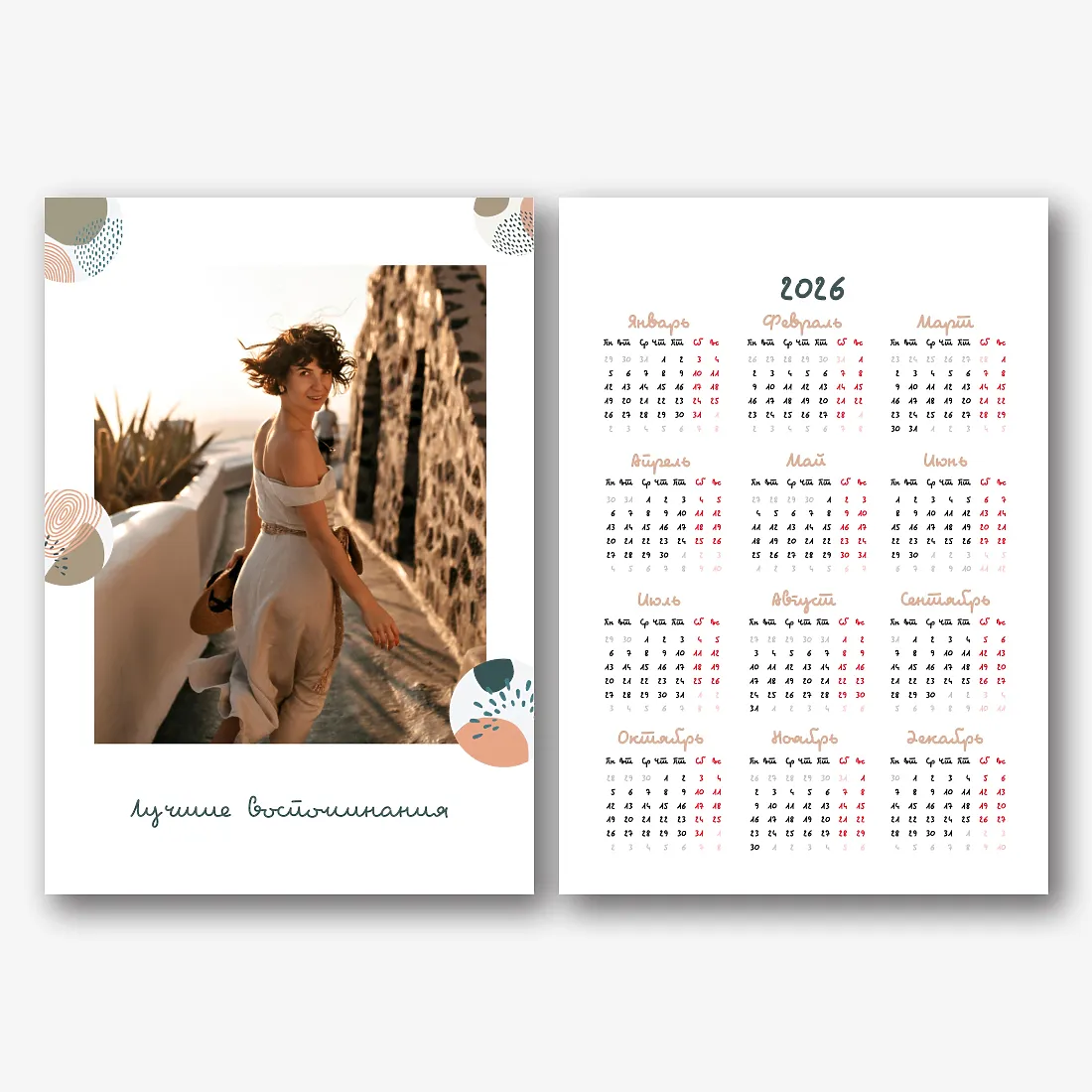 Готовый шаблон карманного календаря «Привет» создан для тех, кто любит современный и дружелюбный стиль в оформлении. В его дизайне сочетаются теплые оттенки, приятные типографические акценты и легкая праздничная атмосфера, которая помогает встретить новый год с вдохновением. В онлайн-конструкторе шаблон легко адаптируется под ваши задачи и стиль. Можно заменить фон на более спокойный или наоборот яркий, изменить расположение месяцев, выбрать другой стиль шрифтов, добавить иллюстрации, декоративные элементы или фотографии. Каждый месяц можно оформить по-своему: например, использовать фотографии коллектива, любимые семейные снимки или изображения проектов и работ. Также легко внести важные даты – корпоративные мероприятия, личные праздники, дедлайны или дни рождения близких.