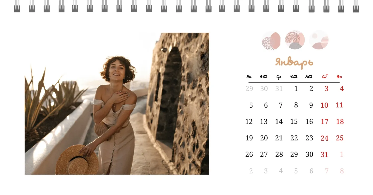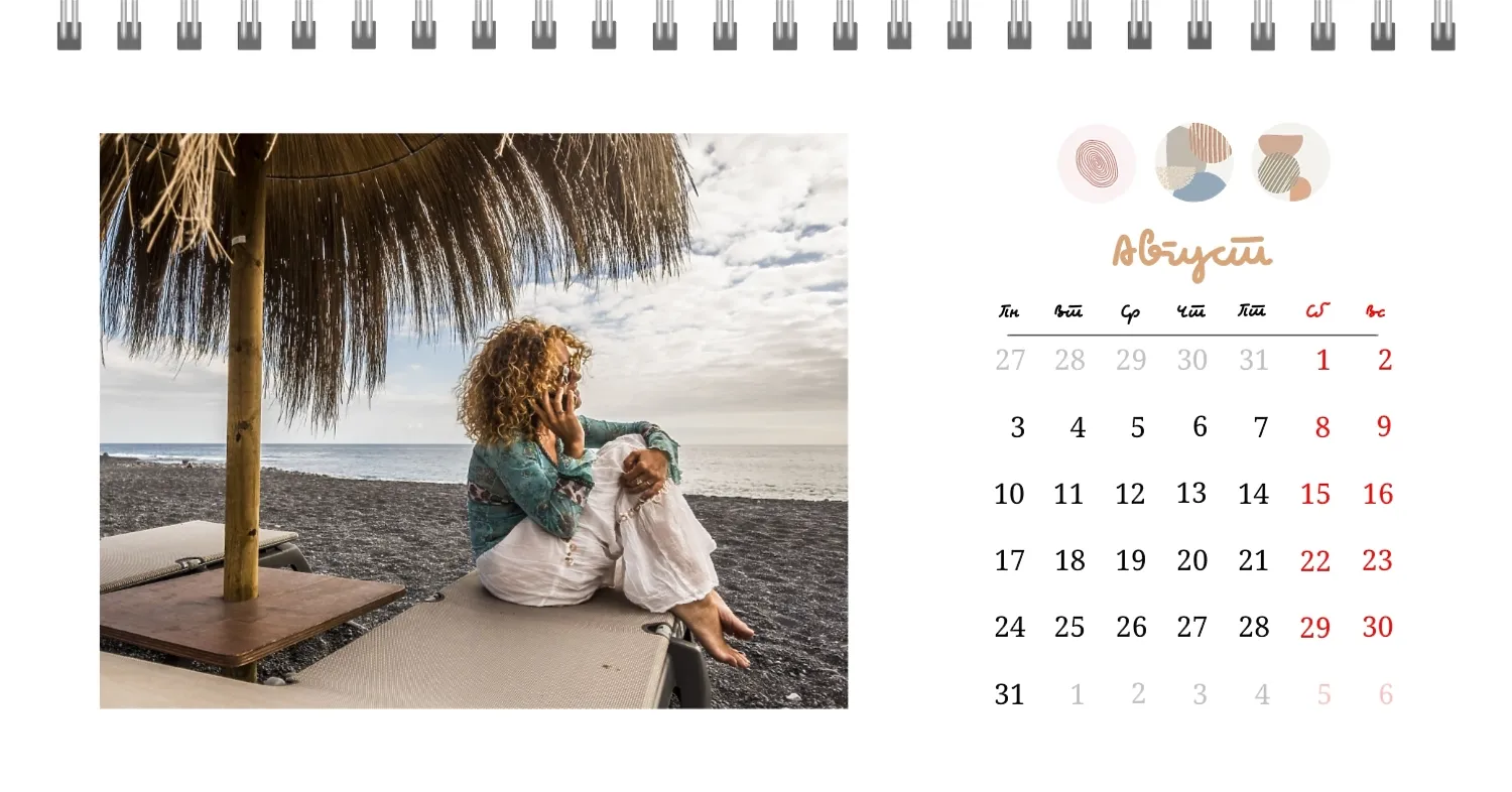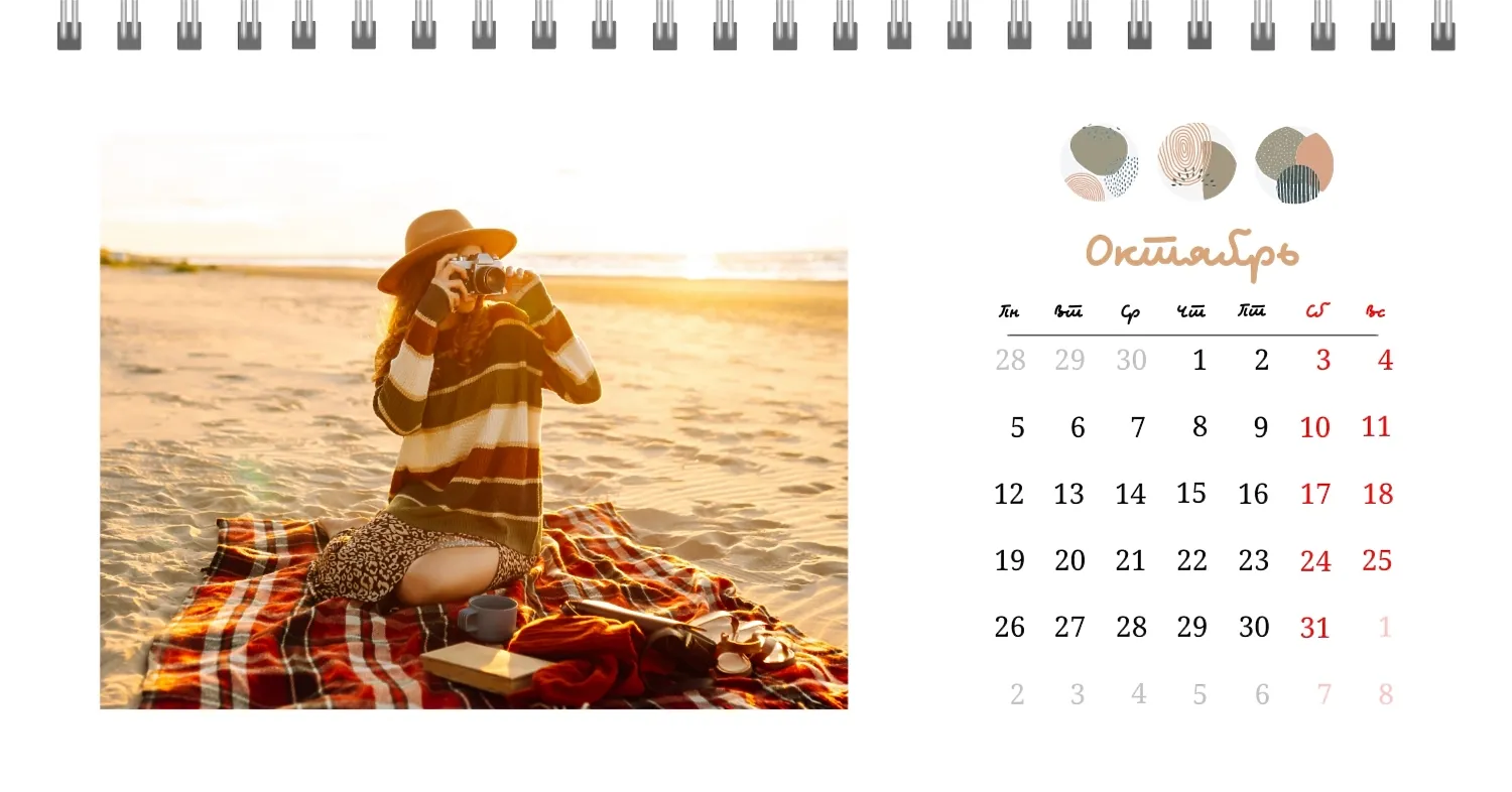 Готовый шаблон настольного перекидного горизонтального календаря «Воспоминания» создан для тех, кто ценит теплые моменты и хочет сохранить их в повседневной жизни. Его мягкая композиция, светлая палитра и аккуратные декоративные детали позволяют подчеркнуть атмосферу семейного уюта, путешествий, событий и дорогих сердцу встреч. Такой шаблон подходит родителям, учителям, фотографам, творческим студиям, владельцам небольших брендов, а также всем, кто хочет оформить личные или рабочие пространства с душевным акцентом. Он одинаково уместен и дома, и в офисе, и в студии — везде, где важны эмоции и визуальная эстетика. В онлайн-конструкторе этот календарь можно легко адаптировать под свой стиль. Каждую страницу можно наполнить собственными фотографиями — от семейных снимков до портретов учеников или кадров с мероприятий. Подписи и даты редактируются: вы можете изменить названия месяцев, добавить важные события, выделить дни рождения, памятные даты или культурные мероприятия вашей организации. Шрифты и цвета надписей также настраиваются, позволяя сделать календарь более ярким, более строгим или, наоборот, максимально нежным. При желании можно добавить логотип компании, слоган, контактную информацию или оставить дизайн полностью личным и домашним. Шаблон «Воспоминания» рассчитан на самостоятельное создание уникального календаря прямо в онлайн-конструкторе, без необходимости владеть профессиональными графическими программами. Всё редактирование происходит интуитивно и шаг за шагом, а результат будет выглядеть профессионально и гармонично. Такой календарь становится не просто украшением стен, а настоящей историей, которая будет напоминать о самом главном каждый день.