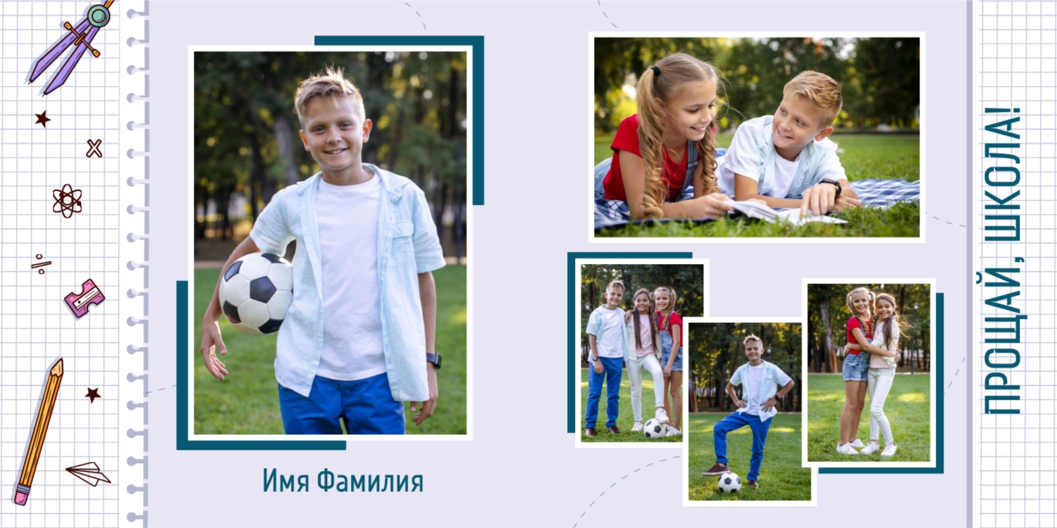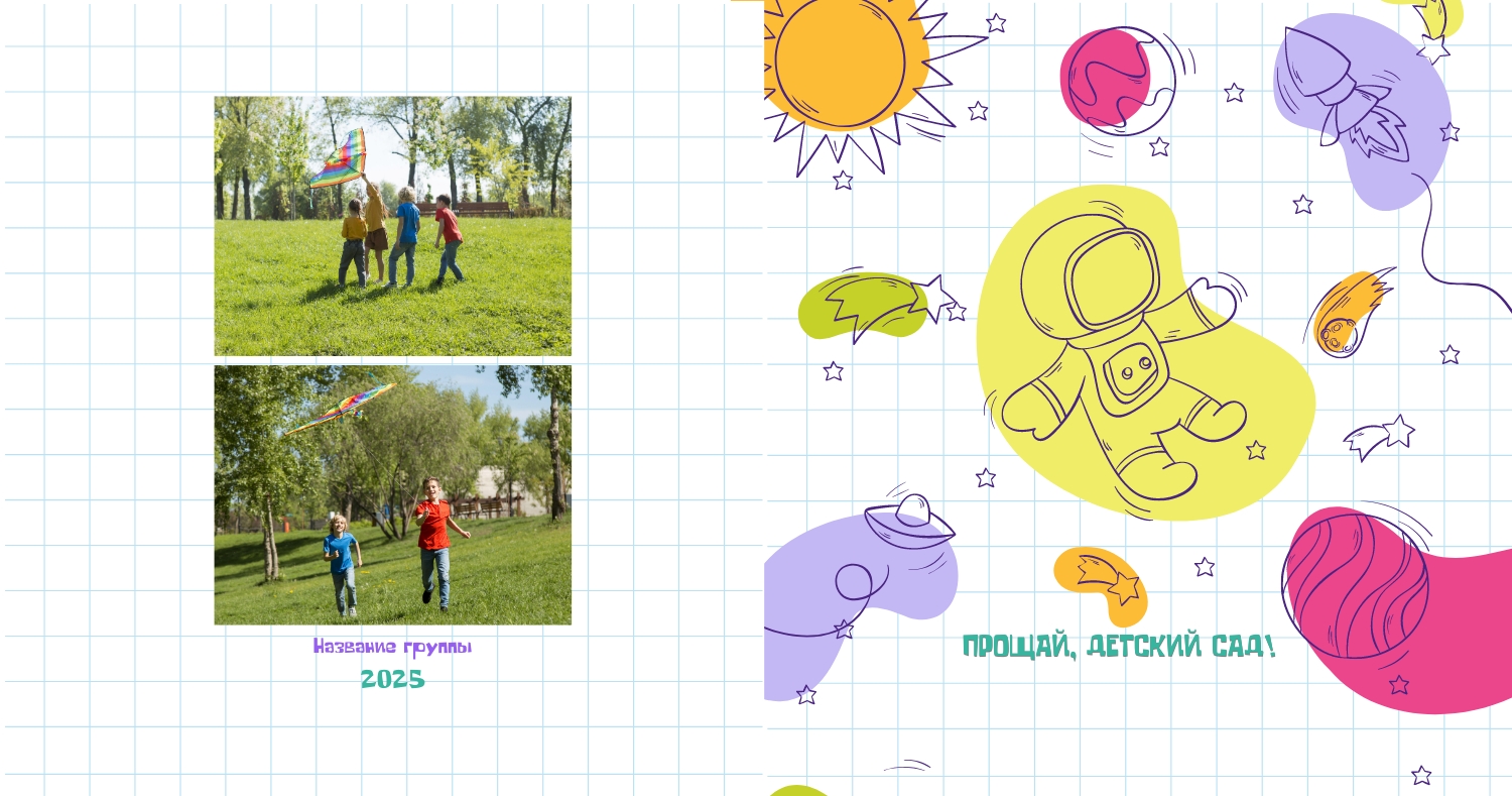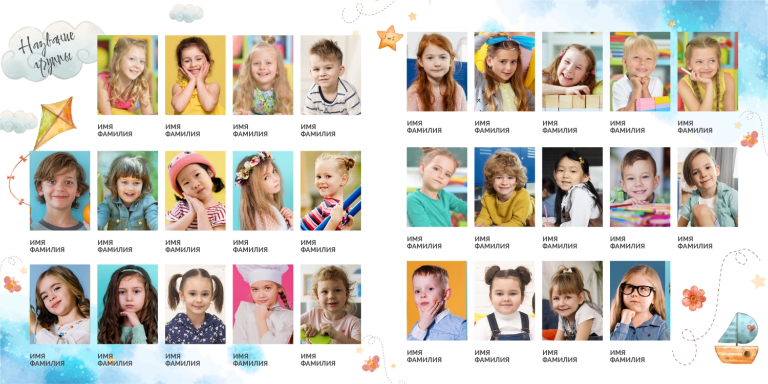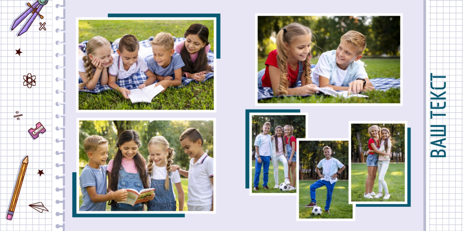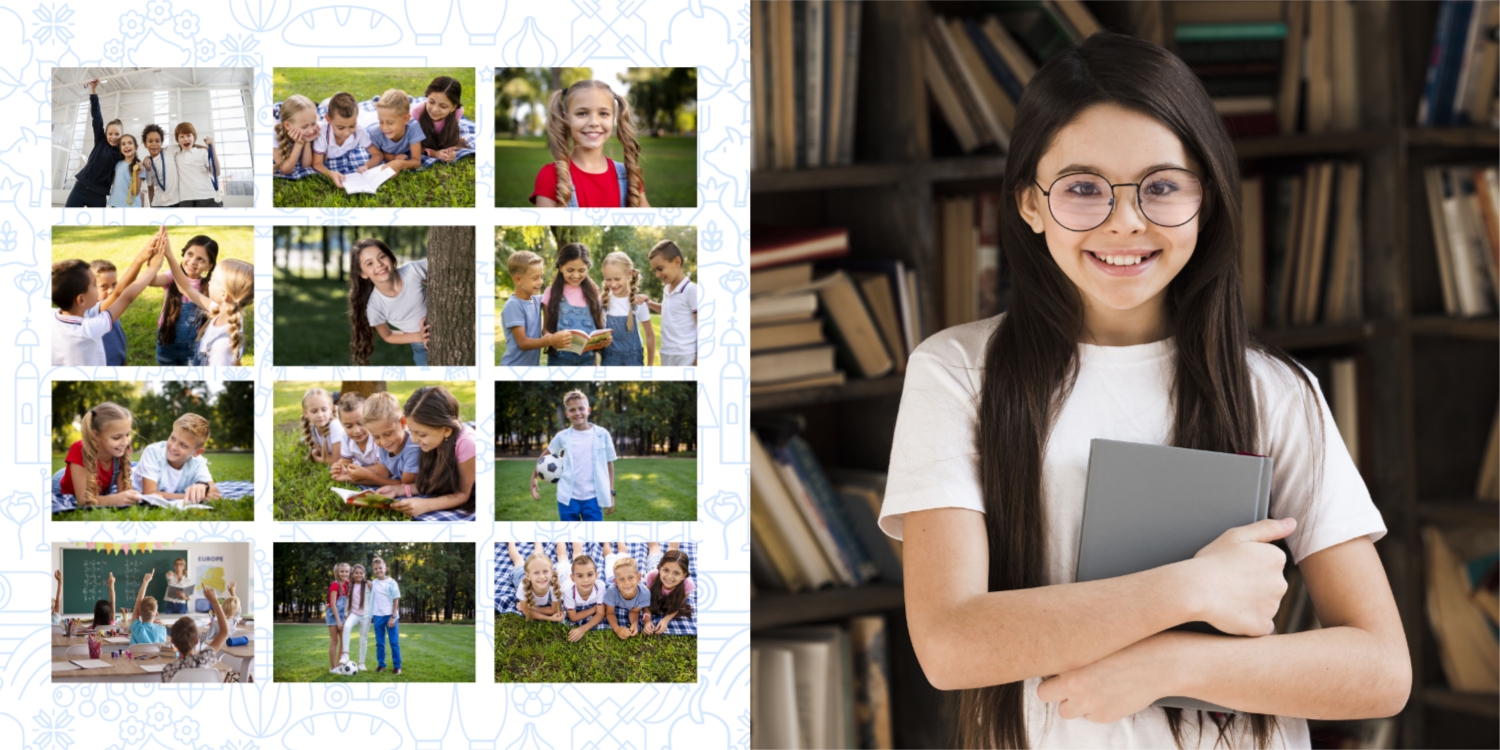 Выпускные панорамные книги — это фотокниги с разворотом на 180 градусов без сгиба, которые идеально подходят для сохранения воспоминаний о детском саде, школьных или лицеистских годах. Такой формат позволяет разместить снимки на весь разворот, не теряя ни одной детали — отличный выбор для групповых фото, постановочных кадров и ярких коллажей.
