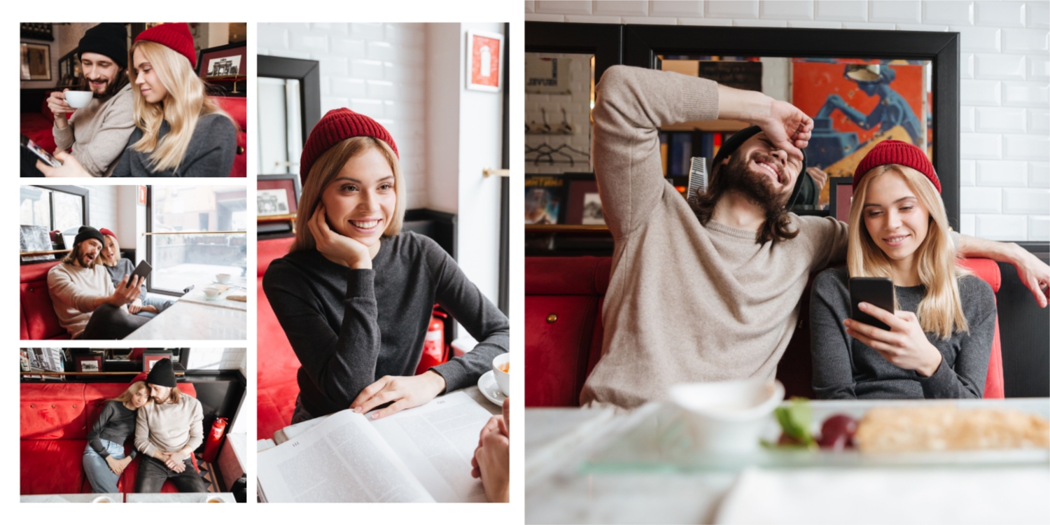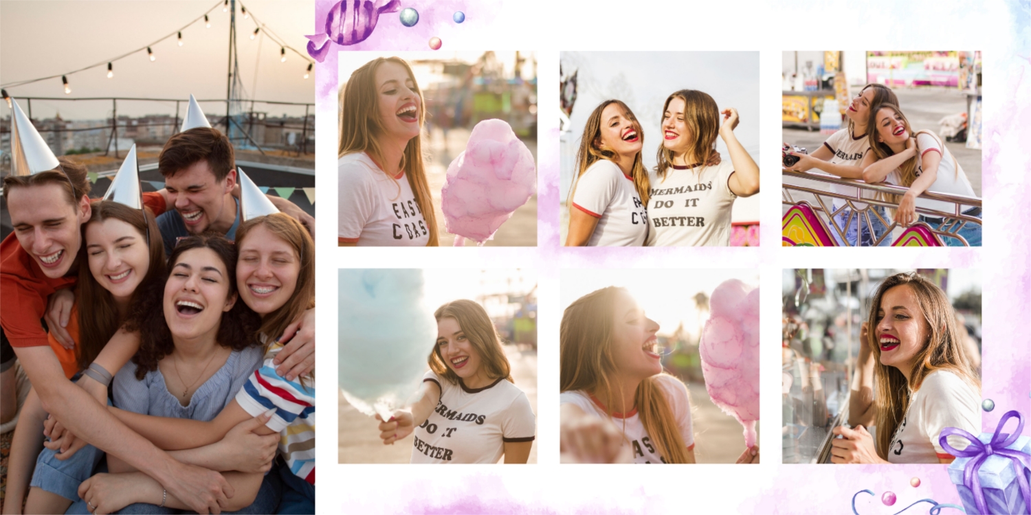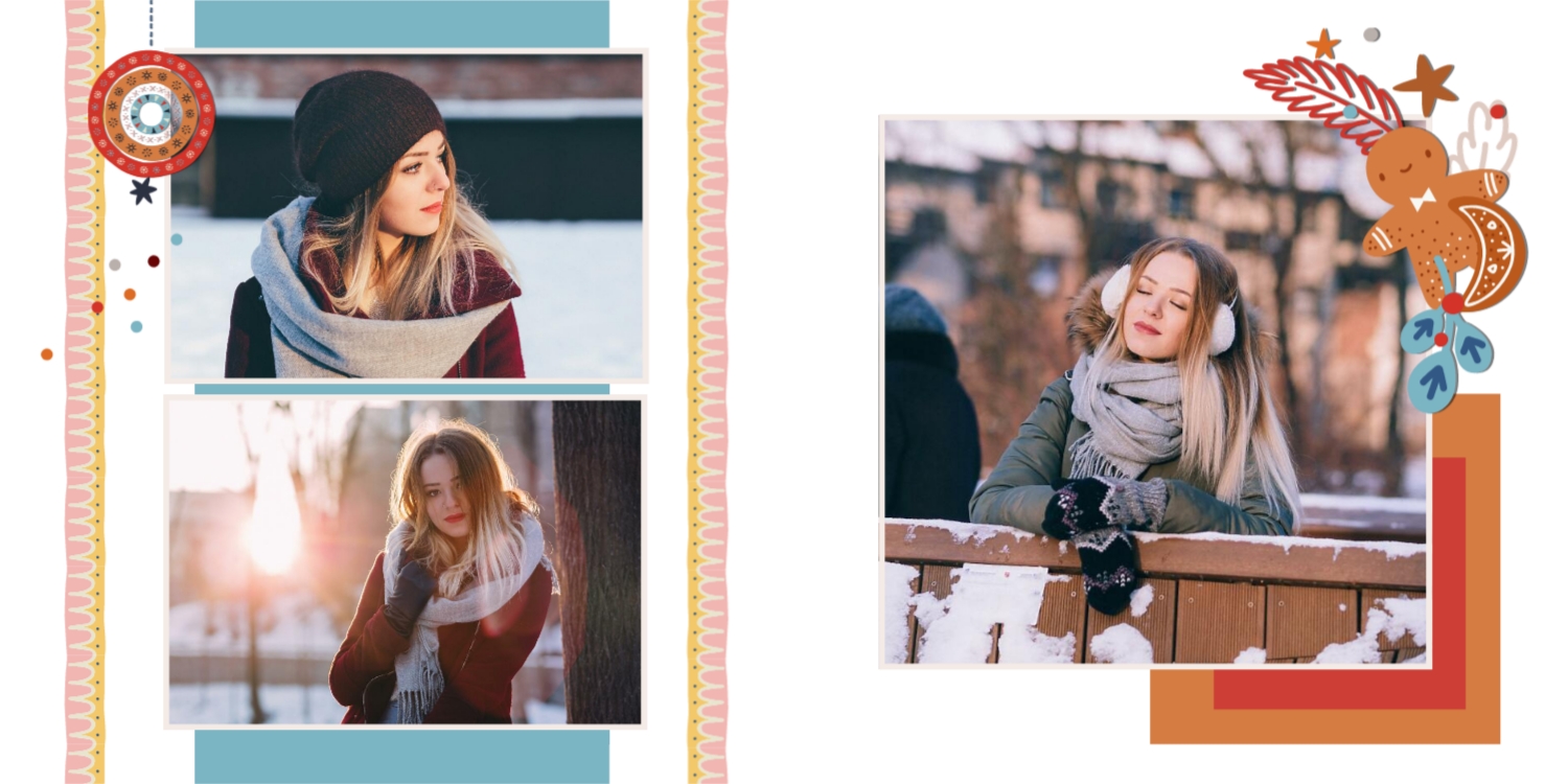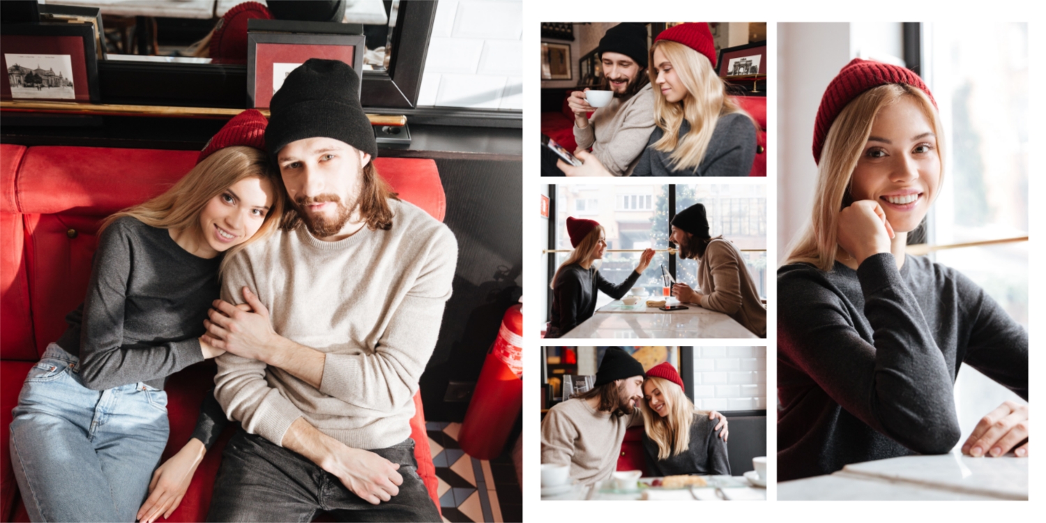Конструкція панорамної фотокниги дозволяє їй відкриватися на 180 градусів – так її дуже зручно переглядати. Групові фотографії й великі пейзажні знімки ніби спеціально створені для панорамної фотокниги. Але на розворотах дуже виграшний вигляд мають колажі, створені з різних за формою й розмірами фотографій.