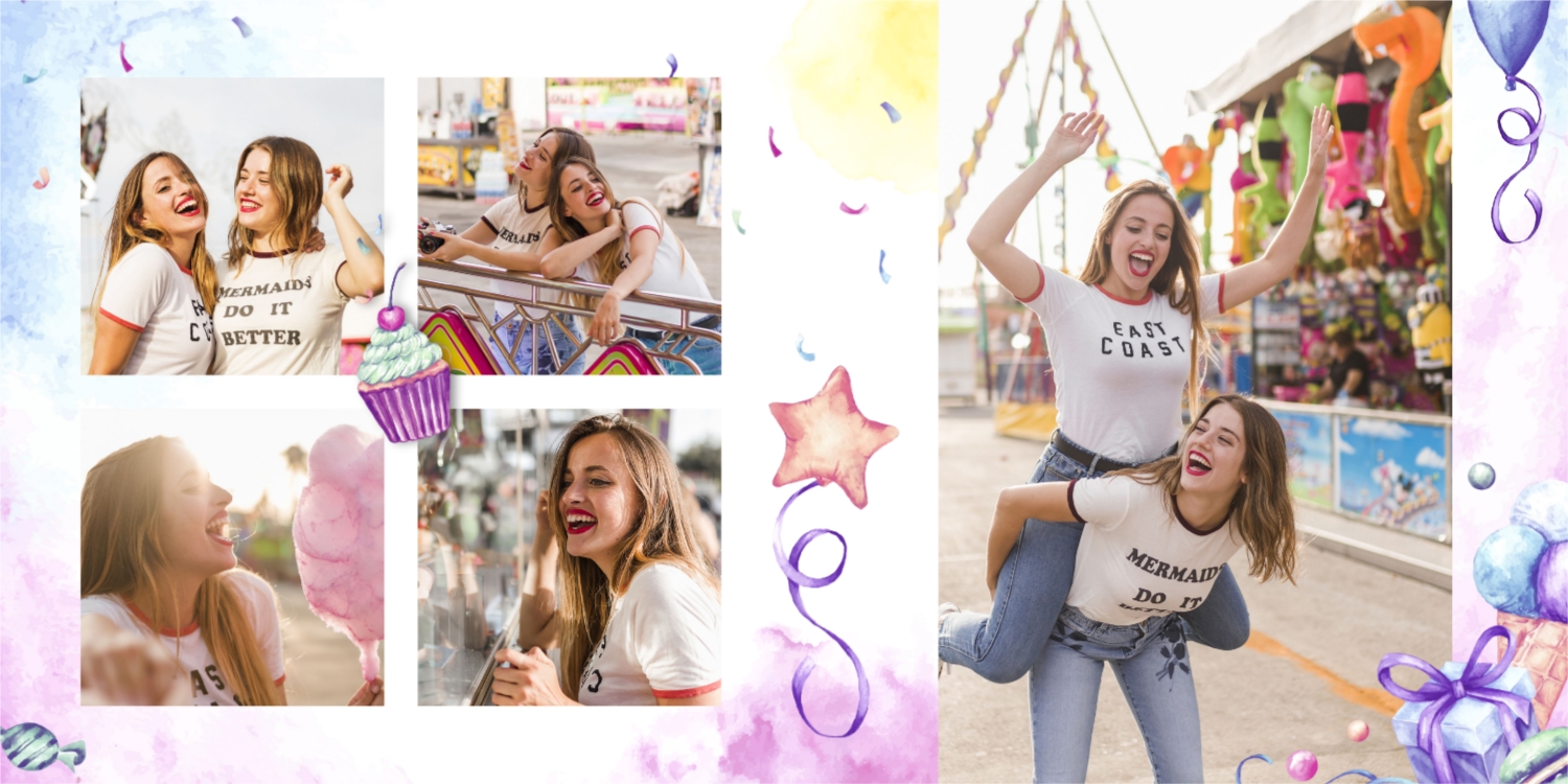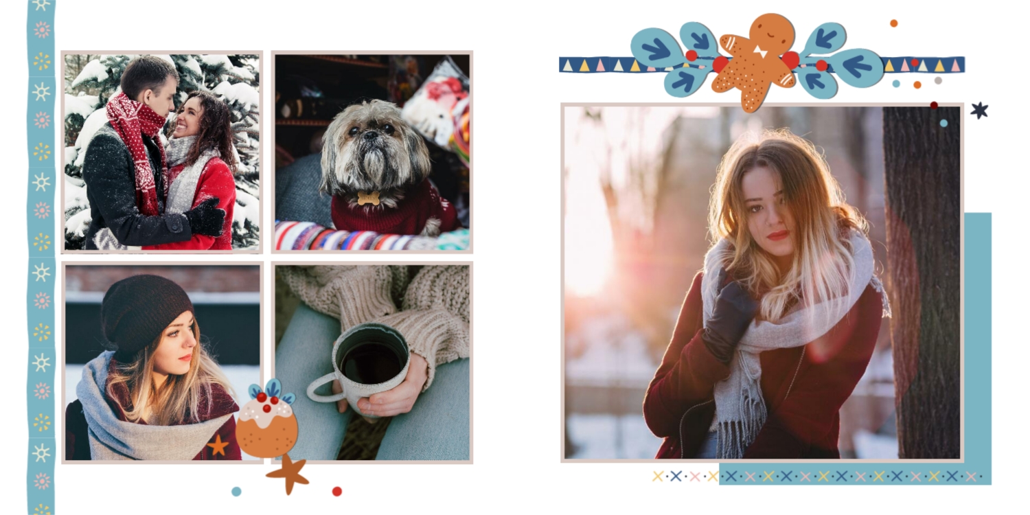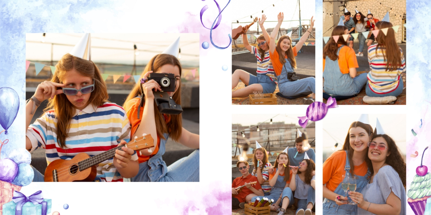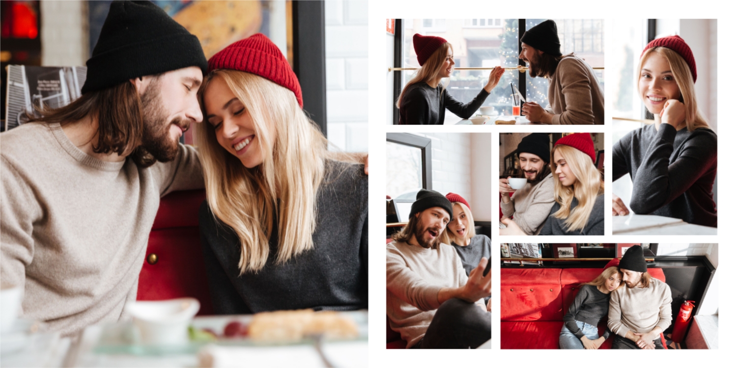 Конструкція панорамної фотокниги дозволяє їй відкриватися на 180 градусів – так її дуже зручно переглядати. Групові фотографії й великі пейзажні знімки ніби спеціально створені для панорамної фотокниги. Але на розворотах дуже виграшний вигляд мають колажі, створені з різних за формою й розмірами фотографій.