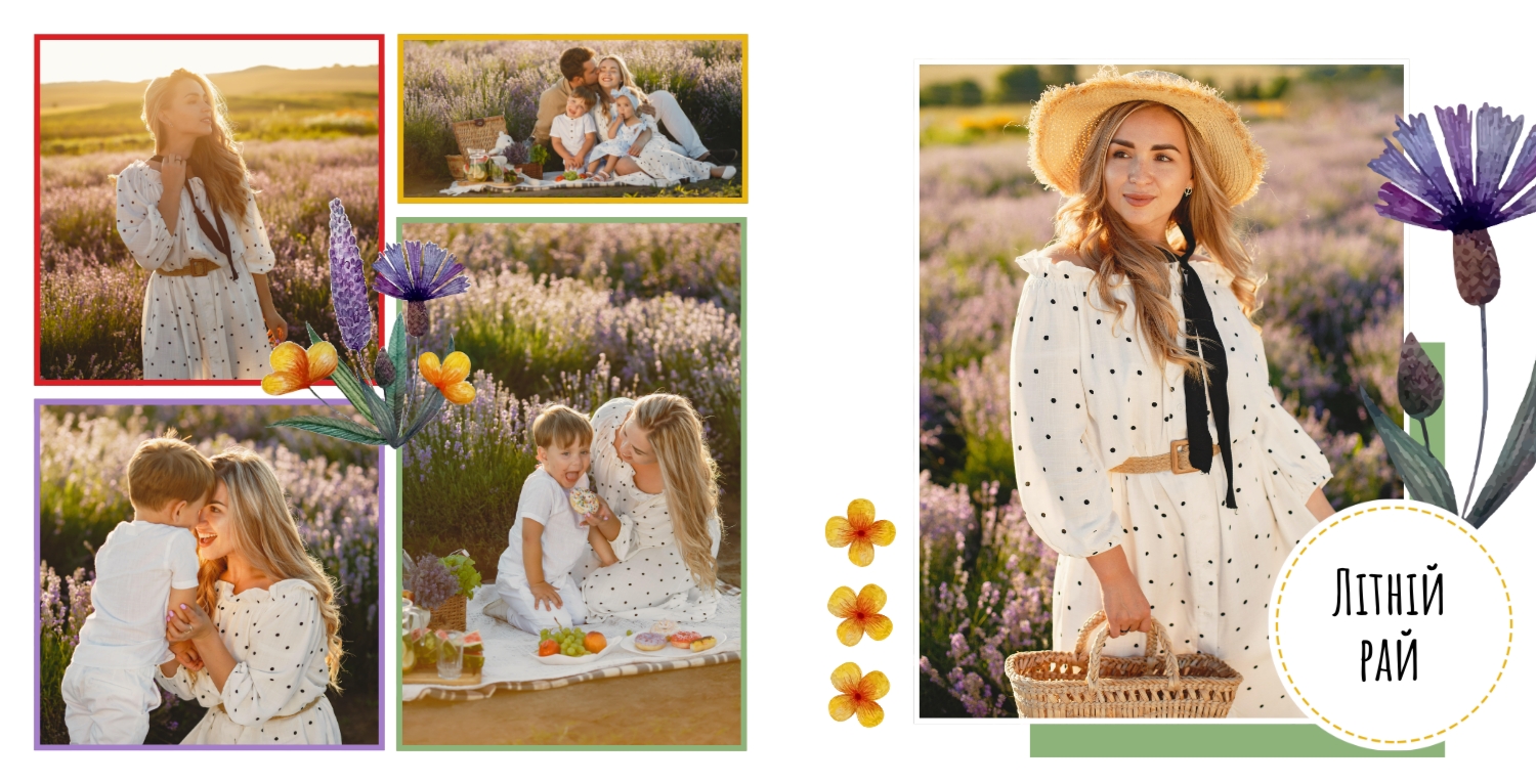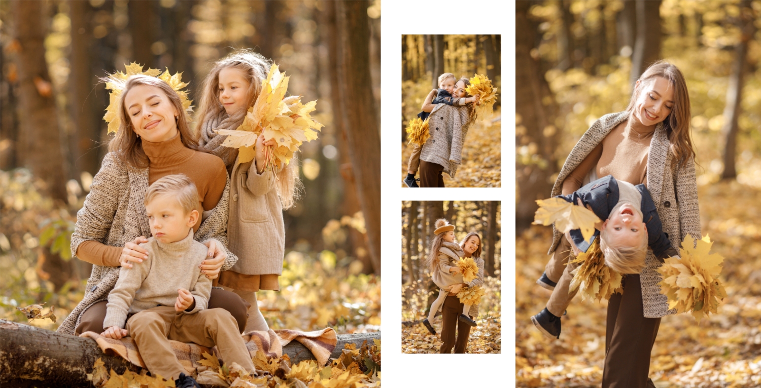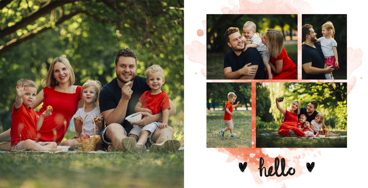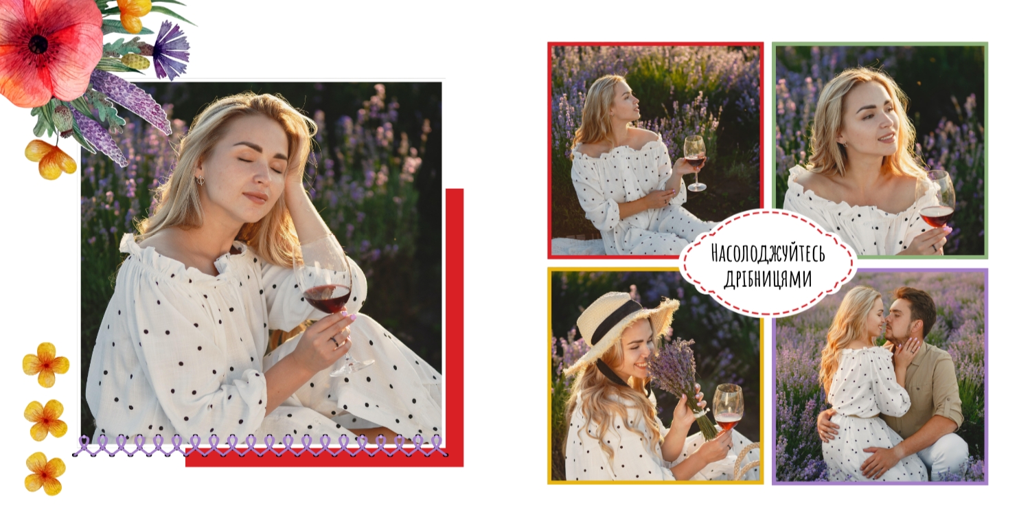 Майте на увазі, що фотокнига в твердій обкладинці має стандартний книжковий перепліт, тобто частина вмісту сторінки йде в корінець. Тому ми не рекомендуємо використовувати панорамні знімки на весь розворот. Для цієї мети є інший вид фотокниг – панорамні фотокниги.