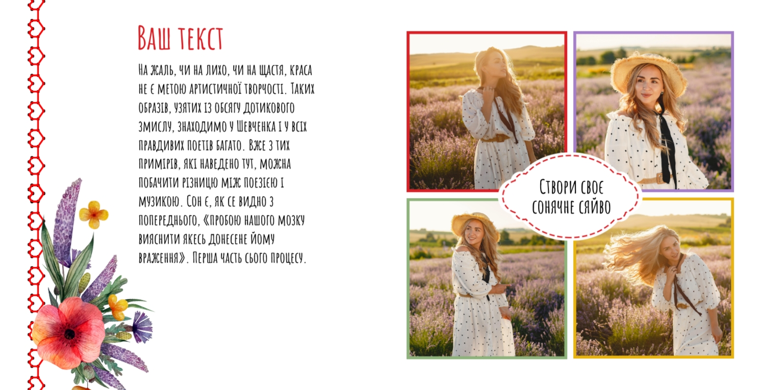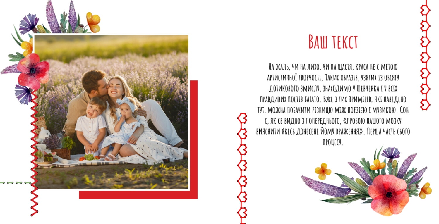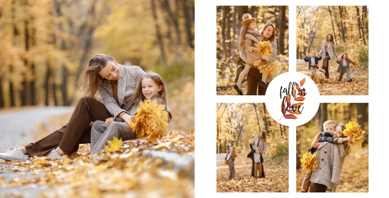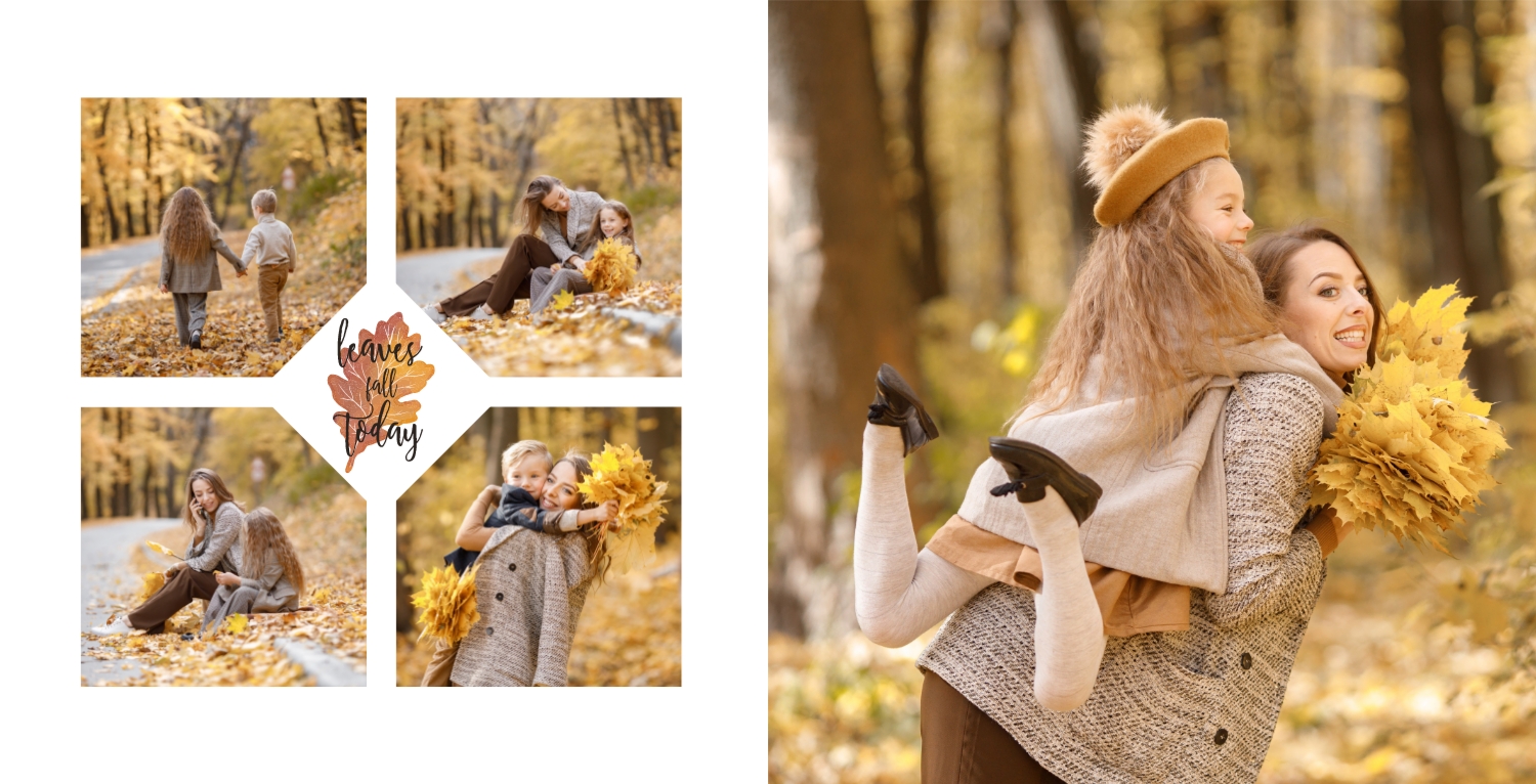 Майте на увазі, що фотокнига в твердій обкладинці має стандартний книжковий перепліт, тобто частина вмісту сторінки йде в корінець. Тому ми не рекомендуємо використовувати панорамні знімки на весь розворот. Для цієї мети є інший вид фотокниг – панорамні фотокниги.