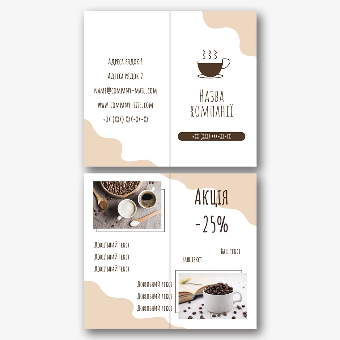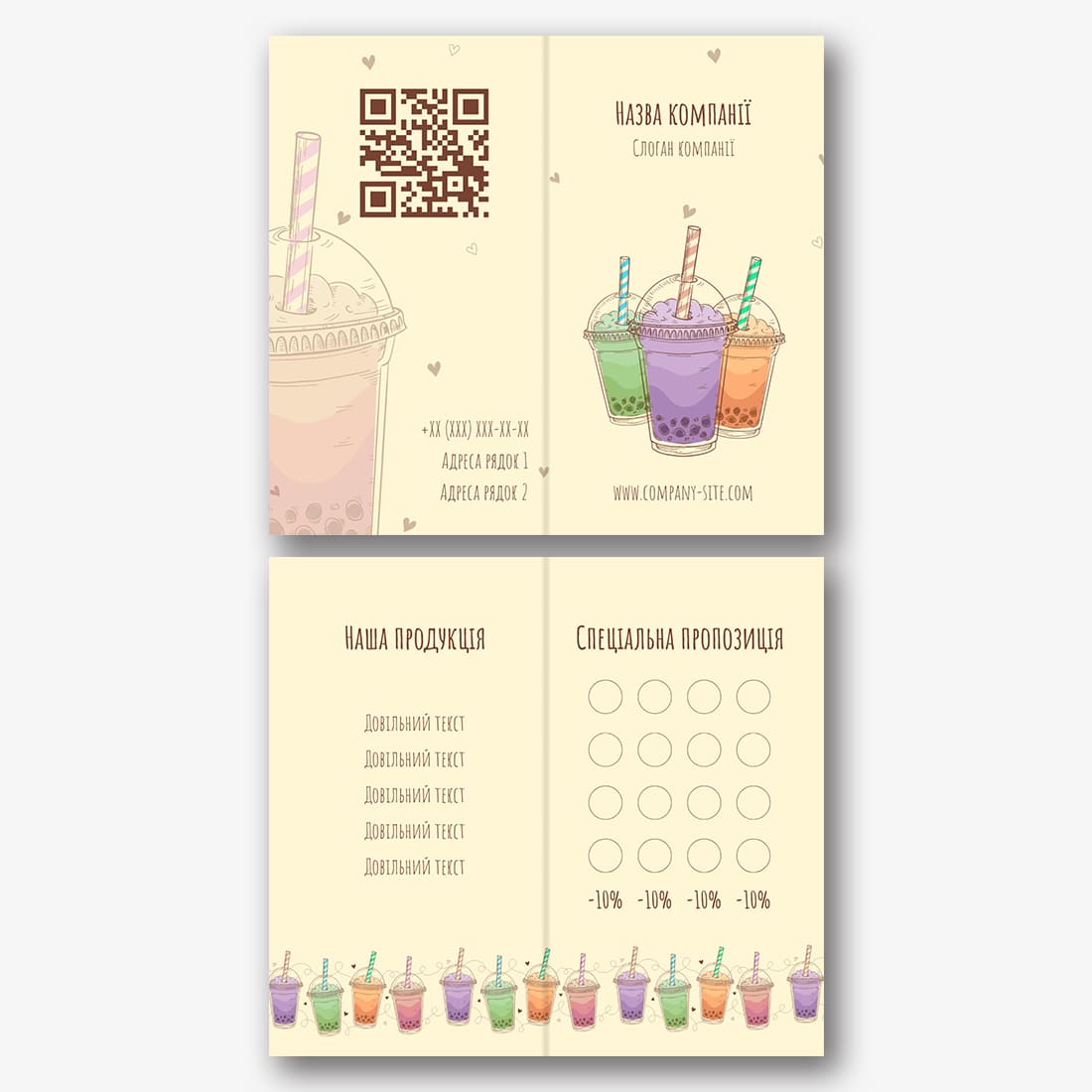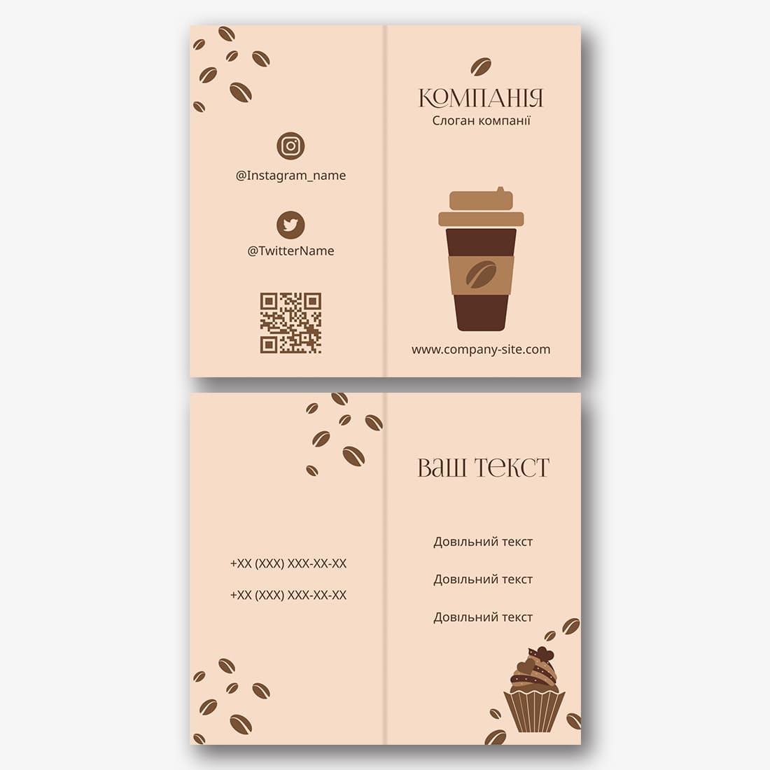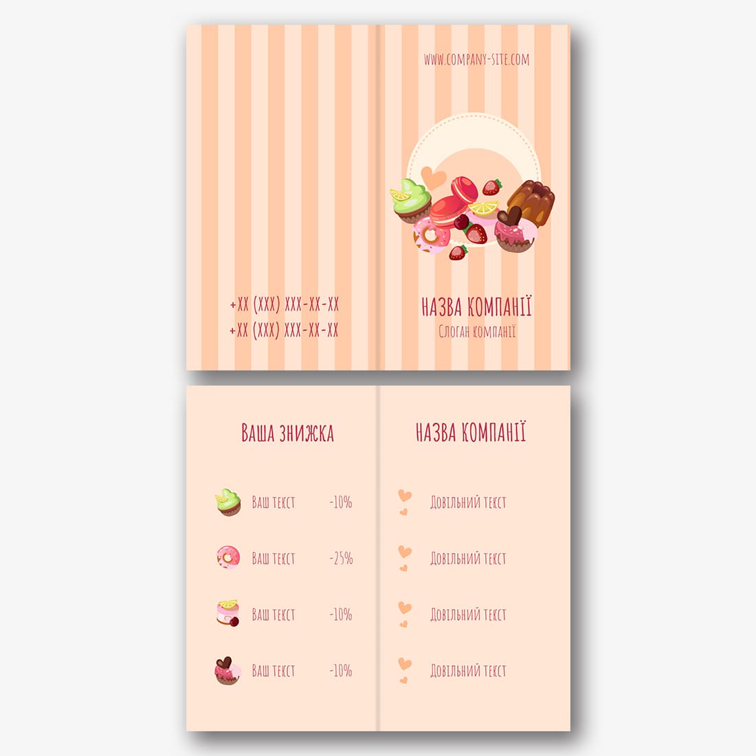 Безкоштовний шаблон подвійної візитки для кафе пончиків донатс, кондитерів, кондитерських. Створіть макет своїми руками в конструкторі візиток.