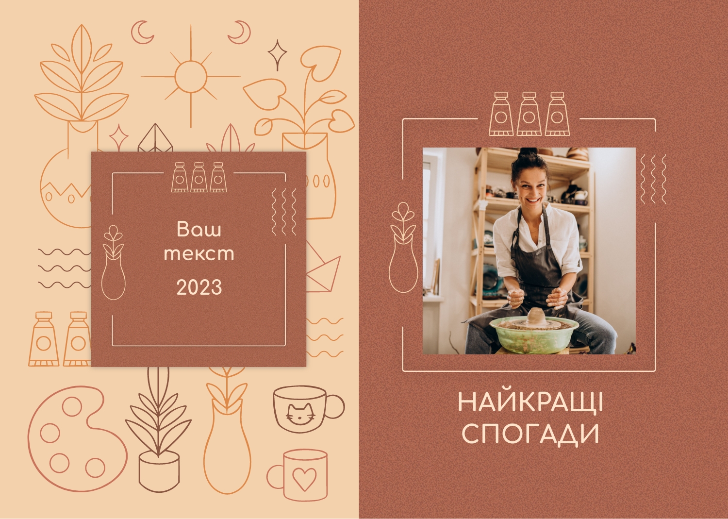 Шаблон фотокниги "кращі спогади з гончарства" являє собою ідеальну основу для збереження і вироби ваших незабутніх моментів, пов'язаних з майстерністю в гончарній справі. Цей альбом є винятковою формою, що дозволяє уособити вашу любов до глини і створення унікальних керамічних творів. На обкладинці фотокниги ми пропонуємо помістити зображення вашого найулюбленішого гончарного шедевра. Це може бути чашка, ваза або будь-який інший предмет, який ви створили своїми руками. Навколо цього зображення можна додати декоративні елементи в стилі гончарства, такі як глиняні візерунки або фрагменти непокритою глазур'ю. Для додання особистого штриха в фотокнизі ви можете включити знімки ваших рук в процесі роботи, підкреслюючи, яким творчим процесом є гончарство. Ці фотографії можуть ілюструвати етапи створення, починаючи з шматка глини і закінчуючи закінченим виробом. Використовуючи цей шаблон в нашому онлайн-конструкторі, ви зможете створити унікальну вертикальну фотокнигу в твердій обкладинці, яка стане не тільки дорогоцінним артефактом у вашій колекції, але і чудовим подарунком для друзів і близьких, ділячись з ними вашими кращими моментами зі світу гончарства.