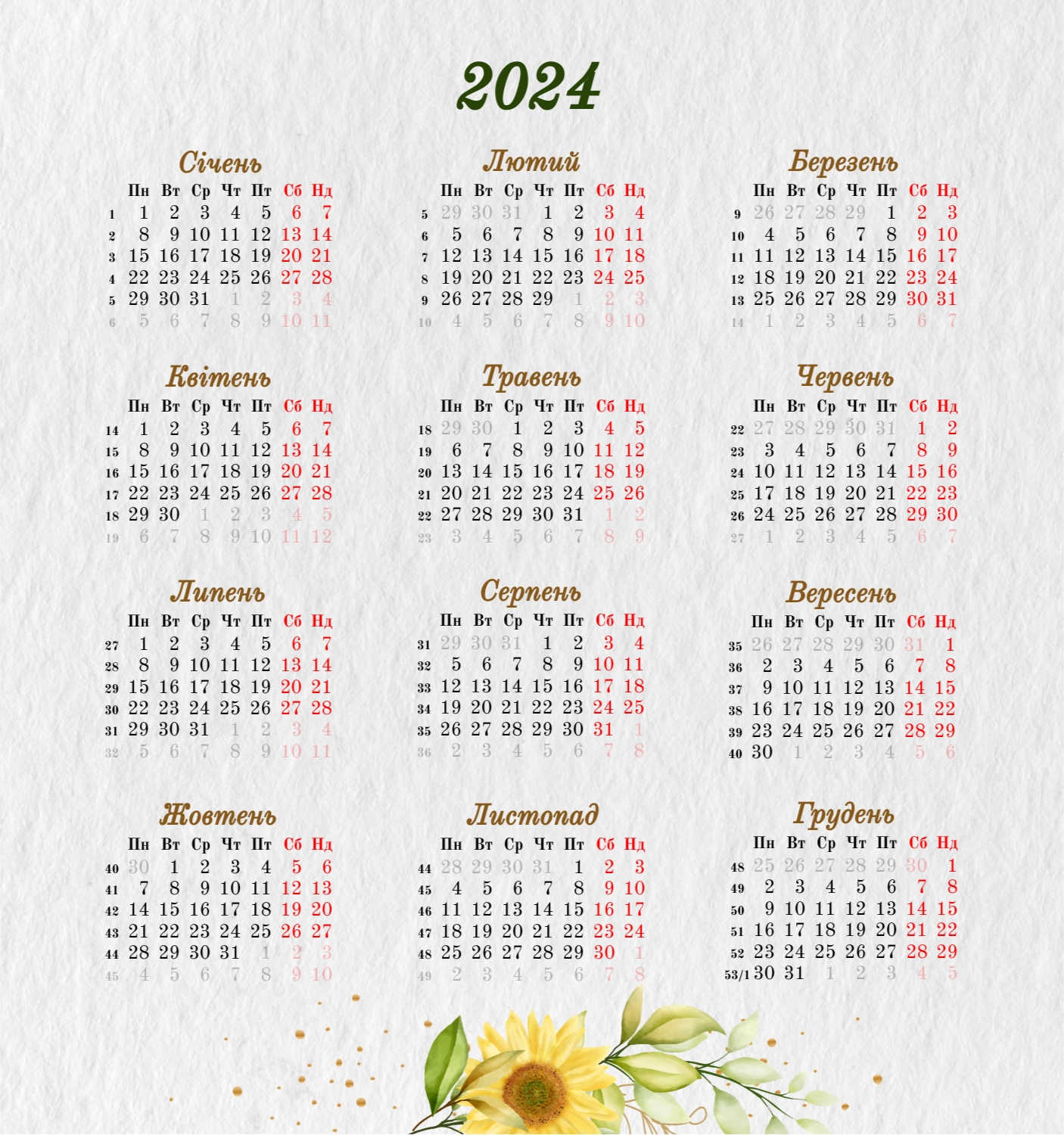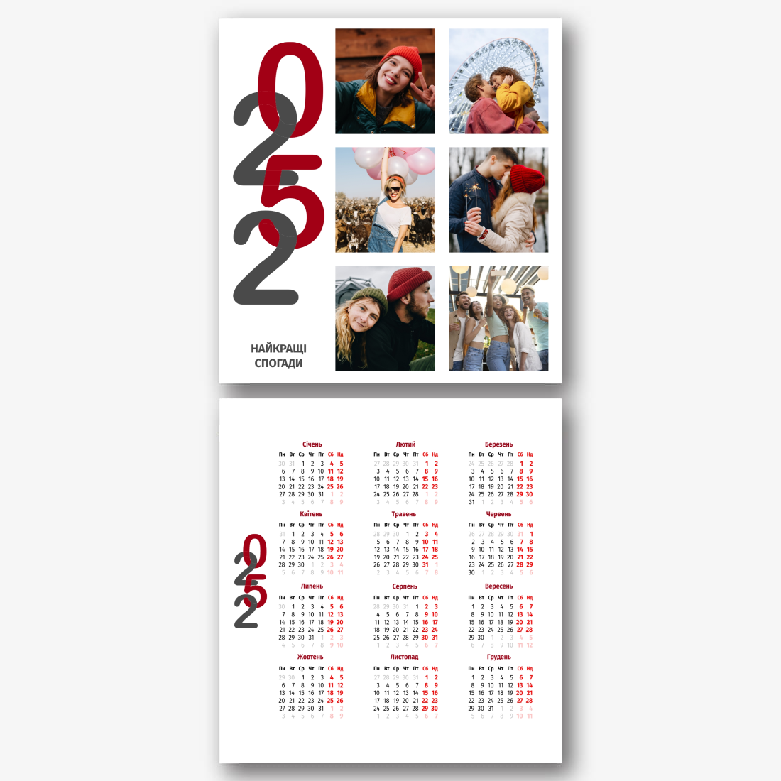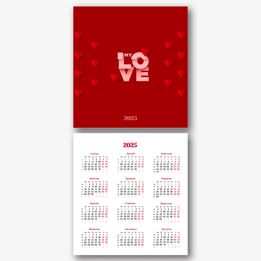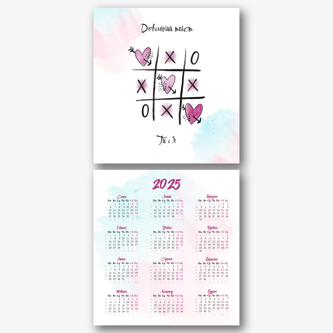 Шаблон, який ми надаємо, натхненний українською традицією вишивки та національними візерунками. На кожній сторінці календаря ви знайдете ніжні та стильні зображення, які створять атмосферу затишку та любові. Яскраві вишиванки, символи кохання, візерунки - все це доступно для редагування та адаптації під ваші уподобання. У нашому онлайн-конструкторі ви зможете змінювати кольори, розміри та розташування елементів. Додавайте персональні фотографії, щоб зробити календар ще більш індивідуальним. Ви також можете вписувати свої власні побажання, цитати або навіть любовні записки. Особливу увагу приділено зручності використання. Наші інструменти дають змогу легко переміщати, обертати та змінювати елементи дизайну, щоб кожна сторінка відповідала вашому баченню ідеального календаря. Можливості редагування тексту дозволять вам підписувати дні особливими подіями або важливими датами. Наш онлайн-конструктор надає вам усі необхідні інструменти для того, щоб створити унікальний настільний календар, який буде не тільки практичним аксесуаром, а й зворушливим проявом ваших почуттів.