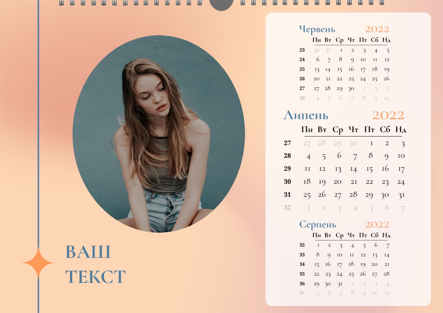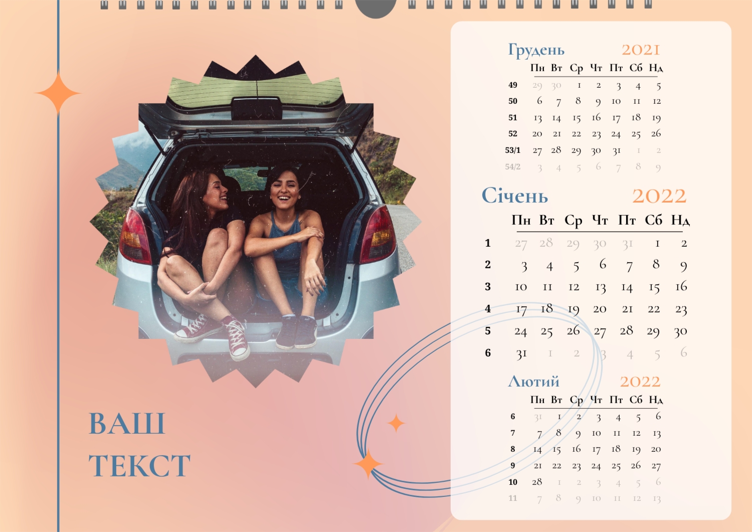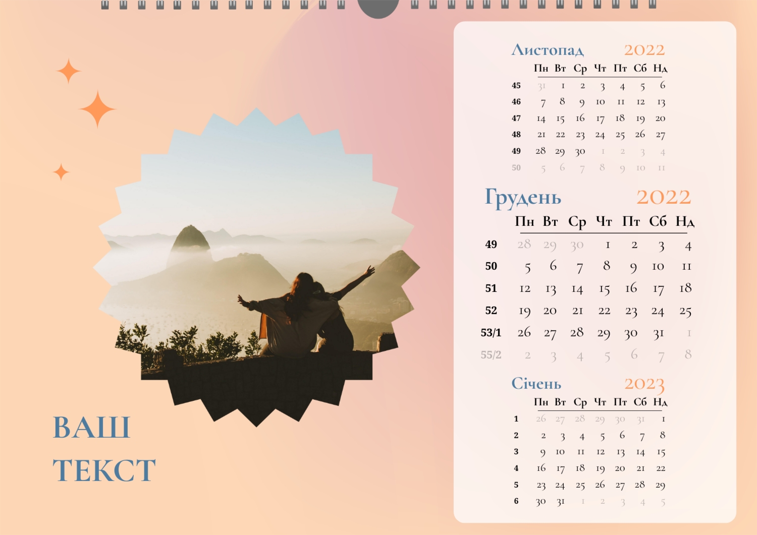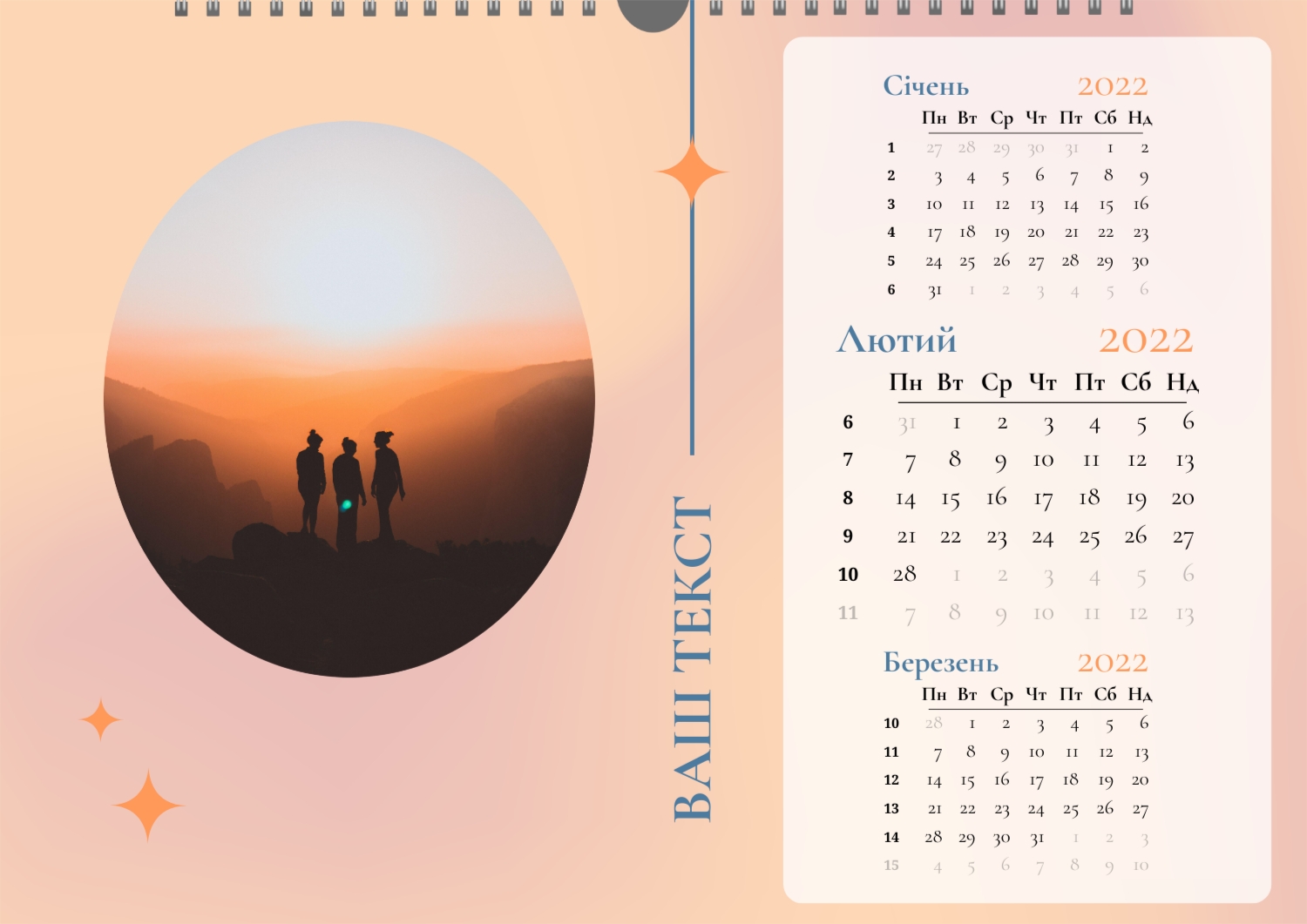 Шаблон "кращі спогади" для настінного широкого календаря в нашому онлайн-конструкторі надає унікальну можливість втілити в життя ваші найяскравіші моменти. Натхненний теплими спогадами, цей шаблон створений для того, щоб ви могли легко і креативно оформити свій календар. З увагою до деталей і легкості у використанні, наш онлайн-конструктор дозволяє вам кастомізувати кожен елемент цього шаблону. Ви можете змінювати кольори, шрифти, додавати свої фотографії та текст, роблячи кожен місяць неповторним. Персоналізований дизайн стане відображенням вашого унікального стилю і спогадів. Створення свого унікального горизонтального настінного календаря з використанням шаблону "кращі спогади" в нашому онлайн-конструкторі — це можливість не тільки зберегти дорогоцінні моменти, але і висловити свою індивідуальність через творчий процес дизайну. Святкуйте кожен день, вдихаючи життя у свої спогади, і створіть календар, який буде радувати вас цілий рік.