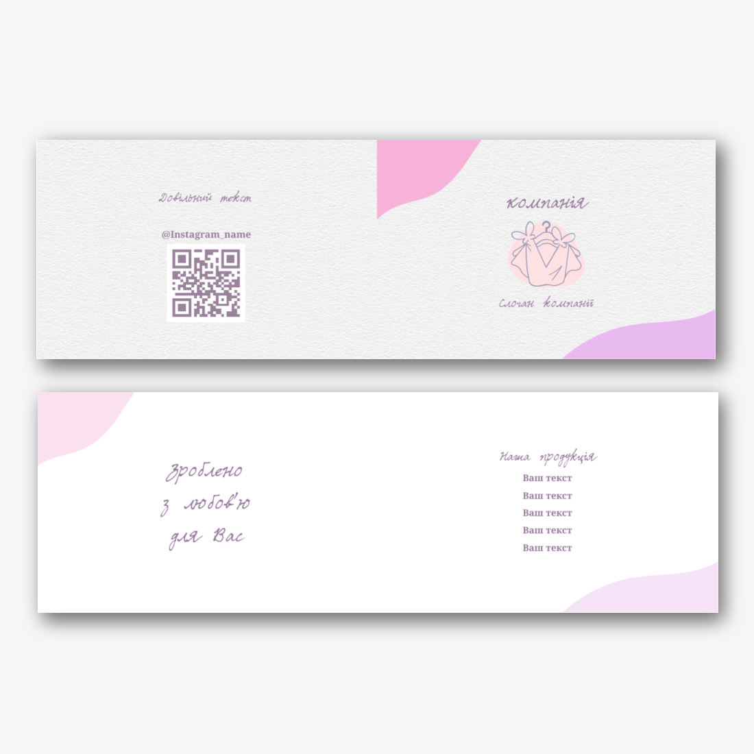 Бирка-книжка для одягу-це універсальний інструмент, який підходить для різних професіоналів і сфер діяльності. Вона використовується як в дрібному роздрібному бізнесі, так і у великих виробничих компаніях. Цей шаблон дозволяє створити унікальні бирки-книжки, які не тільки інформують про продукт, але і сприяють впізнаваності бренду. Онлайн-конструктор надає широкі можливості для редагування. Ви можете налаштувати дизайн відповідно до корпоративного стилю вашої компанії: вибрати кольори, шрифти, додати логотип або зображення, включити контактну інформацію або додаткові дані про продукт. Використання онлайн-конструктора робить процес створення бирки-книжки простим і доступним. Ви можете самостійно контролювати кожен аспект дизайну, а також моментально бачити результати в реальному часі, що економить час і спрощує процес розробки. Таким чином, шаблон довгої бирки-книжки для одягу в онлайн-конструкторі являє собою ідеальне рішення для тих, хто цінує індивідуальність і якість в кожній деталі продукції.