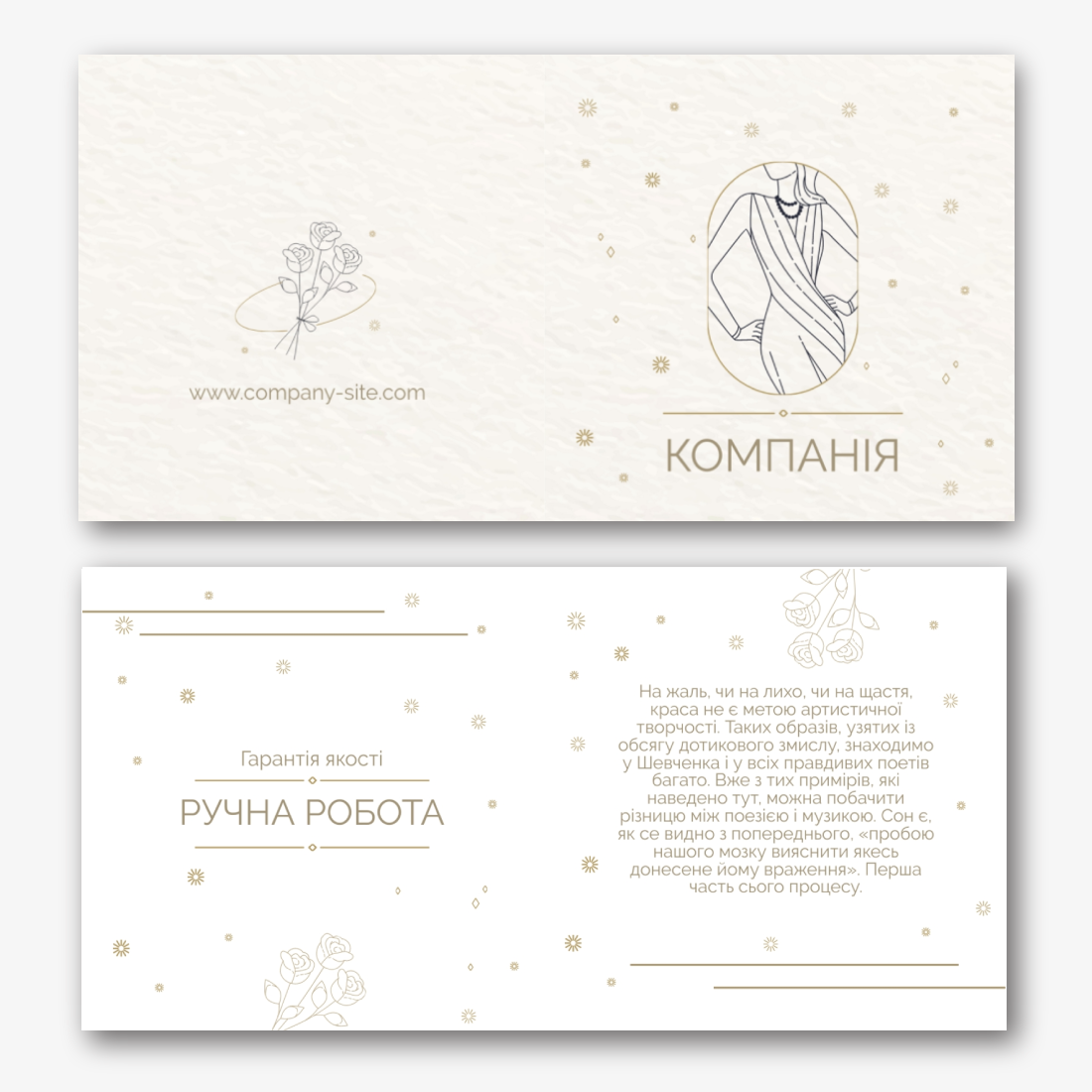 Готовий шаблон квадратної бирки-книжки для одягу-це ідеальний інструмент для тих, хто прагне додати індивідуальність і професіоналізм в свою продукцію. Цей шаблон прекрасно підходить для дизайнерів одягу, модельєрів, власників бутиків, а також для всіх, хто займається пошиттям і продажем текстильних виробів. Бирка-книжка являє собою мініатюрний буклет, який може містити інформацію про бренд, інструкції по догляду, склад тканини та інші важливі відомості для клієнтів. У нашому онлайн-конструкторі користувачі можуть створювати унікальні квадратні бирки-книжки своїми руками, повністю адаптуючи їх під свої потреби і стиль бренду. В онлайн-конструкторі ви можете змінювати текст, додавати логотипи, вибирати шрифти і їх розмір, а також використовувати різні колірні схеми.