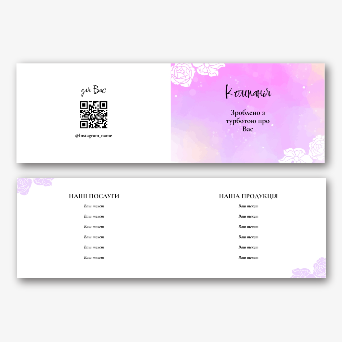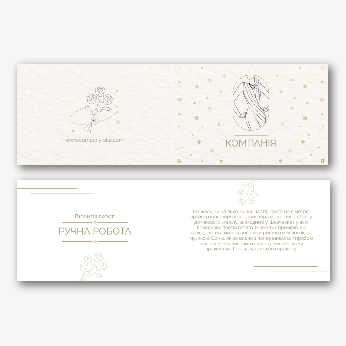 Готовий шаблон бирки-книжки для одягу-це ідеальний інструмент для тих, хто прагне додати індивідуальність і професіоналізм в свою продукцію. Цей шаблон прекрасно підходить для дизайнерів одягу, модельєрів, власників бутиків, а також для всіх, хто займається пошиттям і продажем текстильних виробів. Бирка-книжка являє собою мініатюрний буклет, який може містити інформацію про бренд, інструкції по догляду, склад тканини та інші важливі відомості для клієнтів. У нашому онлайн-конструкторі користувачі можуть створювати унікальні довгі бирки-книжки своїми руками, повністю адаптуючи їх під свої потреби і стиль бренду. В онлайн-конструкторі ви можете змінювати текст, додавати логотипи, вибирати шрифти і їх розмір, а також використовувати різні колірні схеми. Додатково можна вставити фотографії, малюнки та інші графічні елементи, що дозволяє зробити горизонтальну бирку не тільки інформативною, але і візуально привабливою.