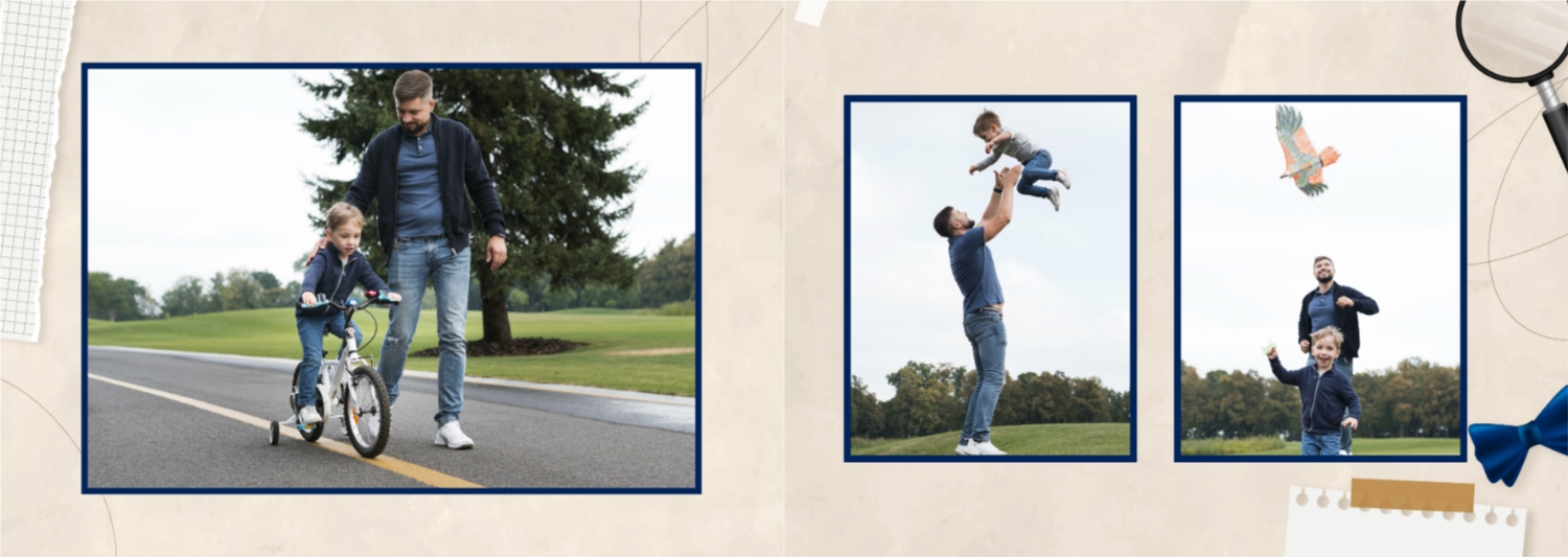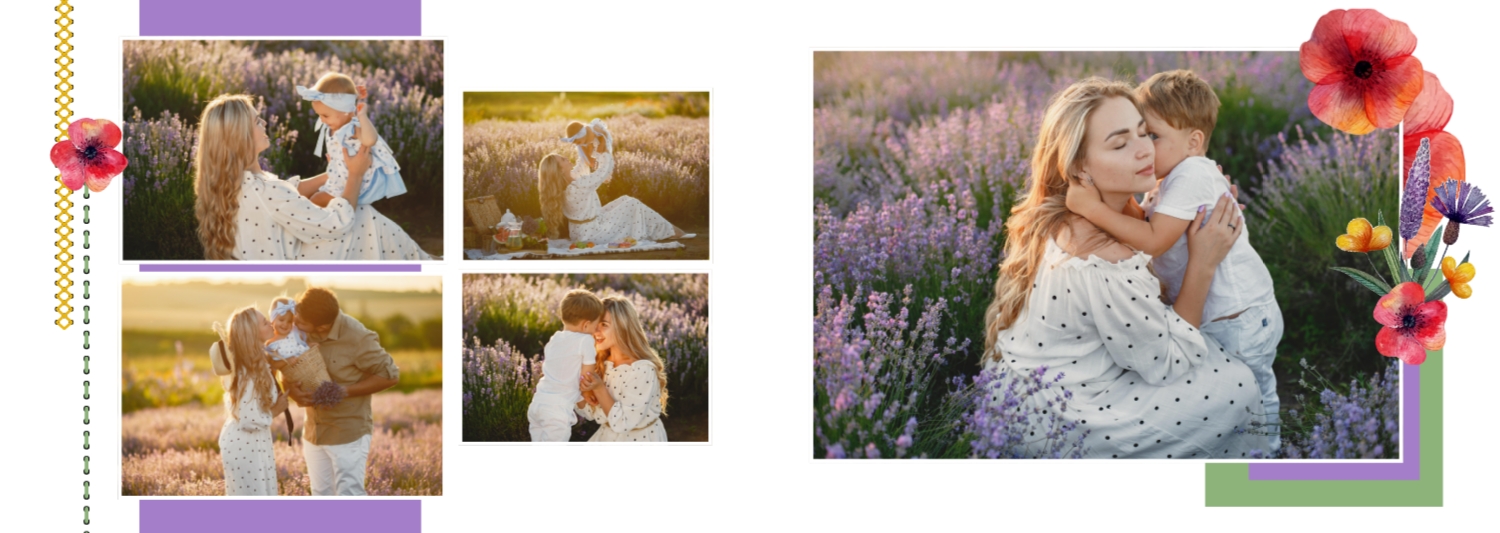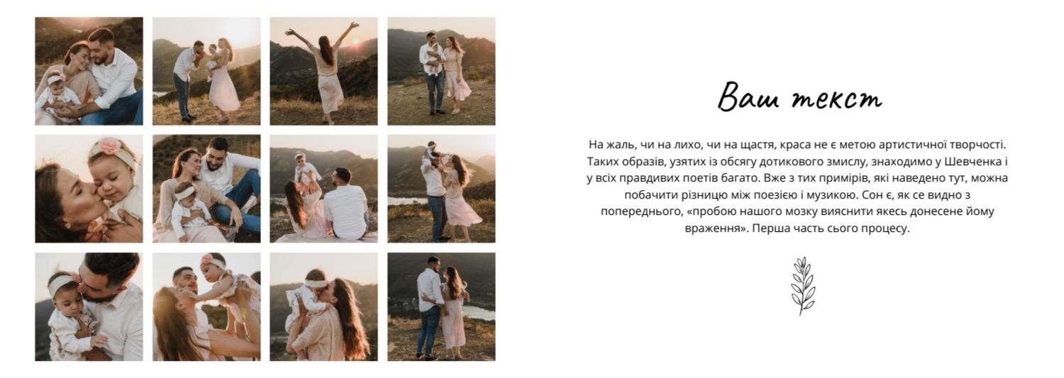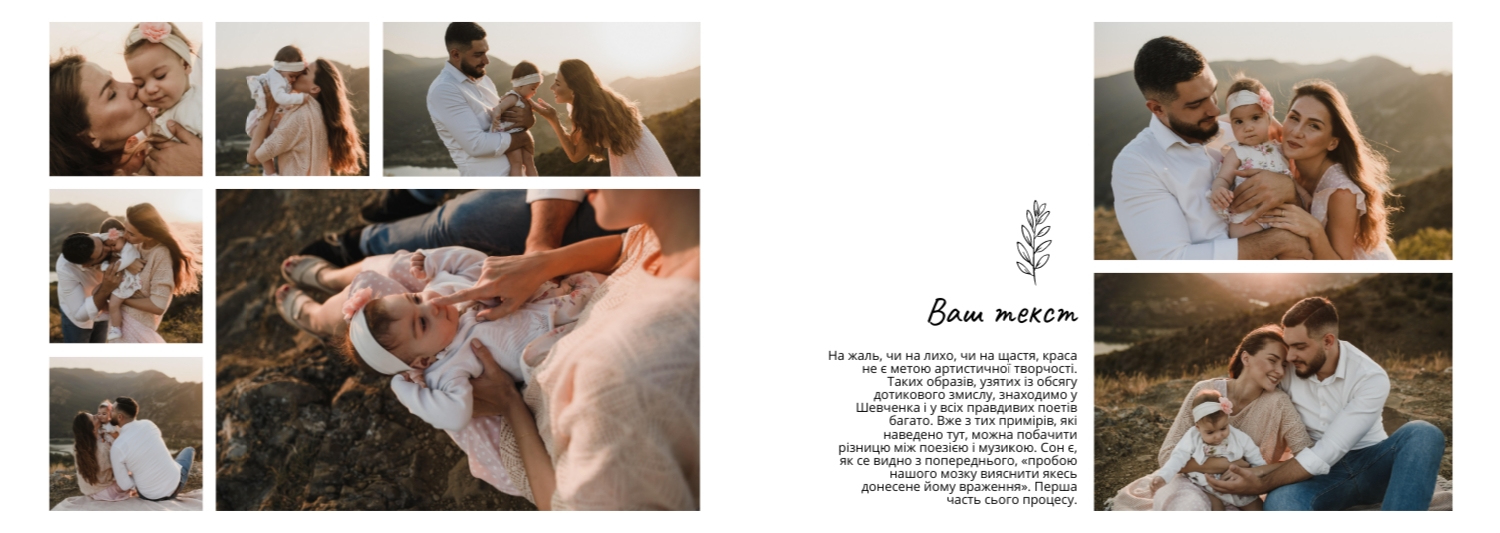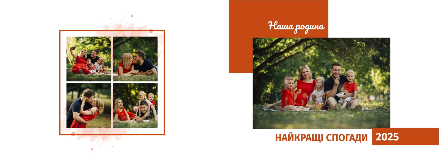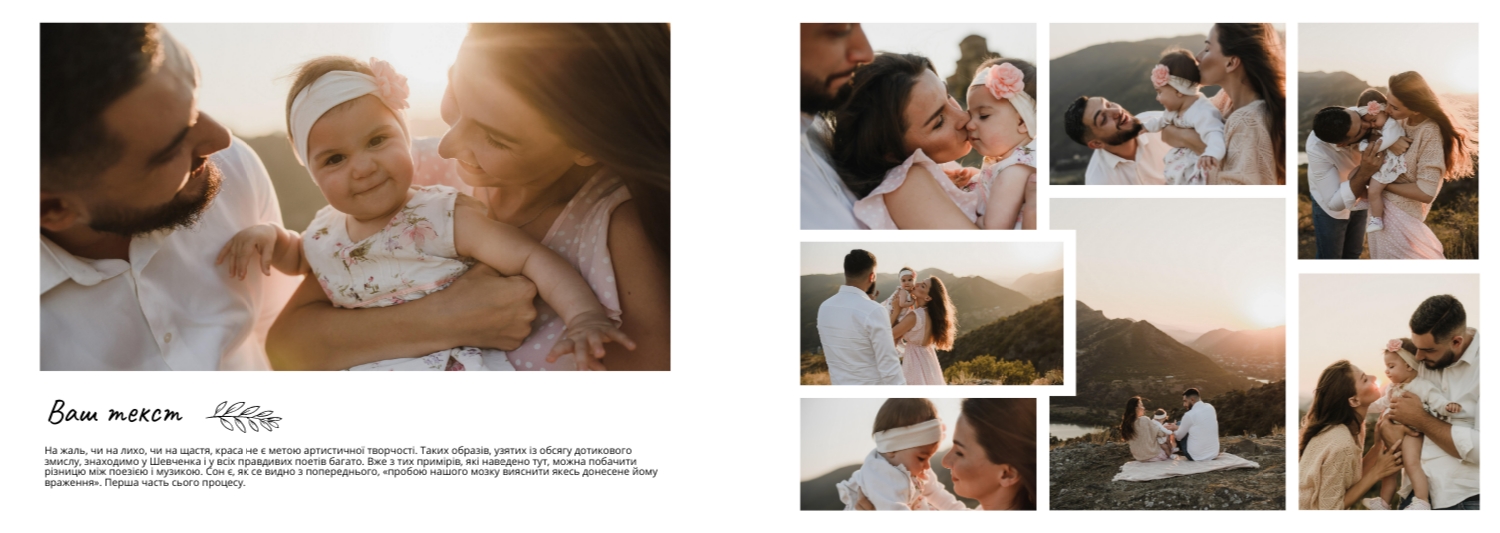 Готовий шаблон сімейної фотокниги в твердій обкладинці-це ідеальне рішення для тих, хто хоче зберегти важливі сімейні моменти в стильному і зручному форматі. Цей шаблон Підходить для широкого кола користувачів, включаючи фотографів, дизайнерів і навіть тих, хто вперше стикається зі створенням фотокниг. Особливу цінність такий горизонтальний шаблон представляє для сімейних фотографів, які часто працюють з клієнтами, які бажають відобразити важливі життєві події — будь то весілля, народження дитини або сімейні свята. Шаблон можна легко адаптувати в нашому онлайн-конструкторі, надаючи користувачам повну свободу творчості. У цьому конструкторі можна змінювати не тільки фотографії, але і текстові блоки, фонові зображення і навіть декоративні елементи. Завдяки простому і інтуїтивно зрозумілому інтерфейсу, кожен може створити унікальну фотокнигу без спеціальних знань в дизайні. Використання нашого шаблону в онлайн-конструкторі дозволяє кожному користувачеві додати свій індивідуальний штрих, створюючи унікальний продукт, який буде зберігати сімейні спогади на довгі роки.
