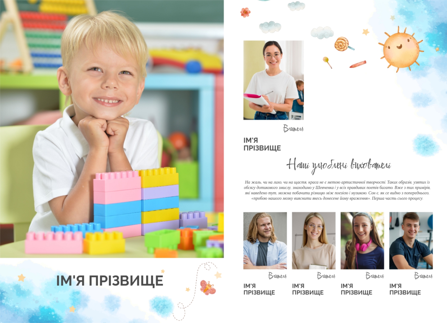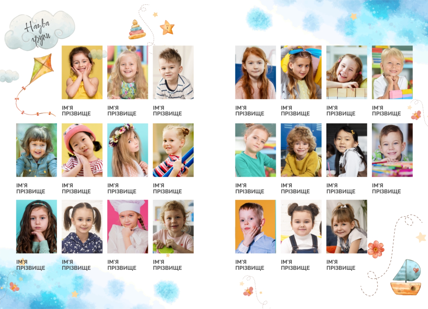 Шаблон випускної фотокниги в твердій обкладинці " Прощай, дитячий сад!"- це ідеальний вибір для створення пам'ятного альбому про перші роки життя в дитячому садку. Він підійде як для батьків, які бажають зберегти найкращі моменти своїх дітей, так і для вихователів і педагогів, які хочуть подарувати вихованцям та їхнім родинам щось особливе на випускний. Фотокнига також буде цікава дитячим фотографам і студіям, які займаються сімейними зйомками, оскільки її можна легко адаптувати під будь-який проект. Особливість цього вертикального шаблону полягає в тому, що він дозволяє кожному користувачеві стати дизайнером своєї власної фотокниги. У нашому онлайн-конструкторі редагувати сторінки-це просто і захоплююче. Ви можете додавати фотографії, змінювати тексти та фони, підбирати кольори та шрифти, щоб фотокнига відображала особистість кожної дитини. У шаблоні передбачені місця для кумедних підписів, описів досягнень і смішних історій, які нагадають про милі і зворушливі моменти дошкільного періоду. Конструктор дозволяє використовувати готовий дизайн як основу, але при цьому вносити будь-які зміни, щоб підкреслити унікальність кожної фотокниги.