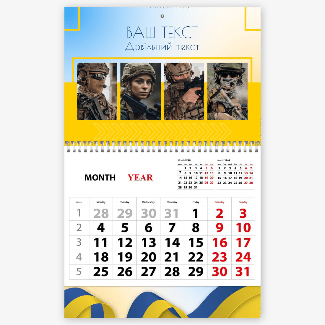 Представляємо унікальний шаблон квартального календаря, натхненного українським стилем та обрамленого неймовірним зображенням Батьківщини-Матері. Цей календар не просто відображає минулі та прийдешні місяці, а й стає справжнім витвором мистецтва, доповненим національними мотивами. Особливістю цього шаблону є його універсальність і можливості індивідуального налаштування. Вам надається широкий спектр інструментів для редагування, що дають змогу втілити в життя свої унікальні ідеї та корпоративні цінності. Ви можете легко додати логотип вашої компанії, корпоративні кольори та текст, який найкращим чином відобразить вашу фірму. Календар розділений на квартали, що забезпечує зручність у плануванні активностей і подій протягом року. Він стане невід'ємною частиною вашого офісу, нагадуючи про важливі терміни та досягнення. Онлайн-редактор дає змогу вам не тільки змінювати текст і додавати зображення, а й експериментувати з різними шрифтами, стилями та кольорами. Вибір необмежений - дайте волю вашій креативності.