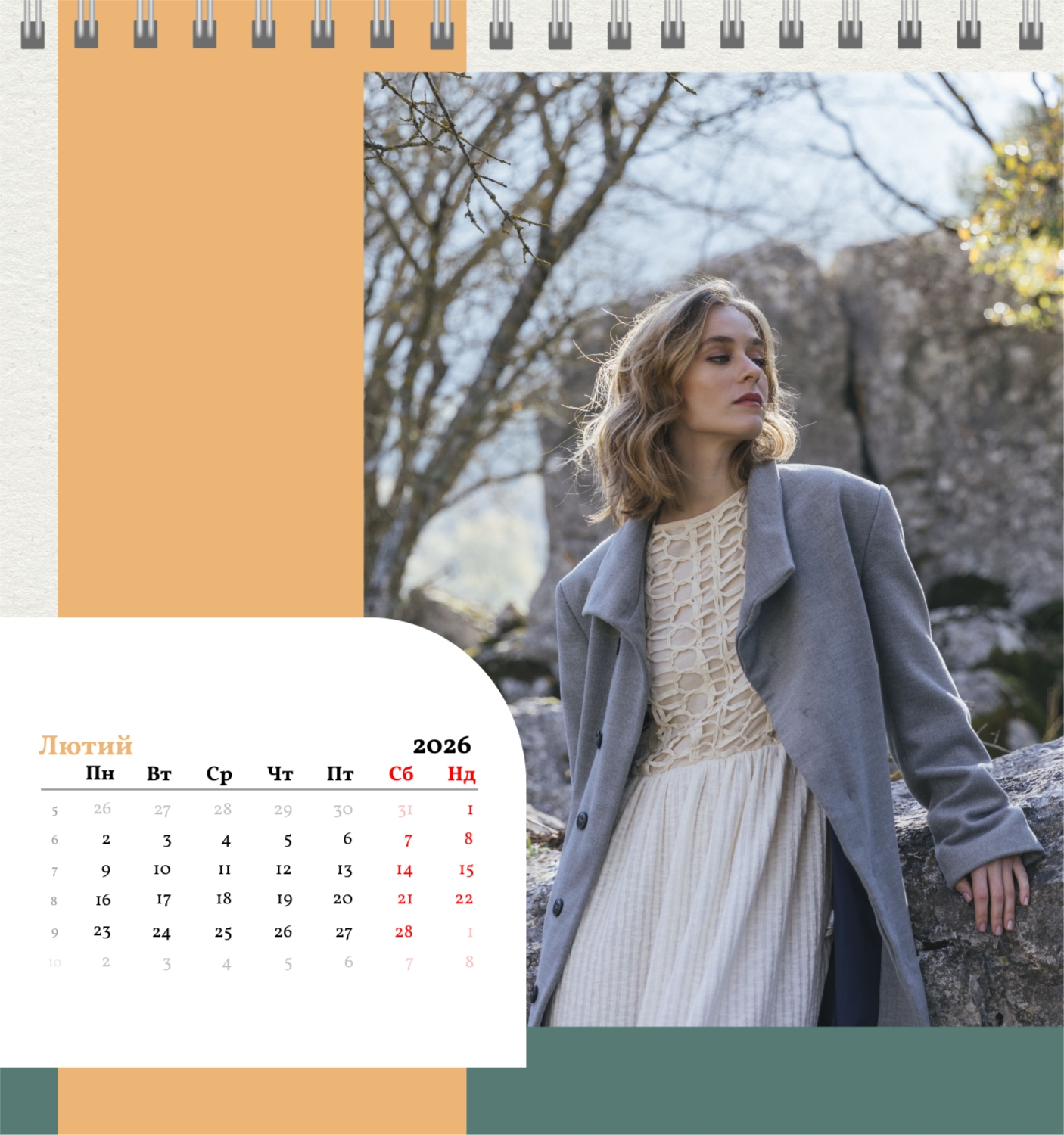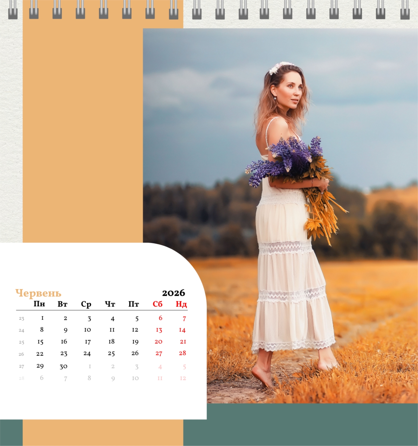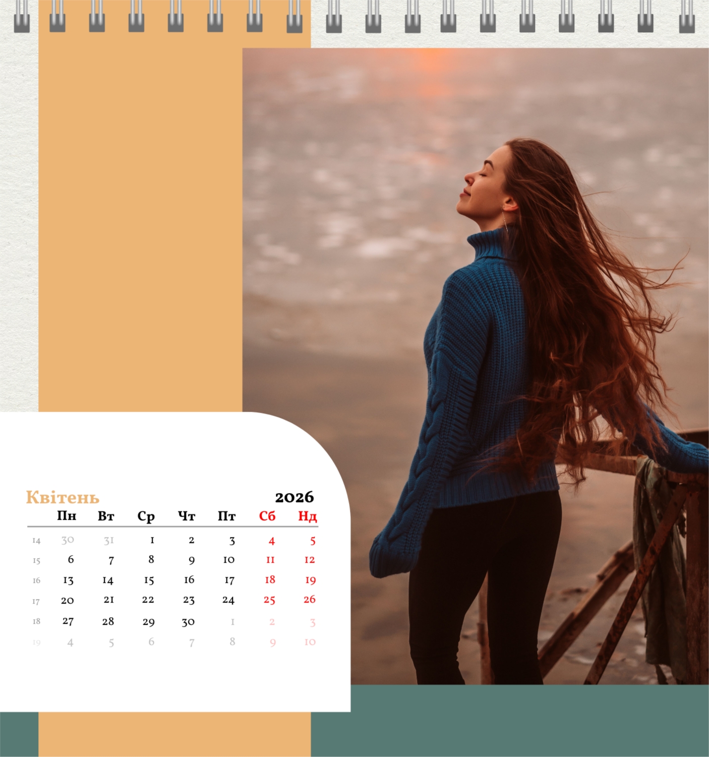 Шаблон" кращі спогади " для настільного вертикального календаря в нашому онлайн-конструкторі надає унікальну можливість створити яскравий і персональний календар, який буде наповнений вашими самими запам'ятовуються моментами. Цей шаблон надає широкі можливості редагування, дозволяючи висловити свою індивідуальність. Ви можете легко додавати та редагувати фотографії, підписи та важливі події для кожного місяця. Використовуйте креативні інструменти, щоб підкреслити особливості кожного місяця та додати додаткові візуальні елементи, які відображають ваші унікальні спогади. Завдяки зручному інтерфейсу конструктора, ви можете легко перетягувати і змінювати елементи дизайну, створюючи календар, який відображає ваш унікальний стиль. Цей шаблон покликаний стати не тільки органайзером вашого часу, а й індивідуальним витвором мистецтва, що відображає кращі моменти Вашого життя. Створюйте свій календар з нами, щоб кожен день був наповнений натхненням і спогадами.